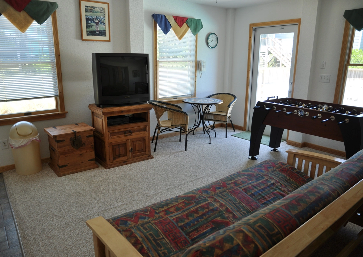 Gameroom (Futon) with foosball and kitchenette; patio, hot tub, and pool.