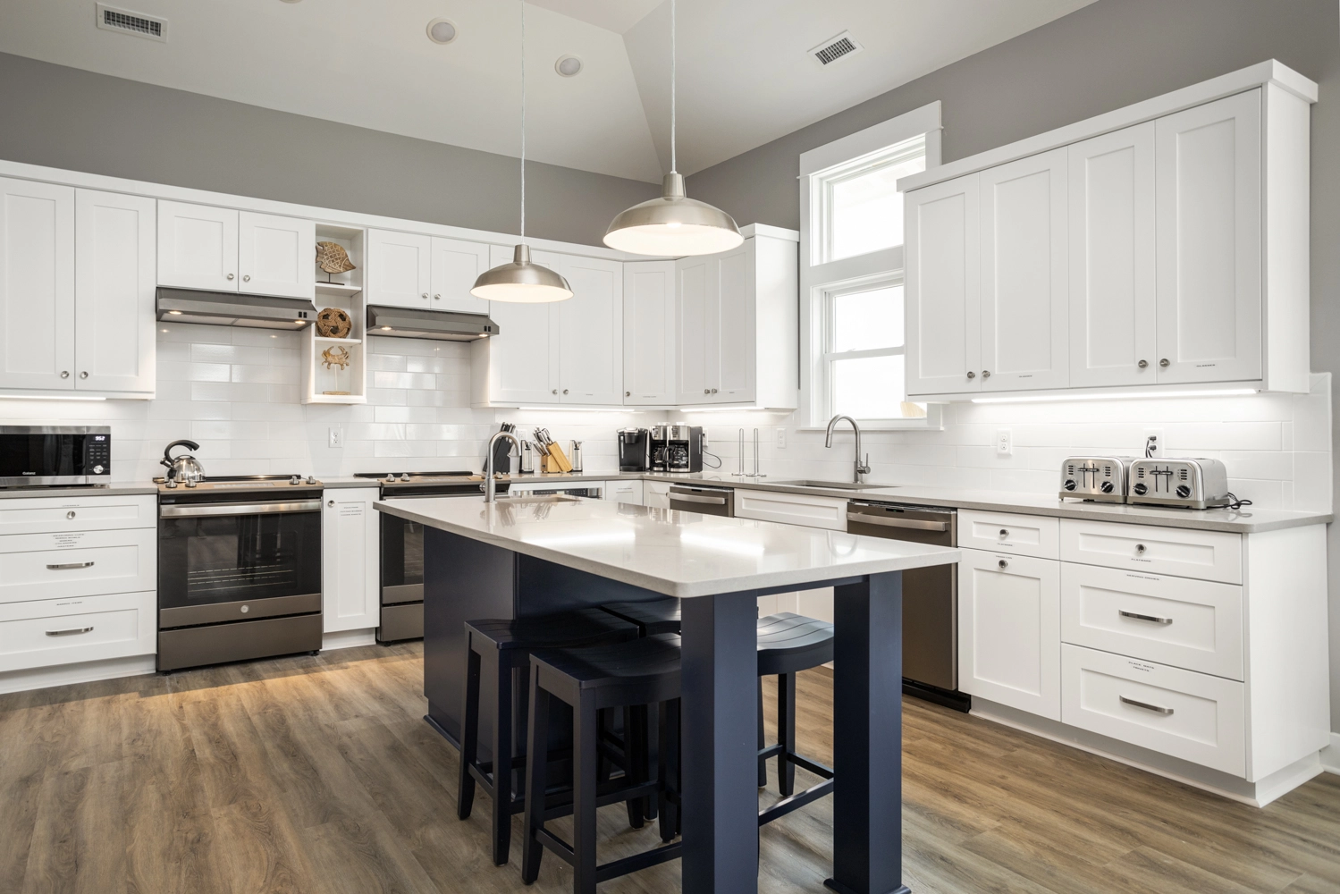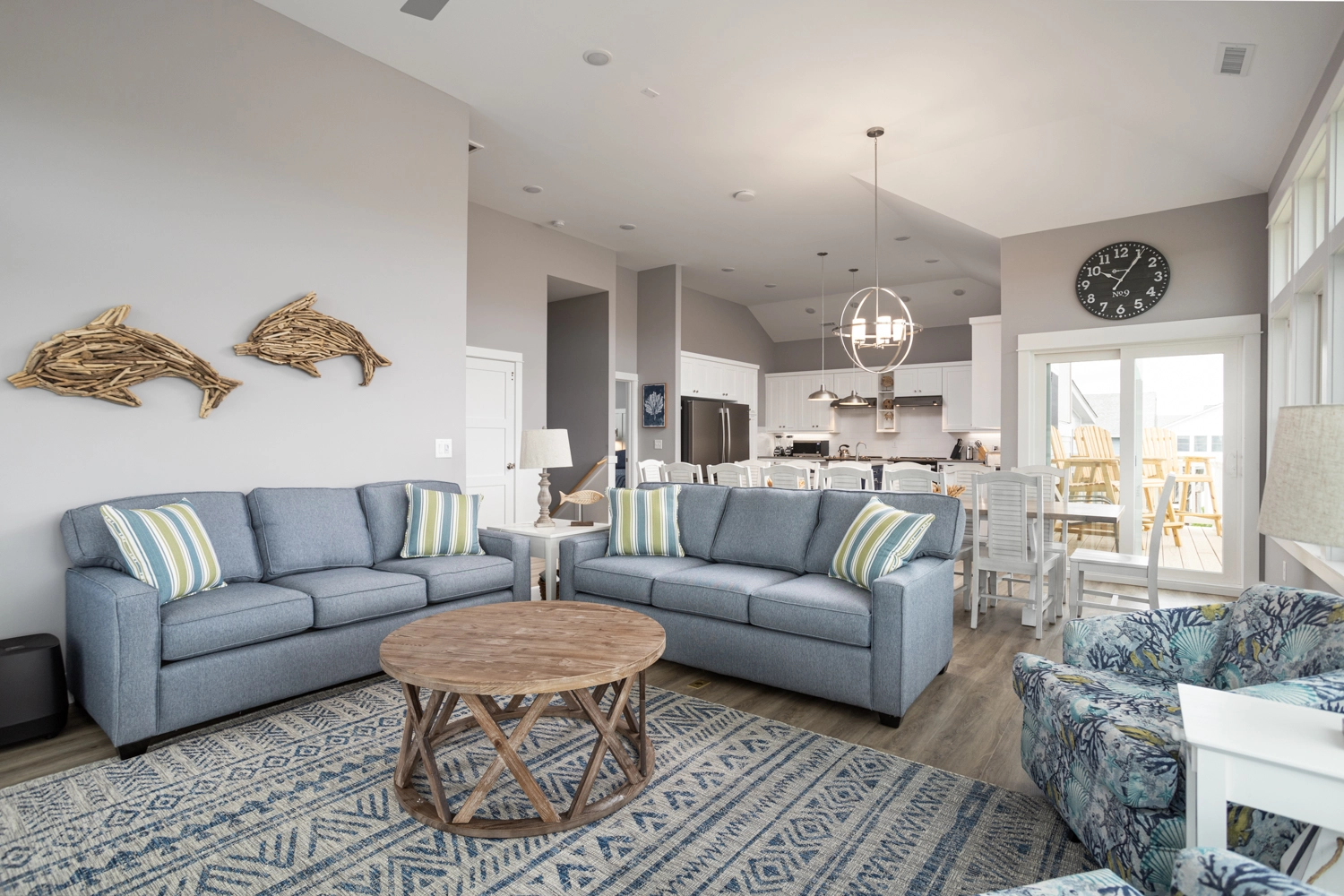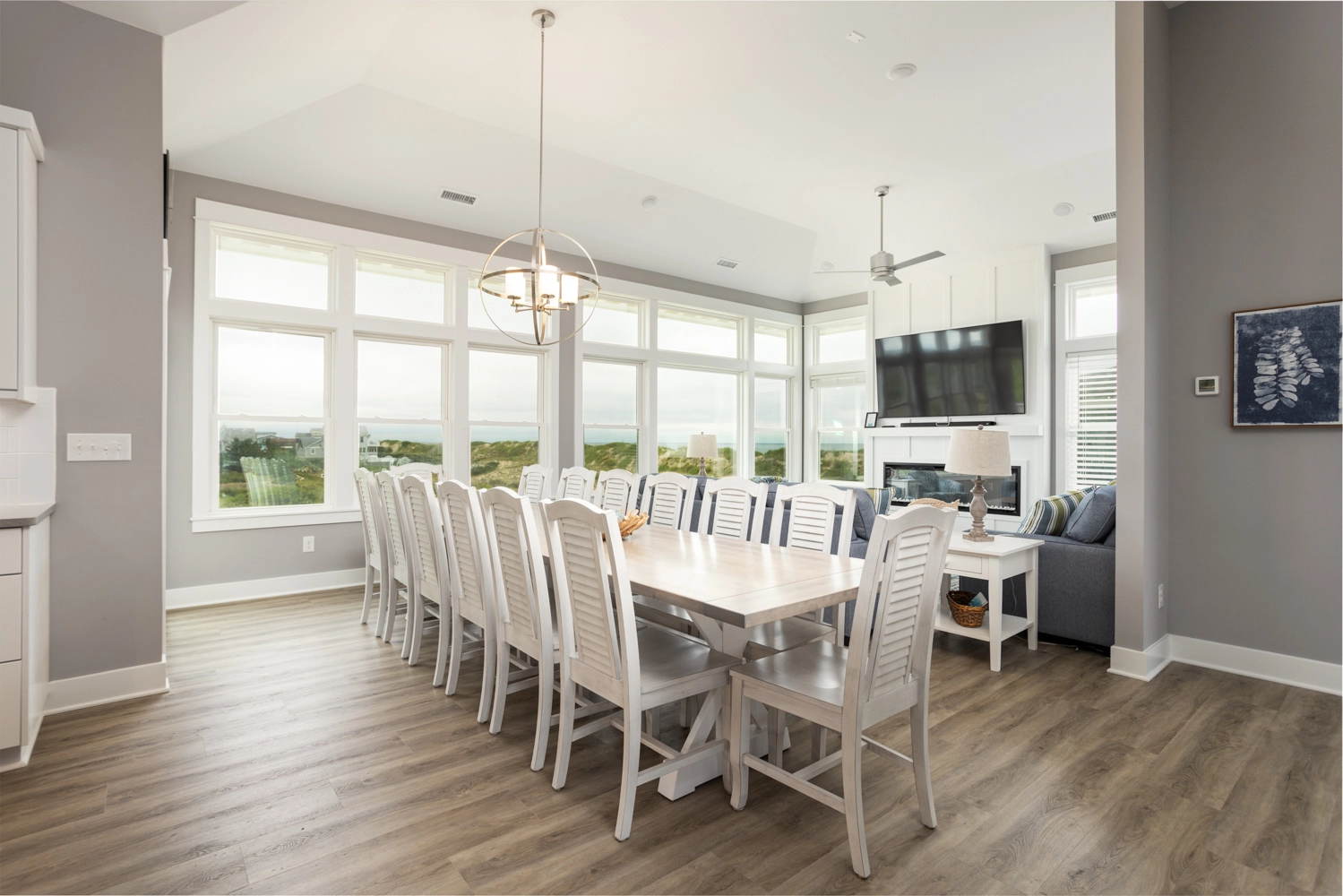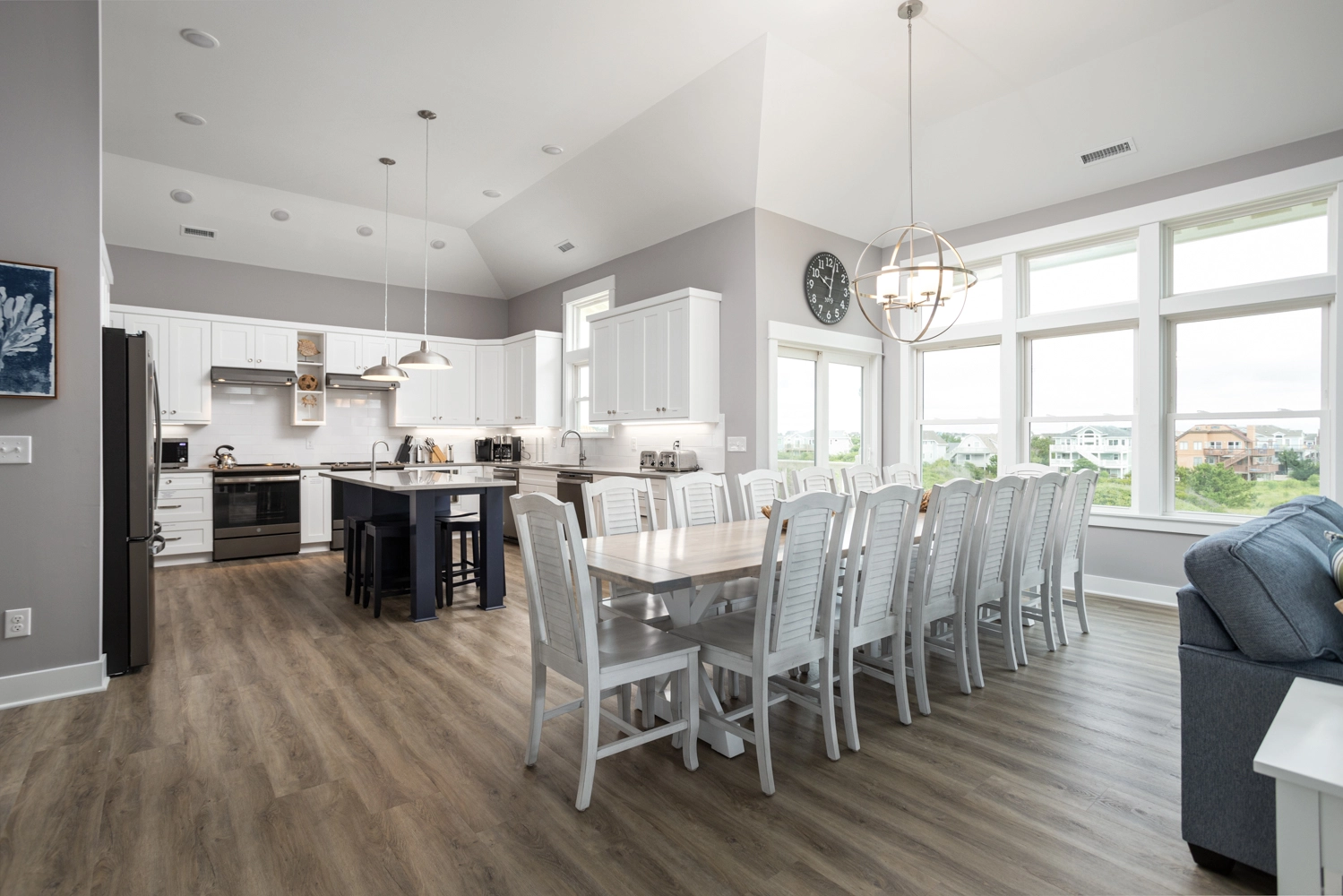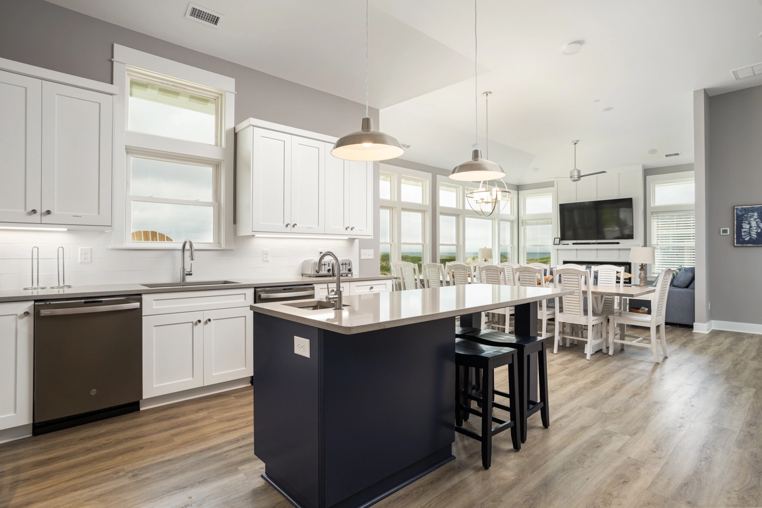 Great room; kitchen with two refrigerators, two sinks, two dishwashers, two microwaves, and two ranges; dining area.