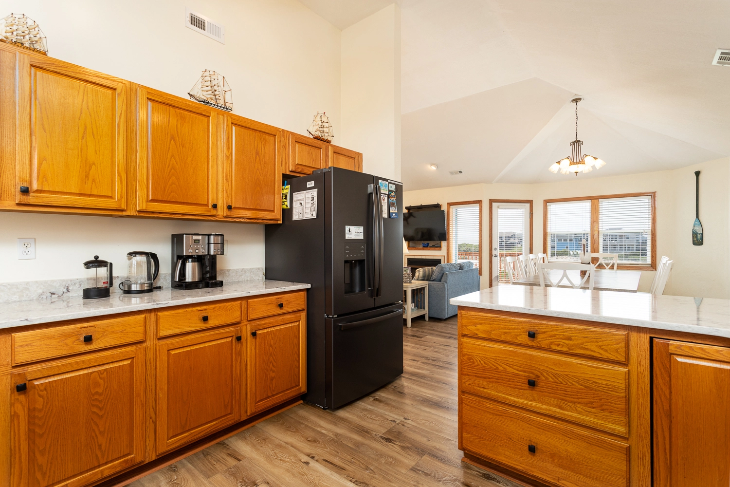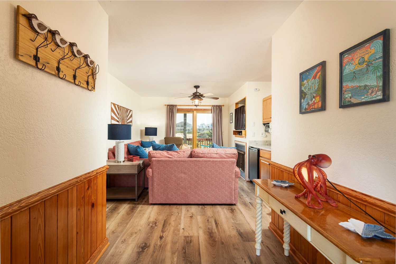Great room with gas fireplace and deck access (QSS); kitchen; dining area.