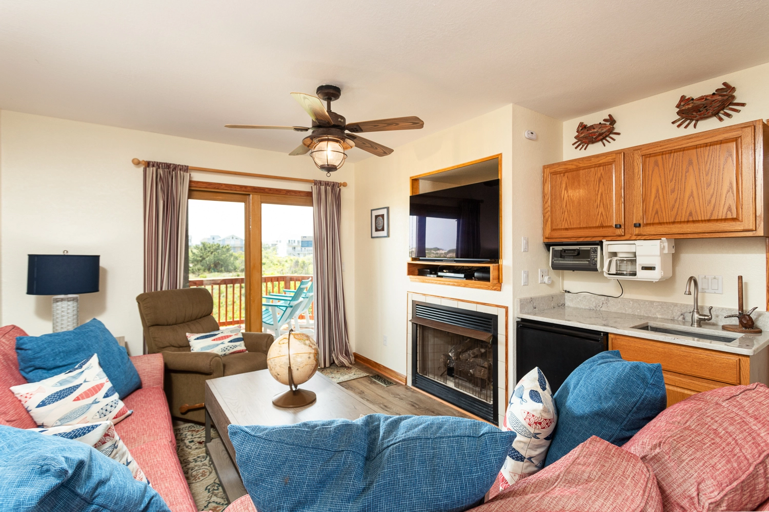 Sitting room (QSS) with gas fireplace, deck access, and wet bar with refrigerator; laundry.