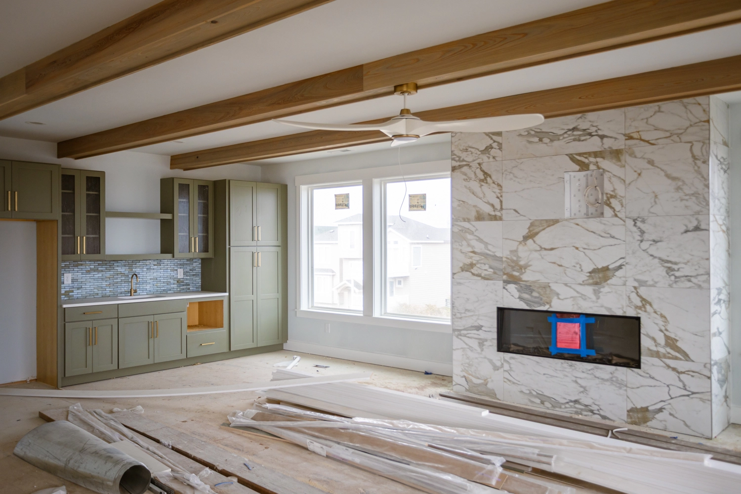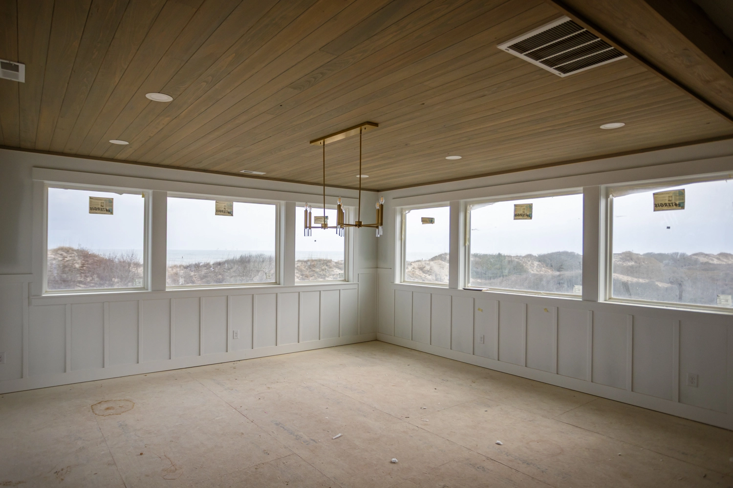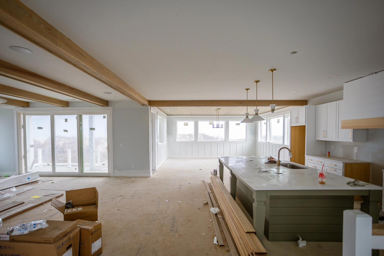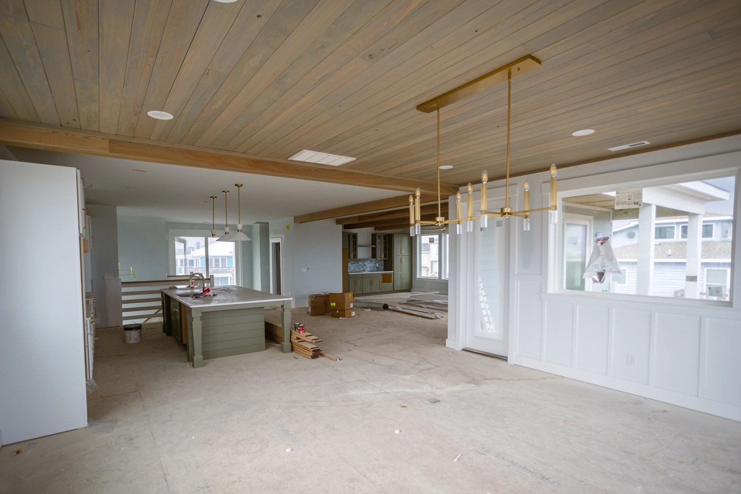 Great room with gas fireplace and wet bar with refrigerator; kitchen with gas stove, and two dishwashers; dining area.