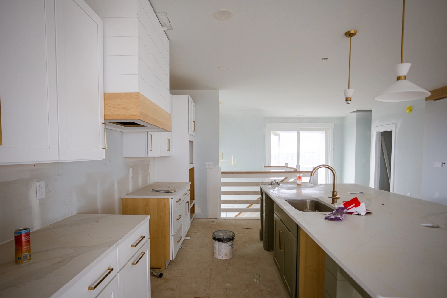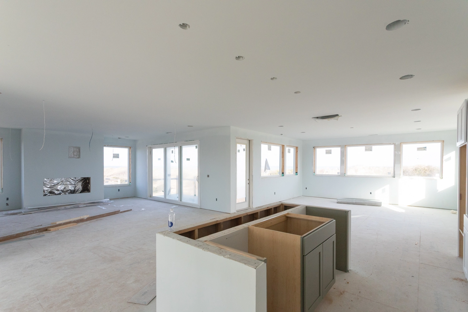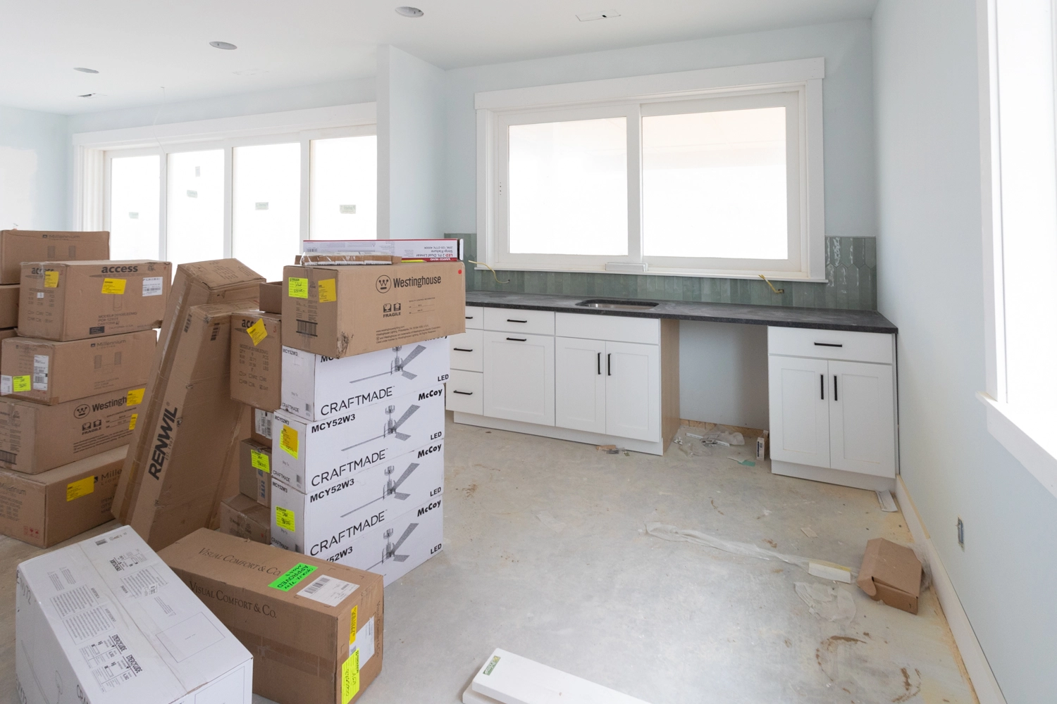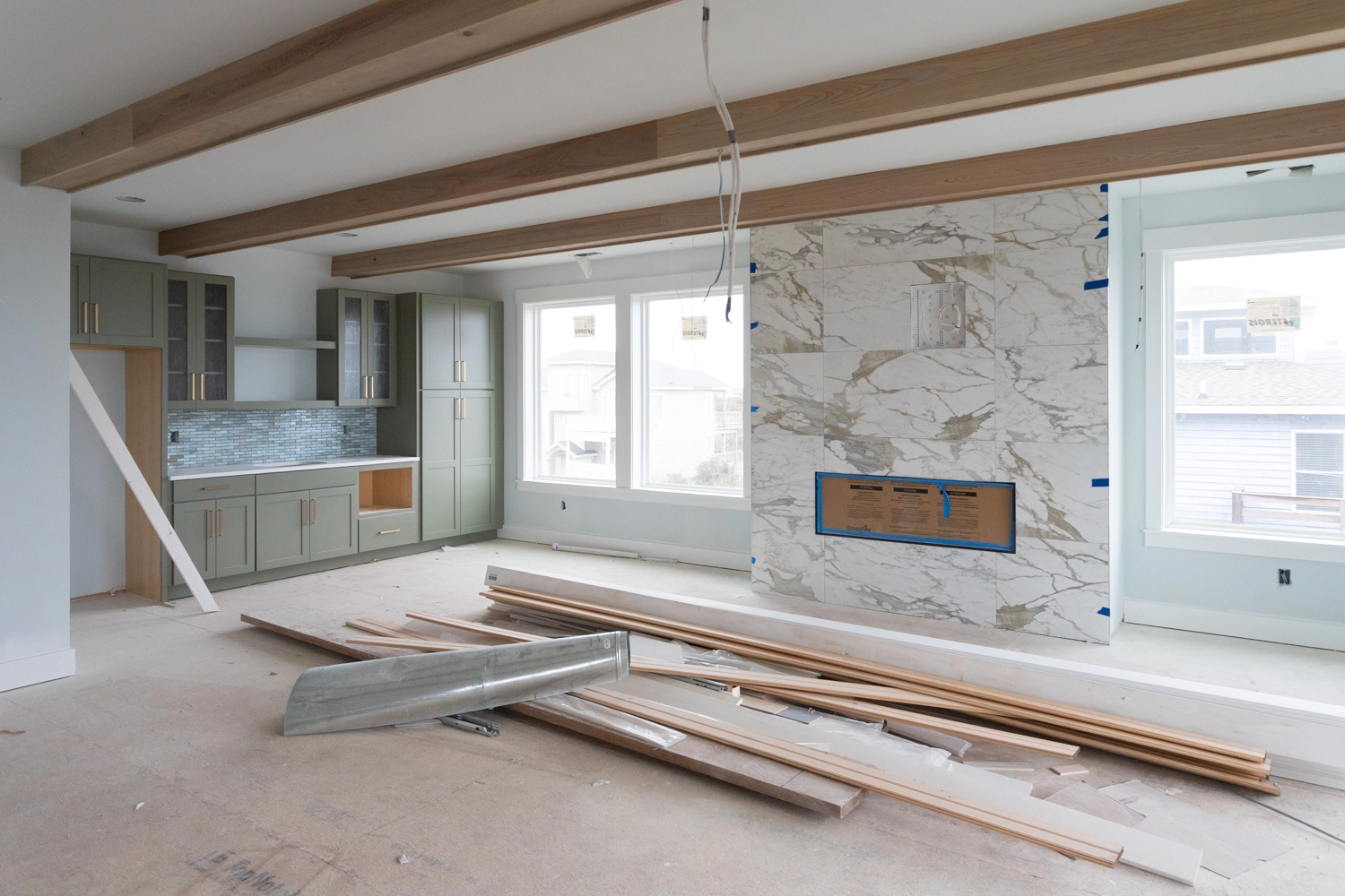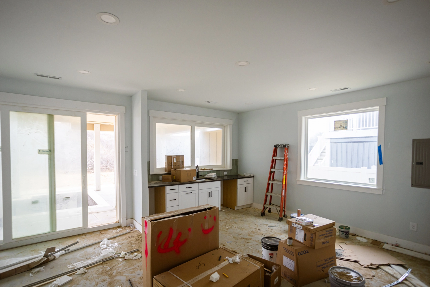Great room with gas fireplace and wet bar with refrigerator; kitchen with gas stove, and two dishwashers; dining area.