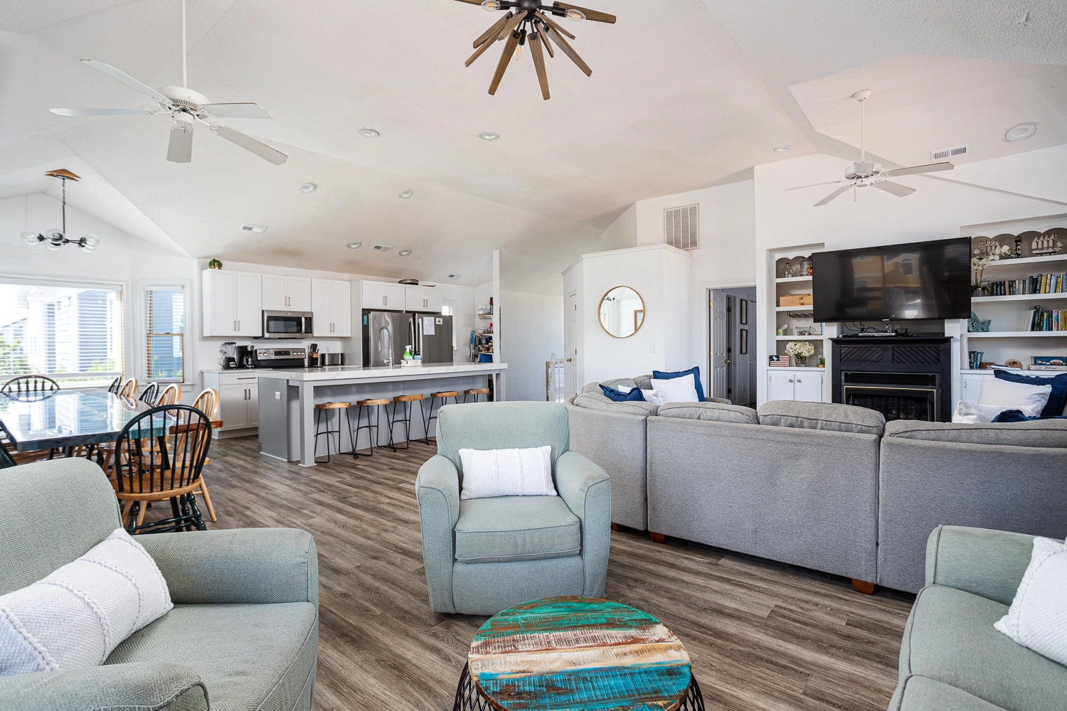 Great room with gas fireplace; kitchen with two refrigerators and two dishwashers; dining area