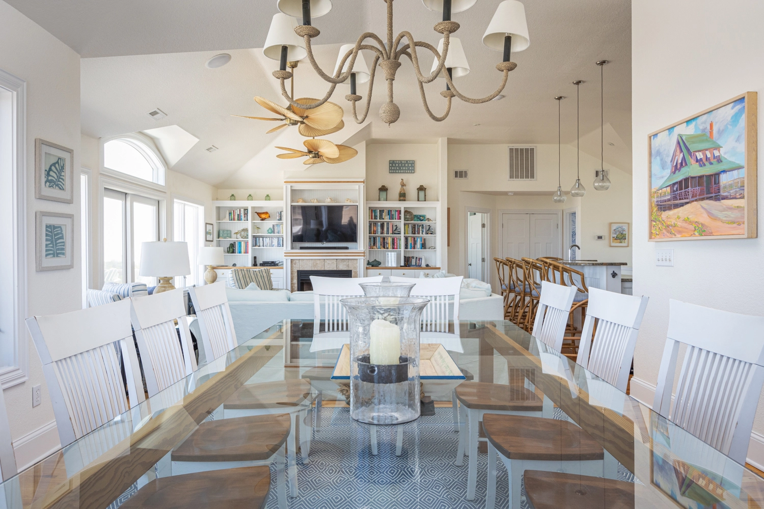 Great room with gas fireplace; kitchen with wine cooler; dining area; screened porch.