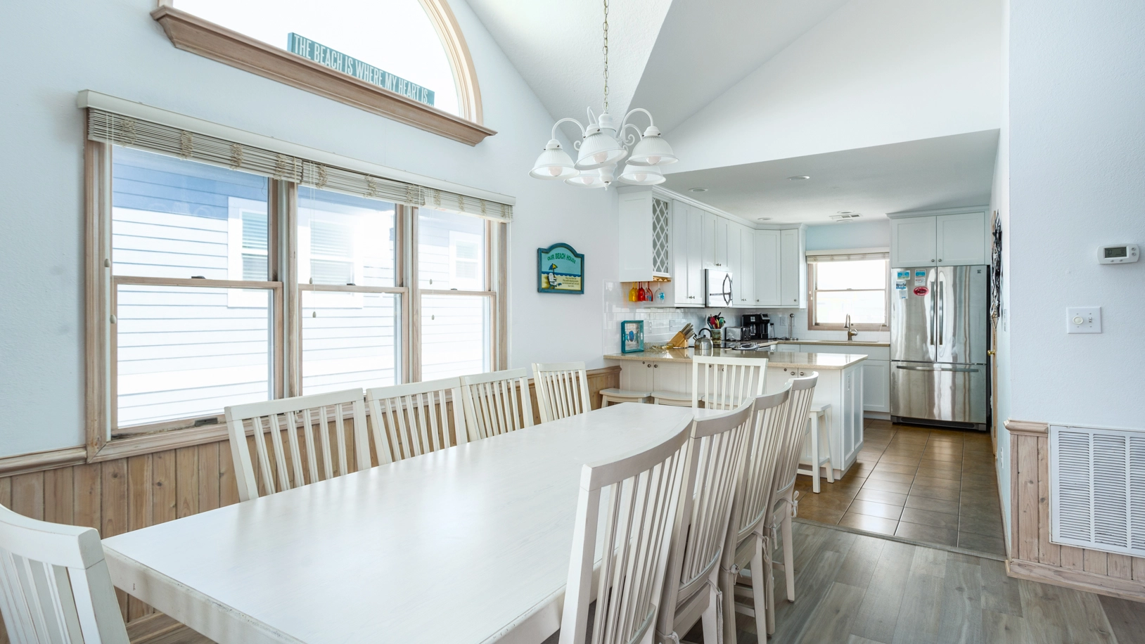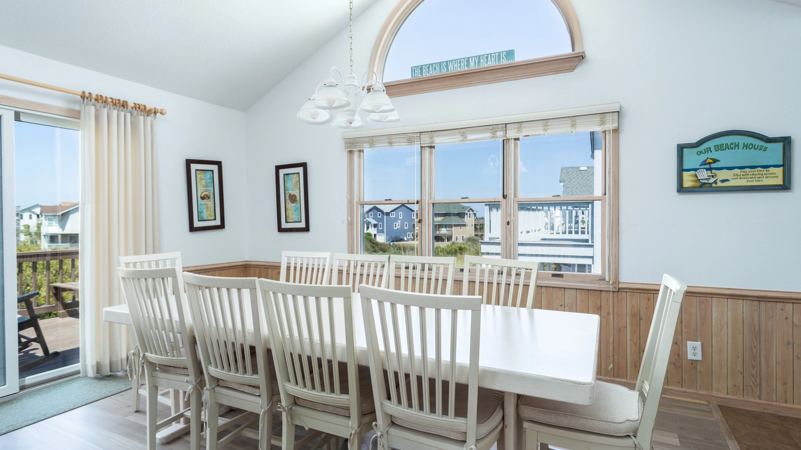 "The setup of the great room is very comfortable. The dining table easily seats ten. Bedding was comfortable. There were some nice beach chairs. We did not need/want a pool, and were, for that reason, glad NOT to pay for it:)"