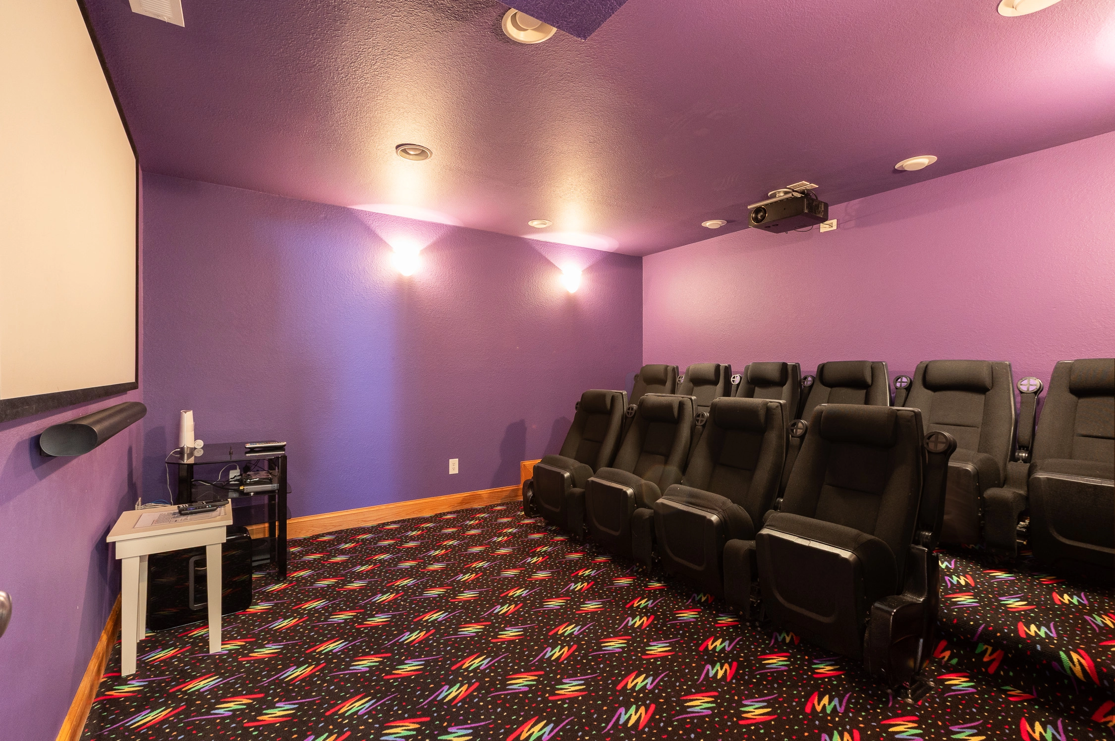 Gameroom with wet bar, refrigerator, microwave, pool table, and arcade game; theater room with stadium seating and large screen projection system with surround sound; pool and hot tub, gas grill.
