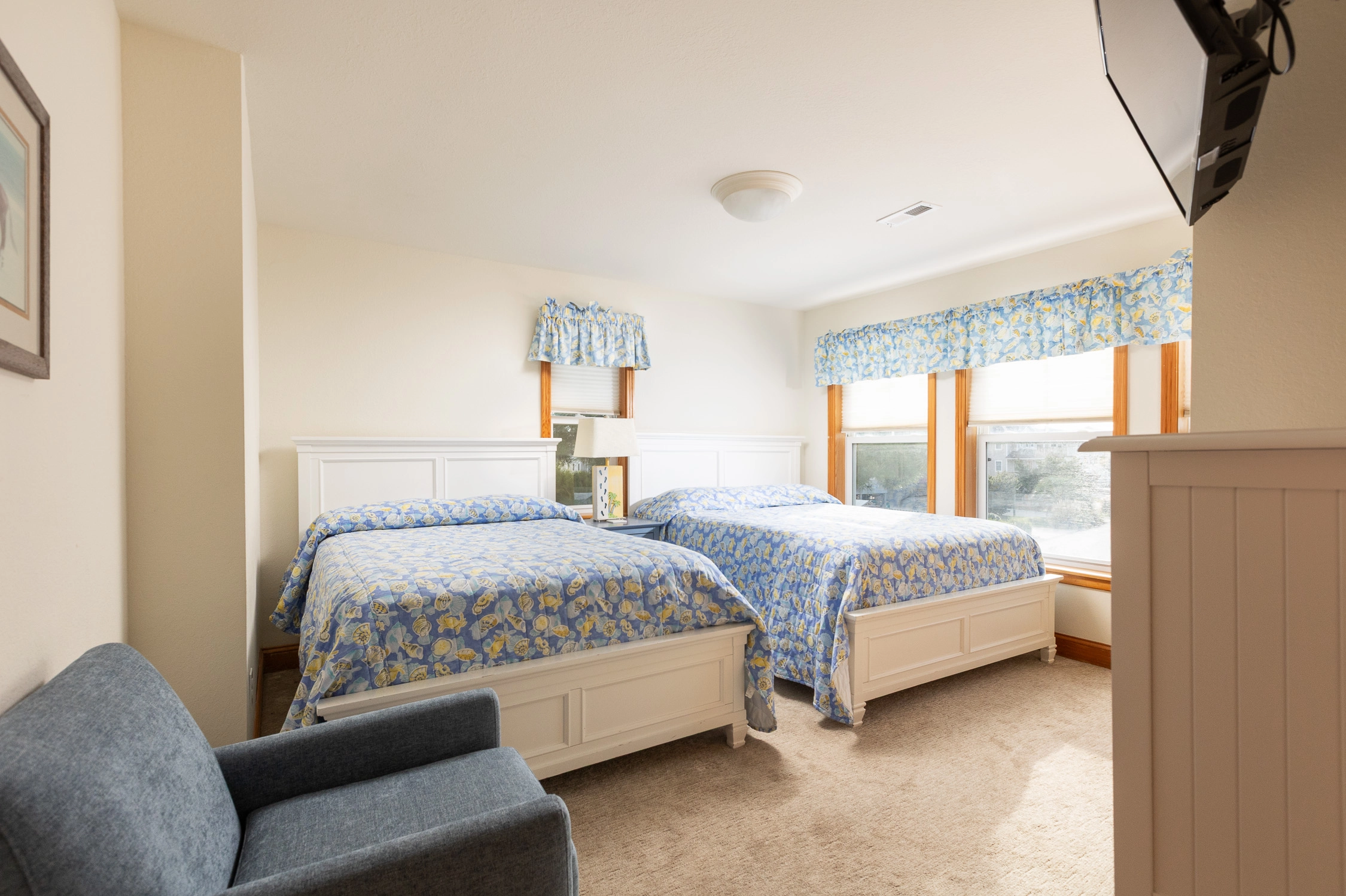 "We stayed here in March 2021. The home was beautiful and the view was amazing! The projector in the theater room when we checked in wouldn’t work, and the repairman Twiddy sent couldn’t fix it either so we couldn’t use it our entire stay which was a huge disappointment since the weather was pretty cold. The instructions for using the rest of the TVs were pretty confusing and we consider ourselves somewhat tech savvy. I also didn’t like being right next to a public walkway to the beach; it took away some privacy. And the lawn crew was in the backyard before 8 am on a Monday morning edging and weed wacking which was loud and annoying. The positives were the beds were comfy, bathrooms were spacious, plenty of room in the house for our 5 kids to spread out, arcade game was fun, kitchen was amazing, and the elevator was a nice convenience."