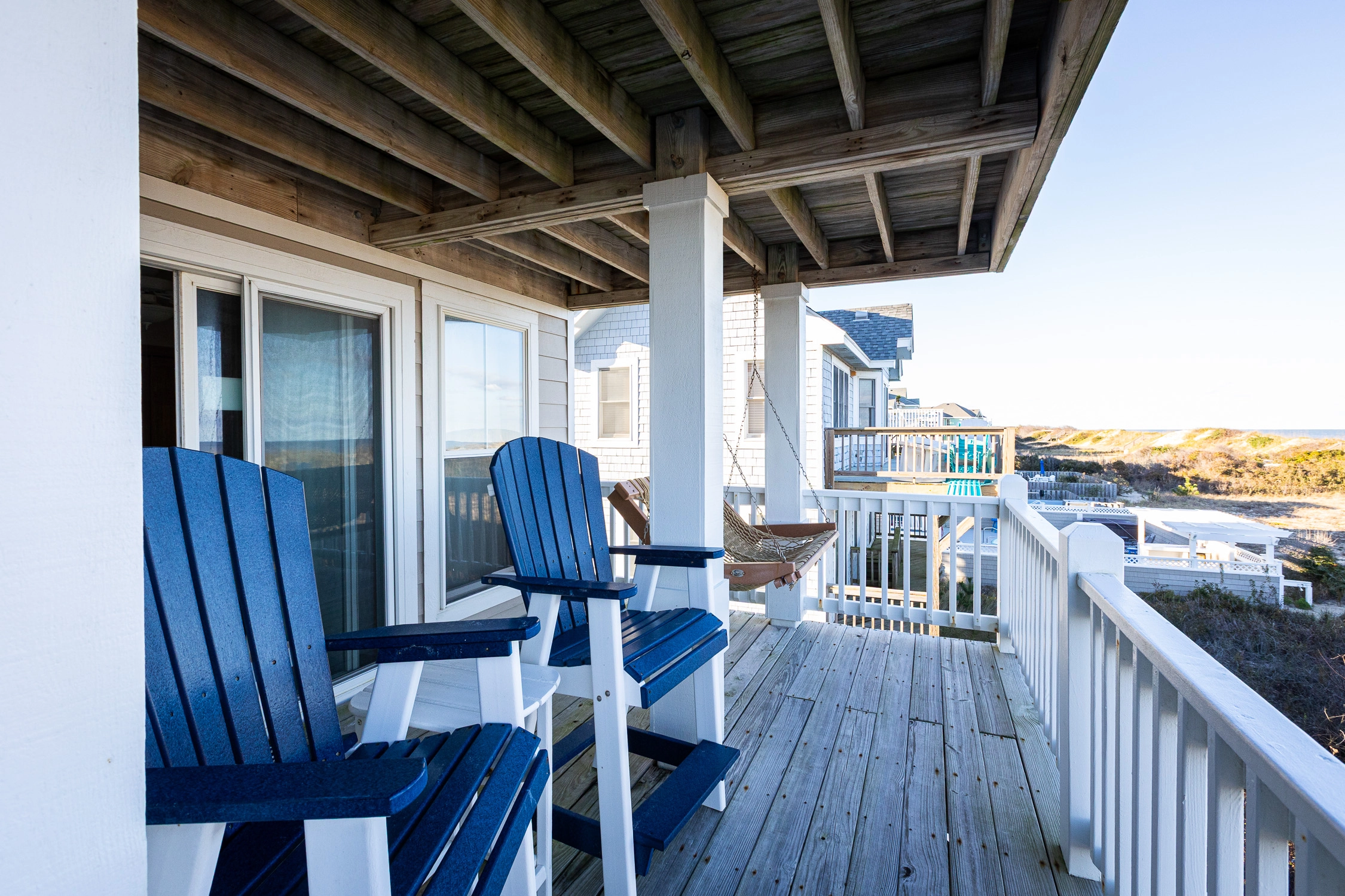 "We had a wonderful vacation at the Windswept. The location could not have been better and beach access was very convenient. Just walk out the back gate to the beach access. Kitchen was large and very well equipped. Bathrooms were also well maintained and the layout of the home was perfect. Beds were comfortable and Twiddy could not have been a better company to rent from. Responsive and very quick with any maintenance needs. There were a couple of suggestions we would like to make as a large party of 4 families. We felt like the water pressure could have been better- 2 people could not shower at the same time. Outside area was well maintained, but with 4 families using the foot wash at the gate it got muddy. We would like to suggest paving that area. It would also be nice to move the hot tub out from under the house- while the shade is great, that space would have been better used as a tiki bar or outdoor kitchen. The outside chairs could also use a good power wash or replacement. Last but not least- the upstairs couch is is need of an update- cushions either need to be re-stuffed or replaced. Overall- a wonderful vacation- we look forward to visiting again and enjoying the amazing views."