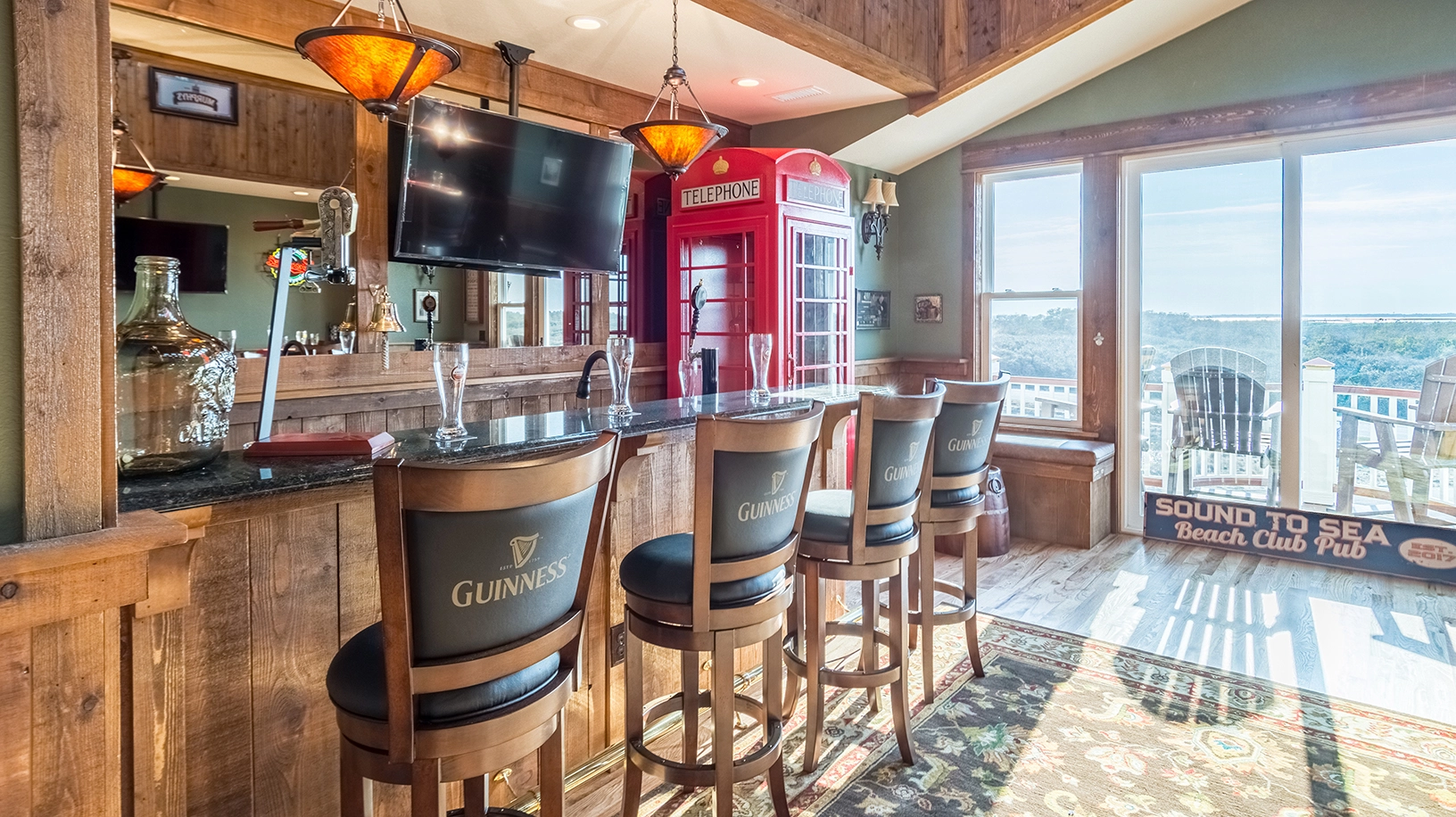 "Lazy river, sports bar, English pub, beach access."