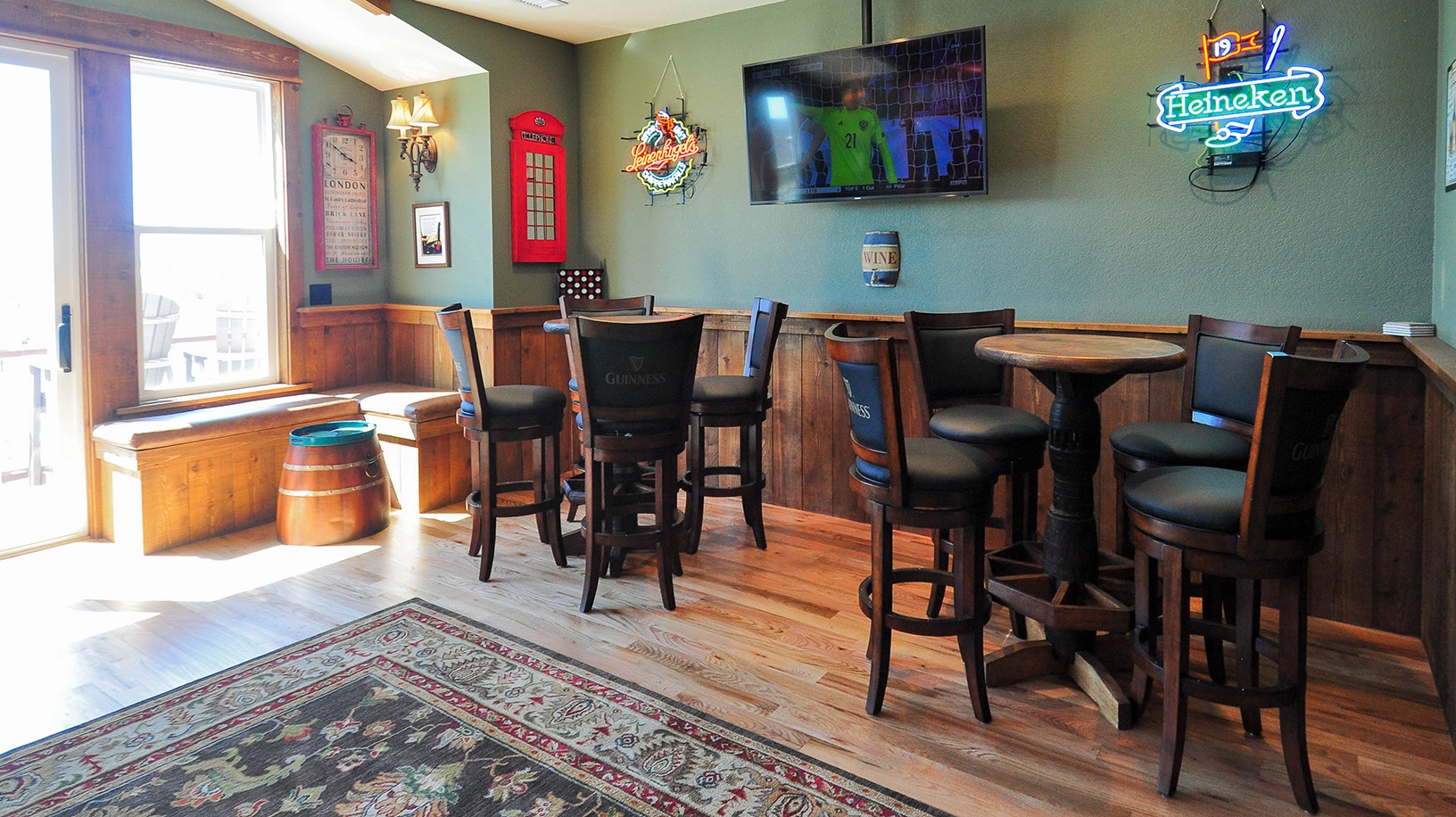 Great room with cupola and gas fireplace; separate chef's kitchen; custom kitchen; dining area; olde Irish style pub with cupola.
