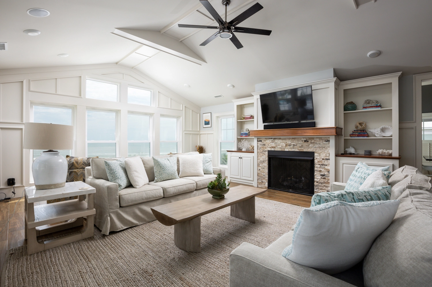 Great room with gas fireplace; kitchen; dining area; sunset lounge with bar; screened porch.
