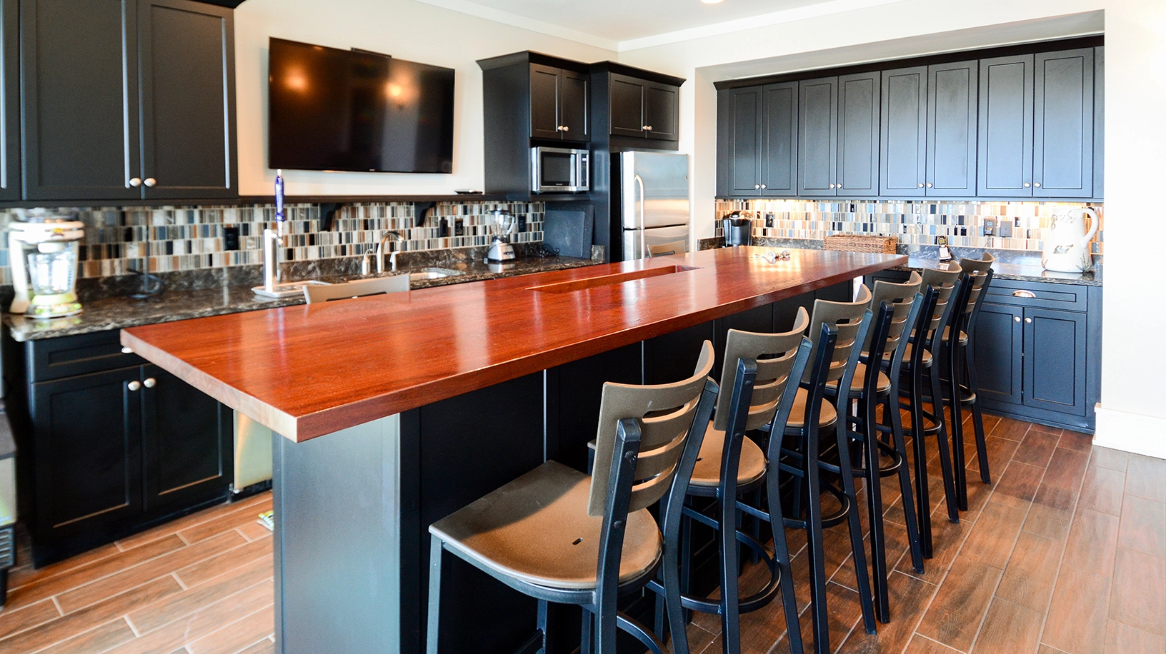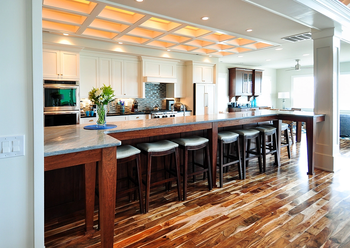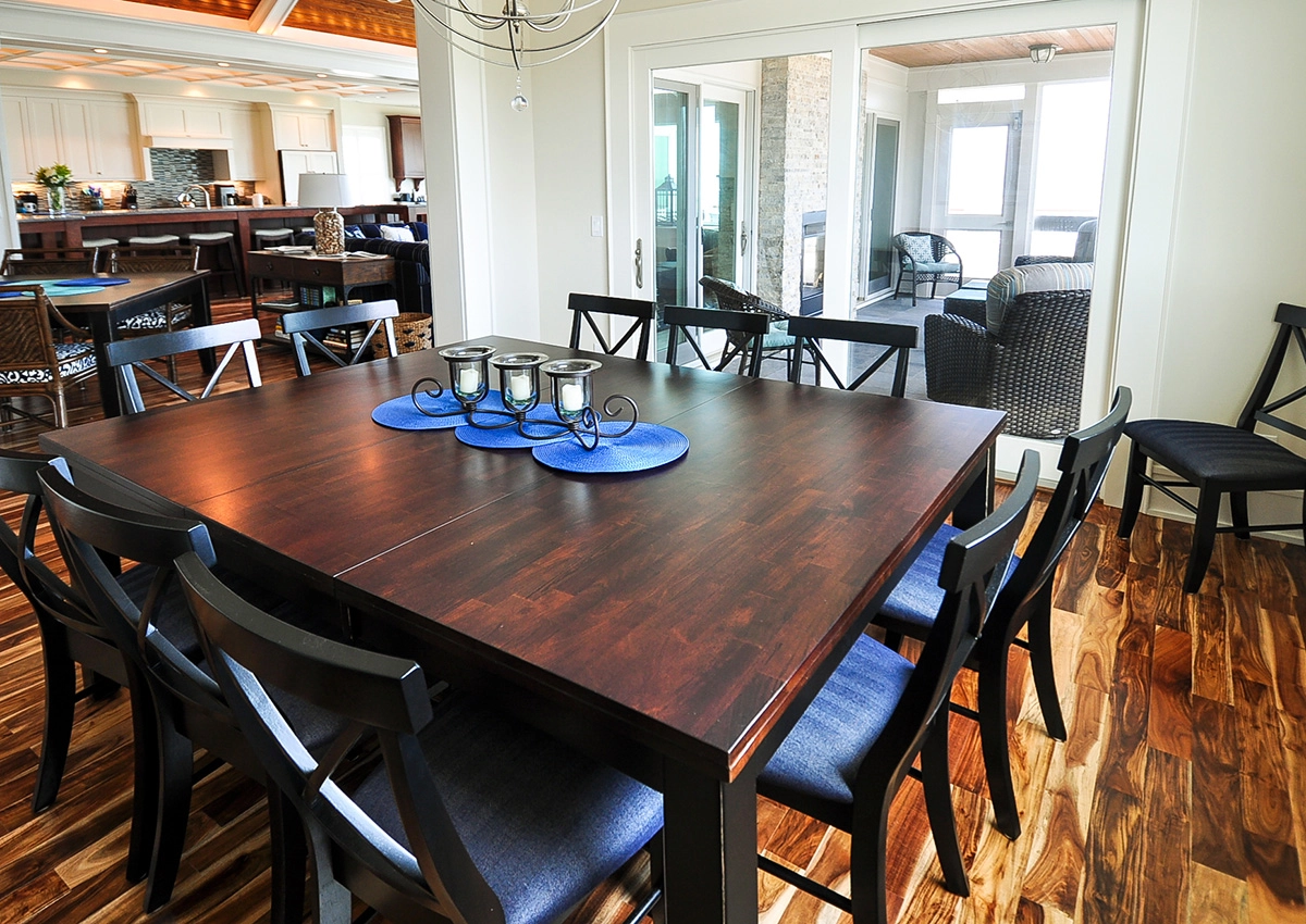 Great room; kitchen with a central island, gas stove, two dishwashers, double ovens, two refrigerators, and wine cooler; dining area; screened porch.