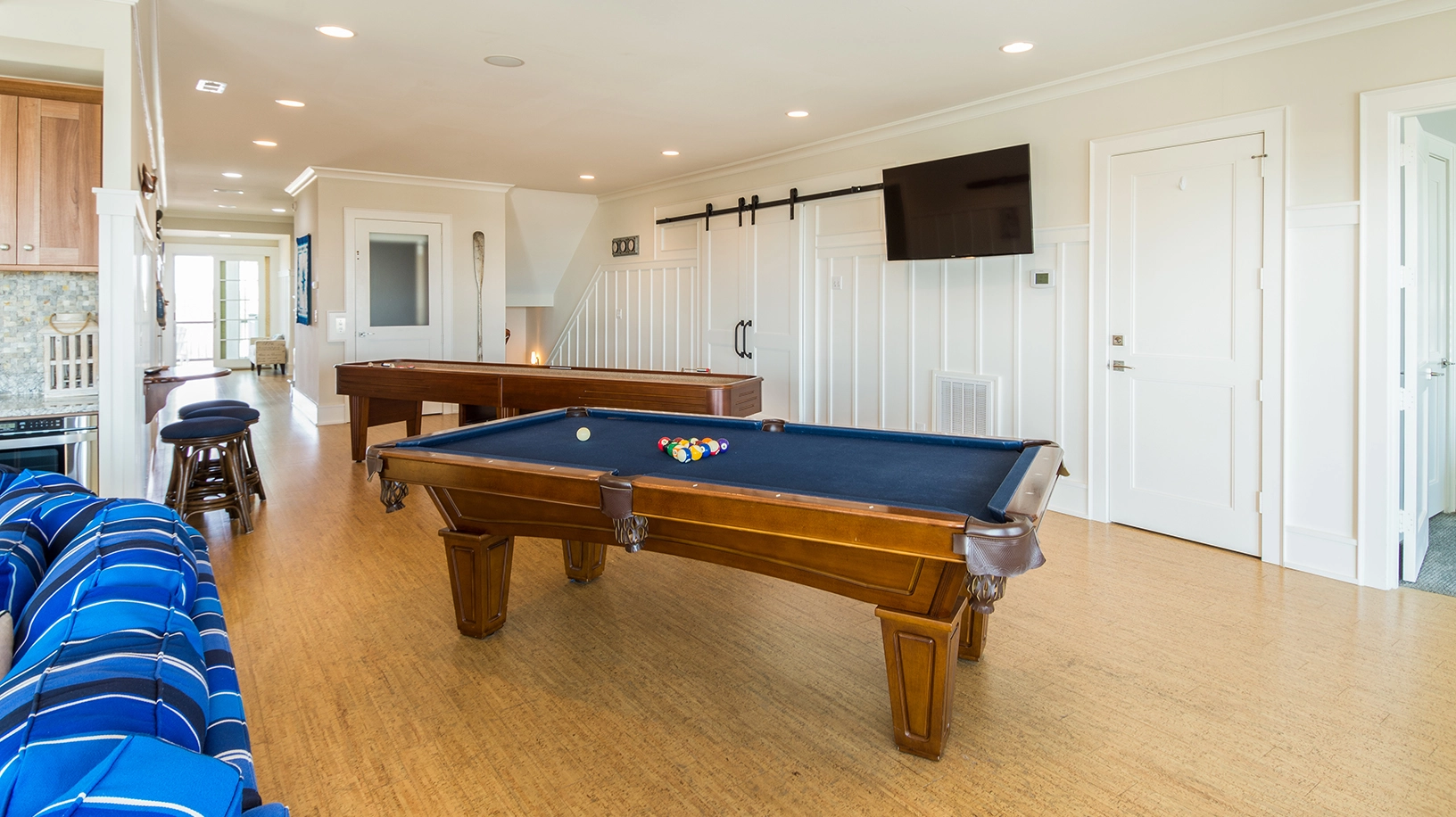 Rec room with pool table, shuffleboard table, and kitchenette; theater room; large sitting area as well as a smaller, more private sitting area; laundry.