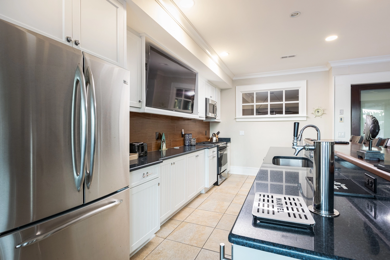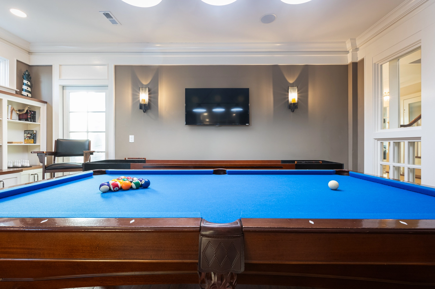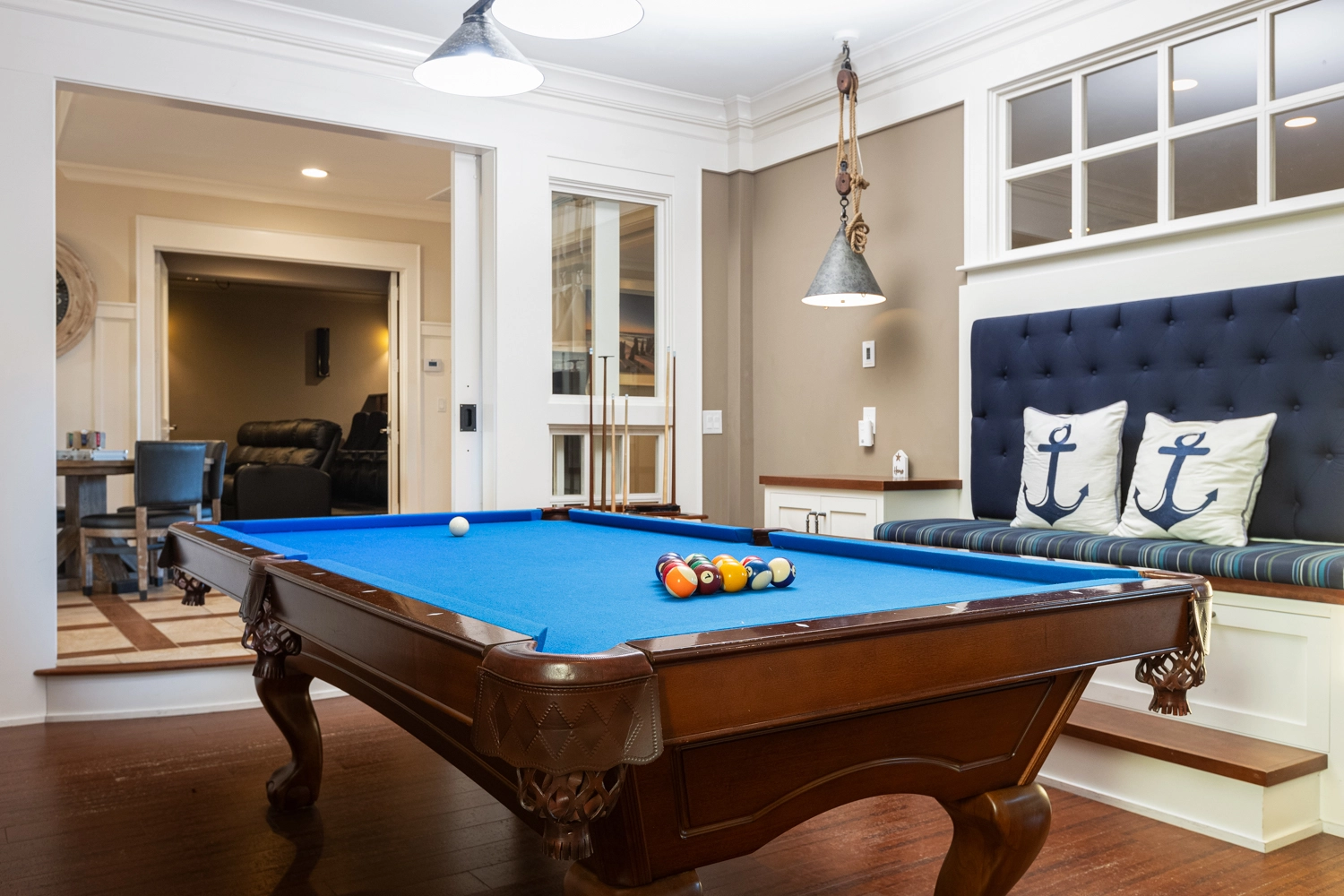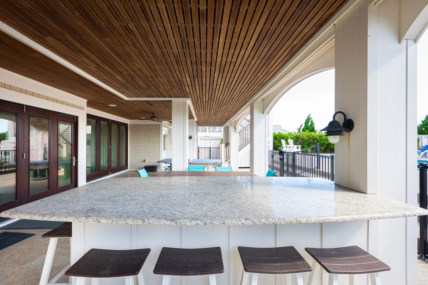 Kitchen; covered outdoor sitting area with sports bar and additional kitchen; rec room with gas fireplace, pool table and shuffleboard; theater room with golf simulator (golf clubs not provided); kid's Wii room; laundry.