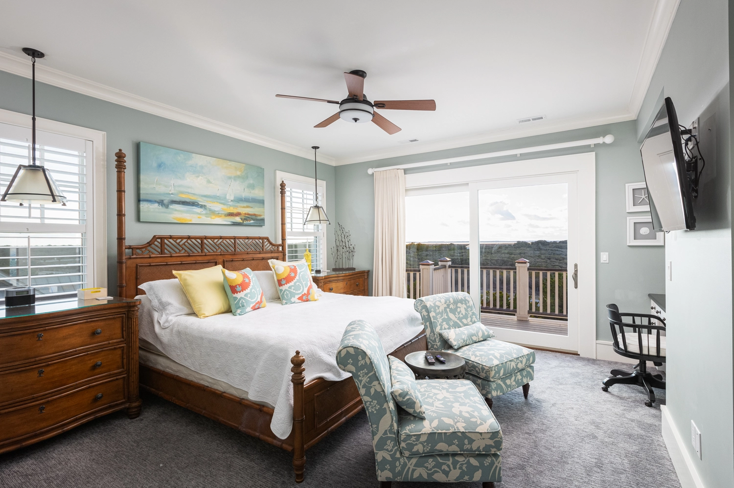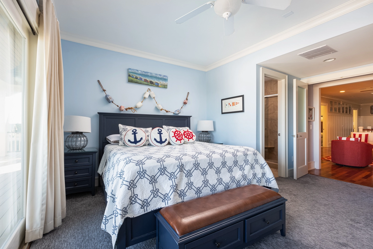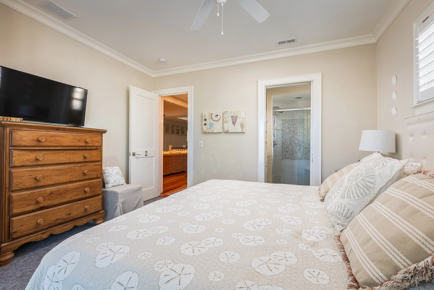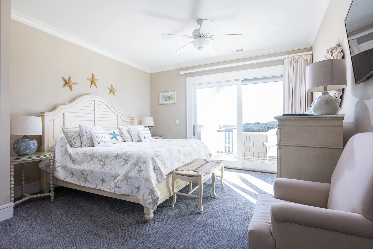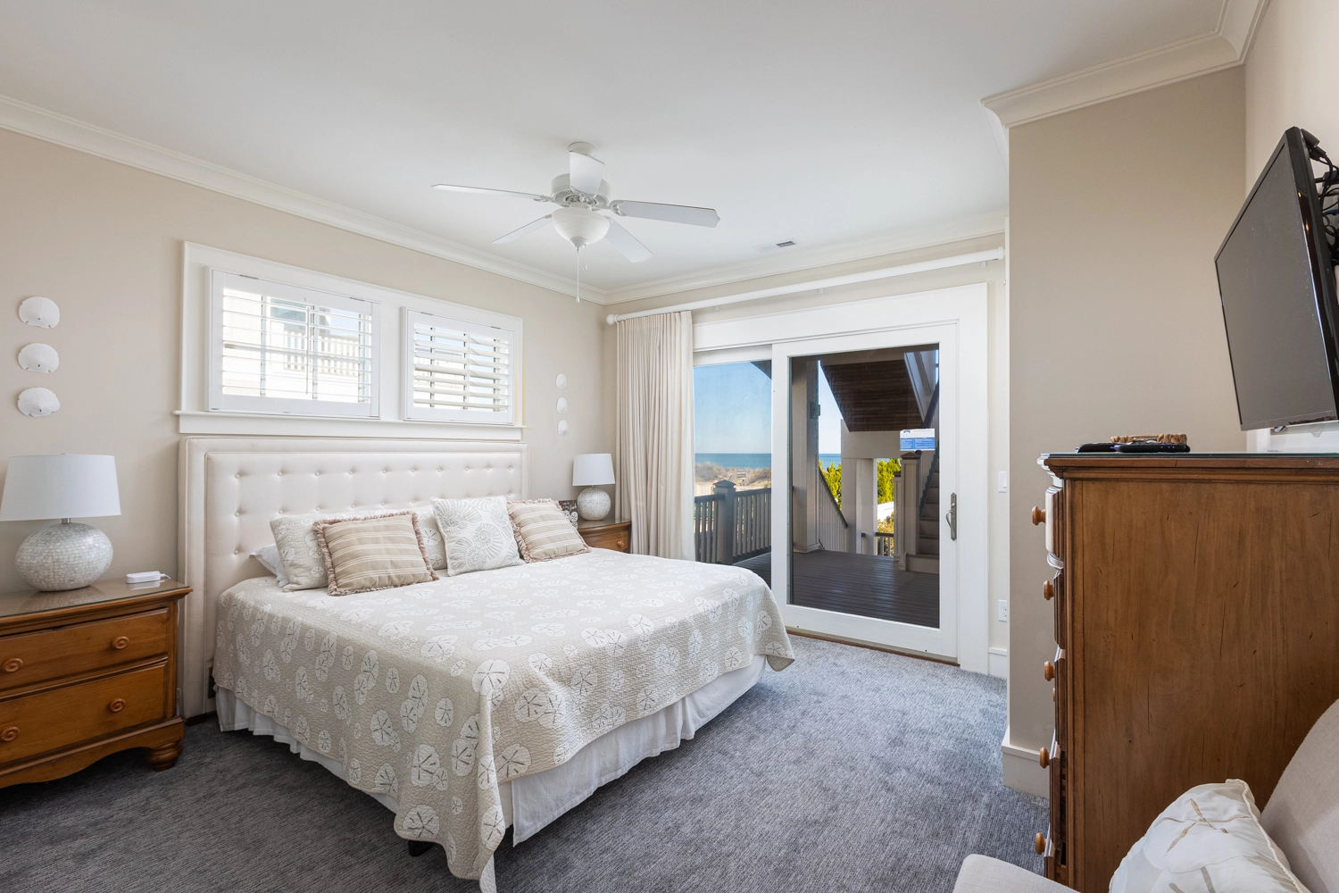 Oceanside, King, Two full baths, Standing showers, Deck access