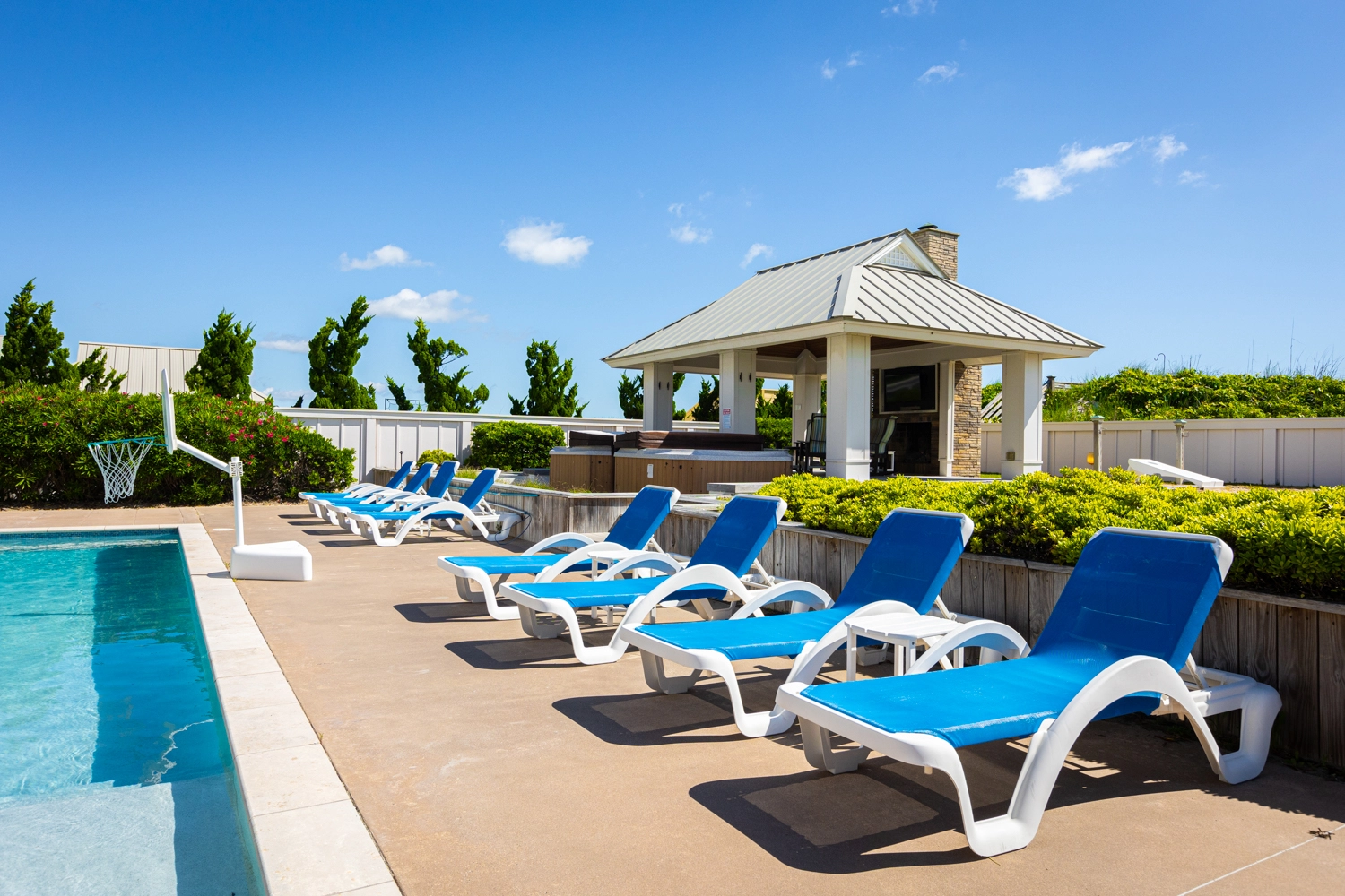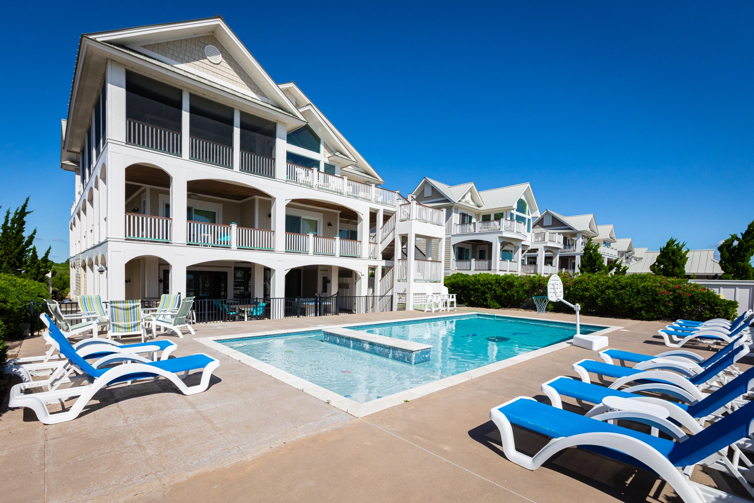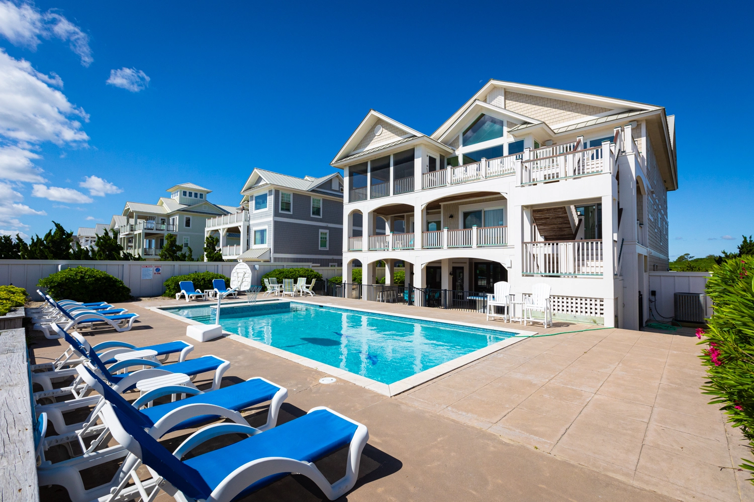 "A large group of us stayed at this house for a week and could not have had a better time. The house is luxurious and the amenities are clearly cared for. Everyone had their own room and bathroom which made for a really relaxing experience. We were concerned that, given our large group, we would run out of kitchen supplies, but that was not the case. There were ample pots, pans, silverware, glassware, plates, etc throughout the house. We loved the plastic drinkware that was on the first floor- it was convenient for poolside drinks. The beach that is accessible from the house was perfect, with soft sand and a plot of land privately accessible to our guests only. The pool was warm and clean, and the hottubs worked well. We had a couple of issues throughout the week (e.g. leak from a sink, pool fountains not functioning), but Twiddy management was incredibly quick to send repairmen to our unit and solve our issues. We were blown away by our stay here and we all really hope to return someday!"