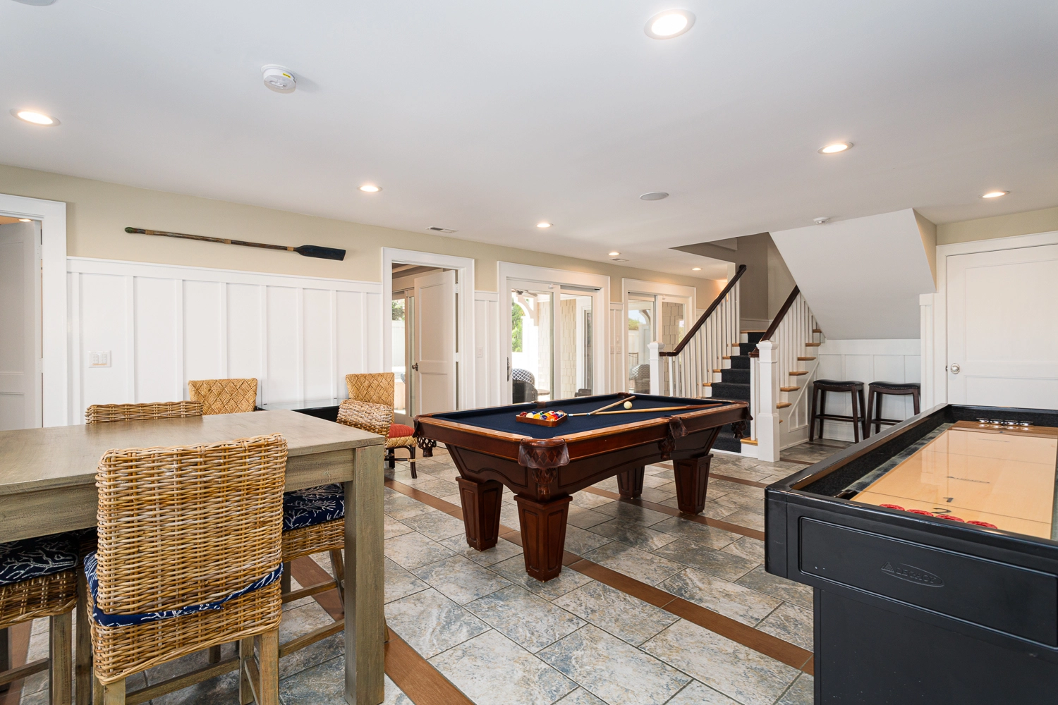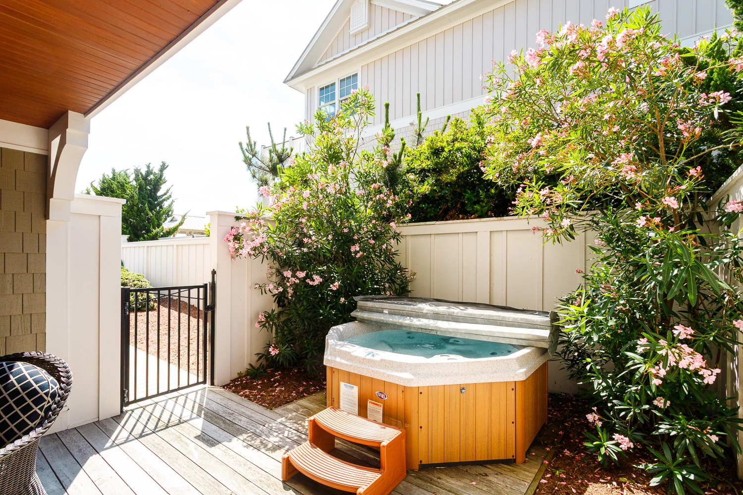 Theater room; exercise room; rec room with pool table; beach staging room with kitchenette and laundry; garden terrace with hot tub.