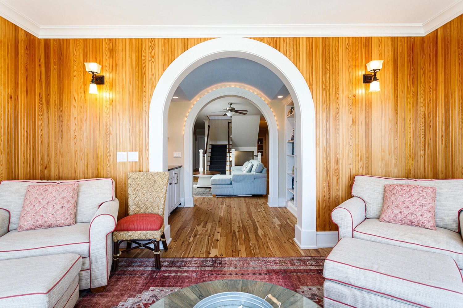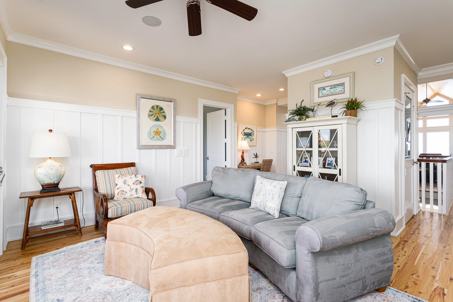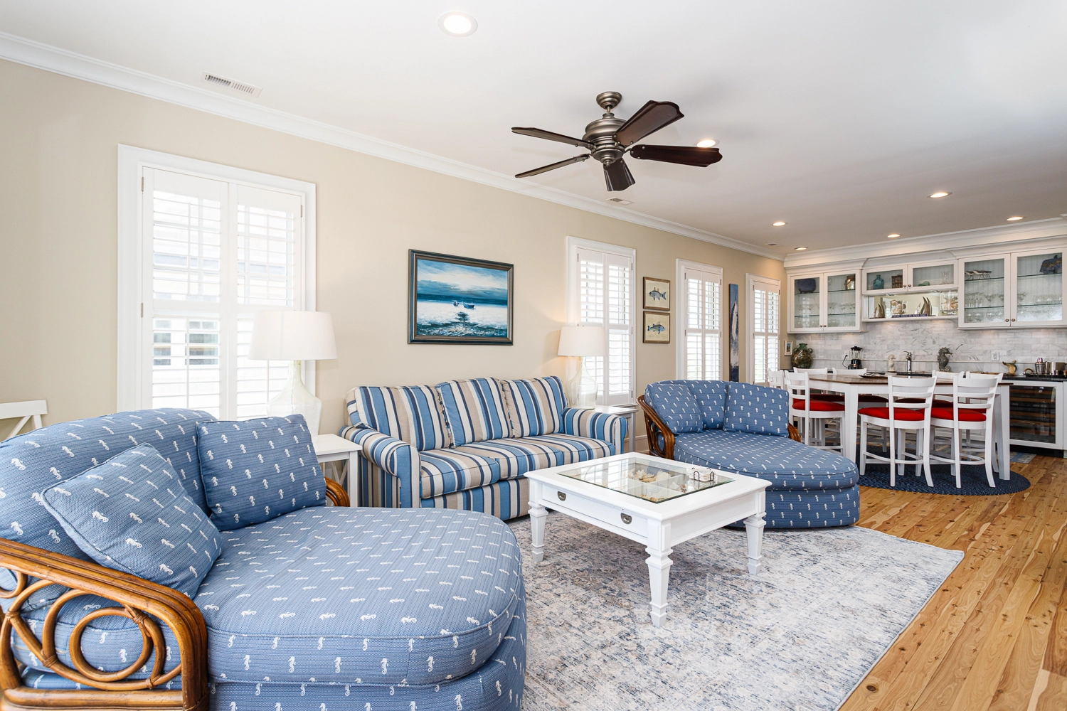 Living area with wet bar and double-sided gas fireplace; kitchen; dining room; breakfast area; soundside sitting room.