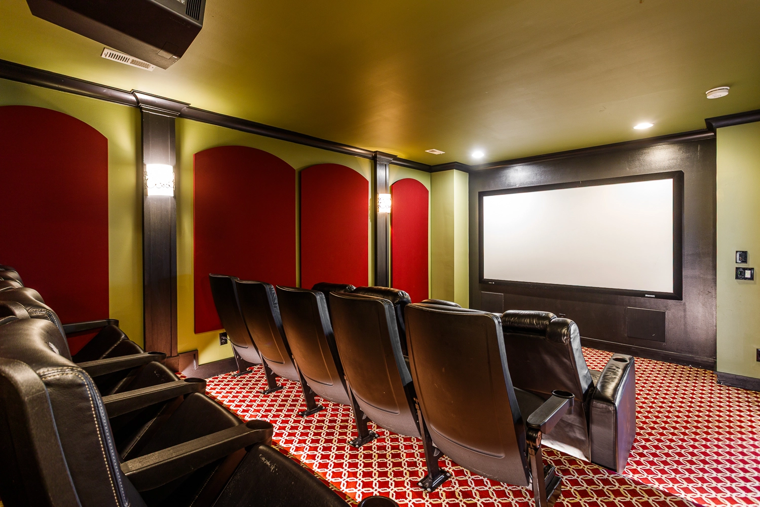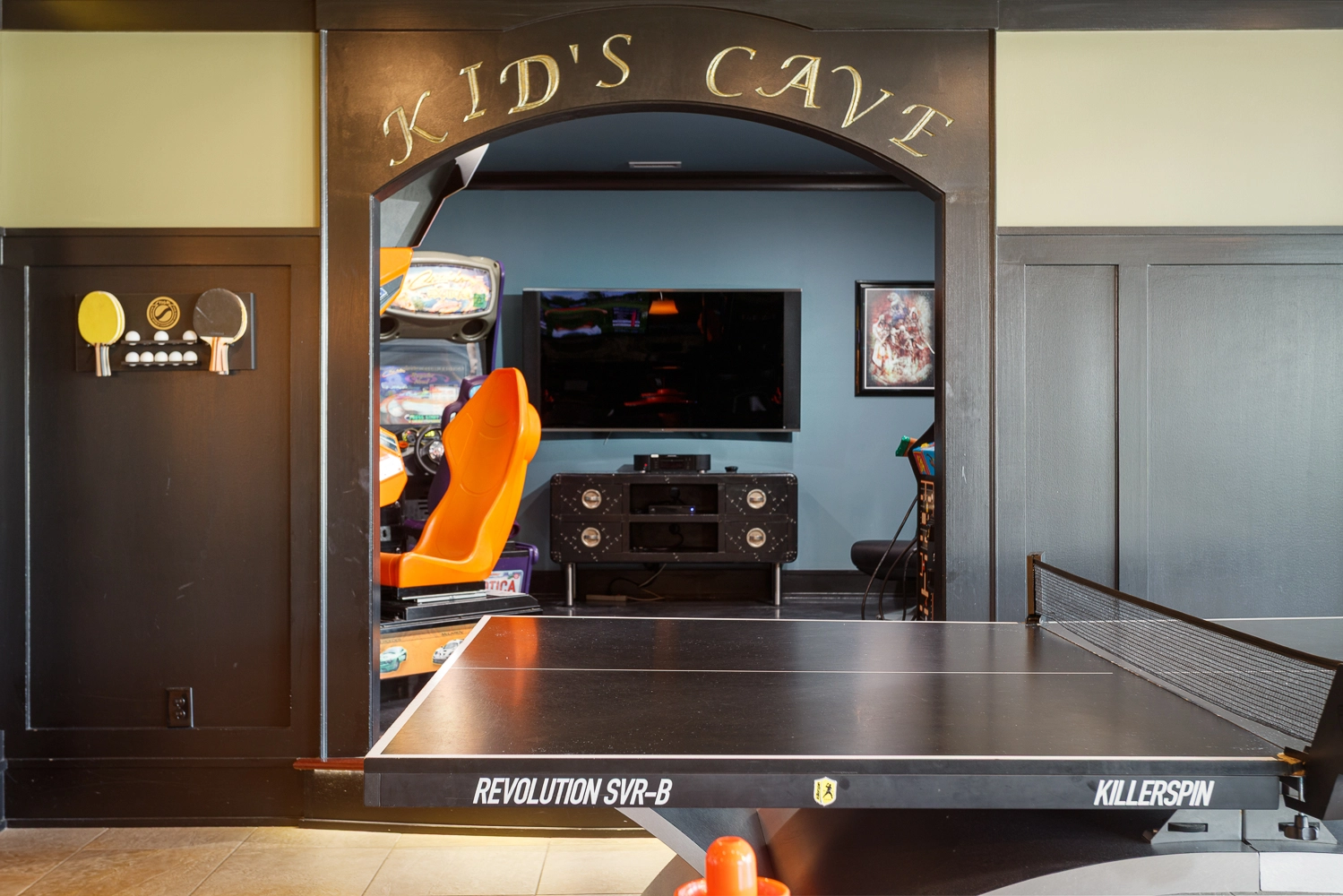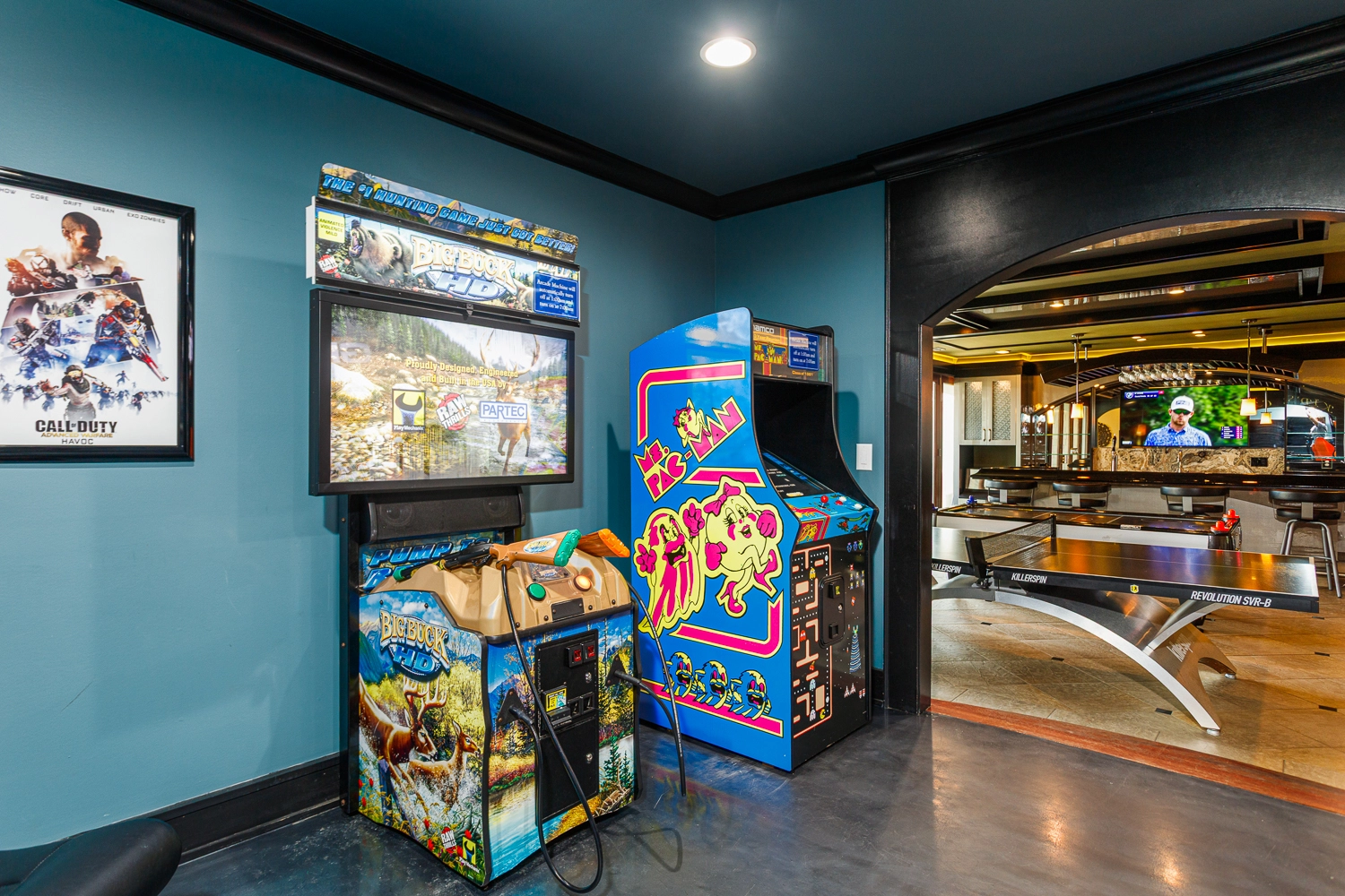 Theater room; kids cave/arcade room with a driving arcade game, Buck Hunter arcade game, and Pac Man game; terrace room with bar, ping pong and air hockey; laundry.
