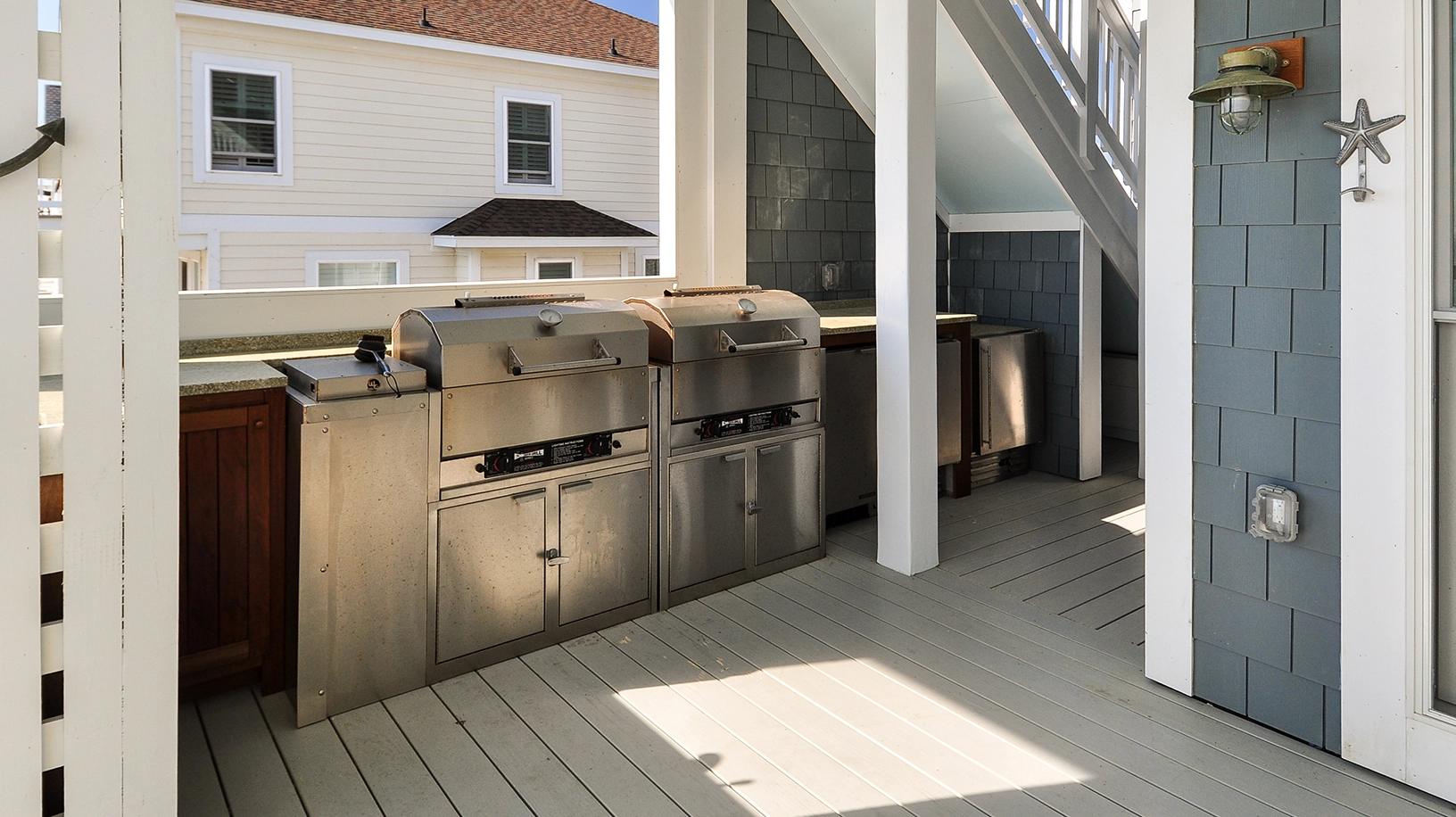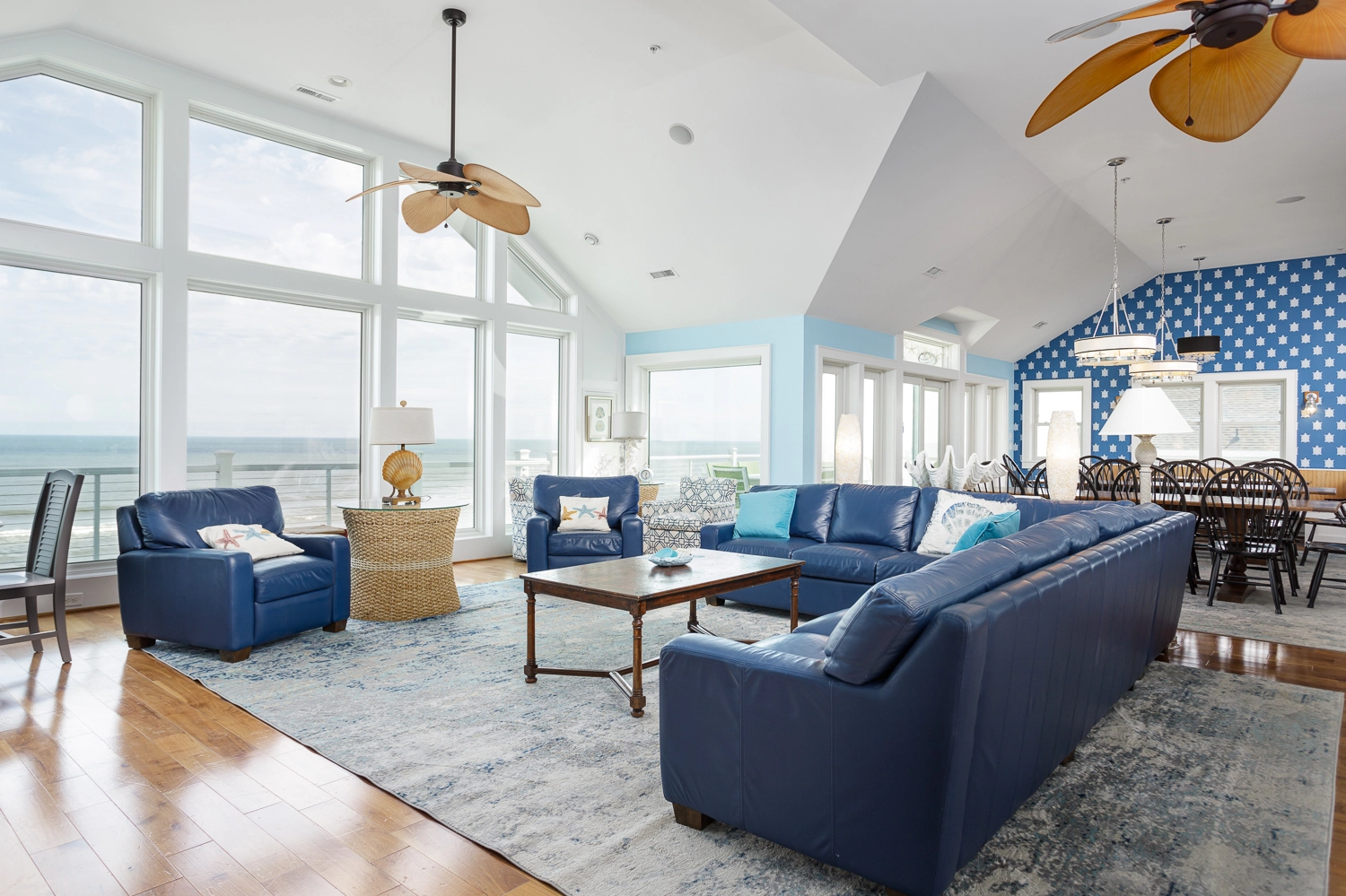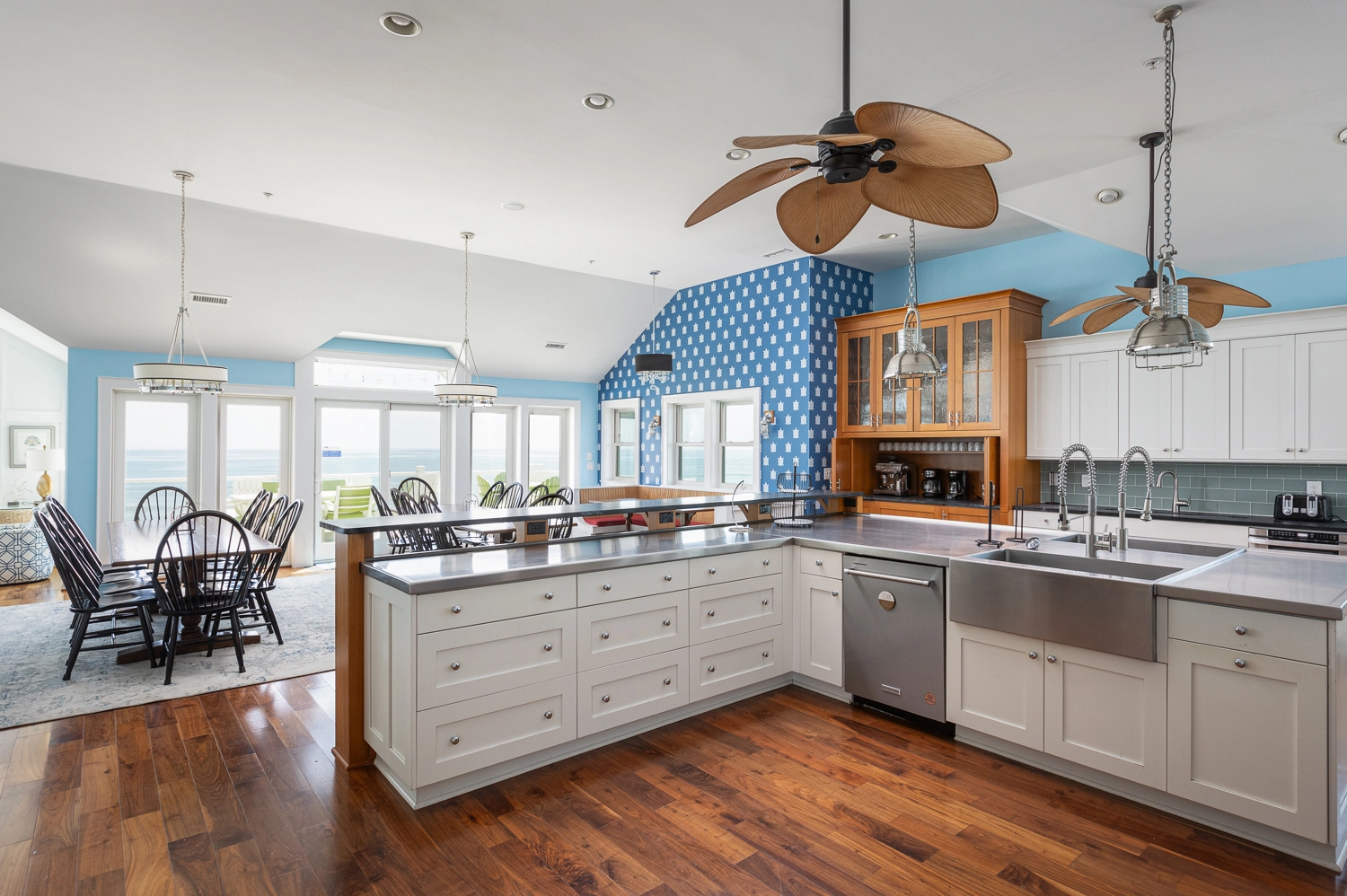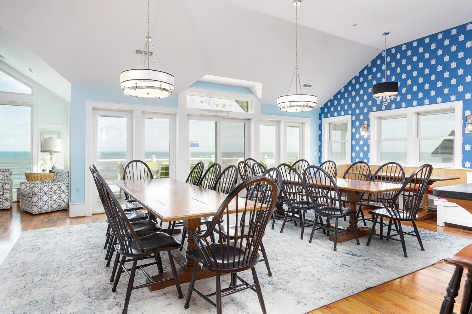 "This is one of the most perfectly designed and beautifully appointed houses in OBX. The third-floor open plan--living room, dining area and huge kitchen--makes it easy for 20 guests to gather in one space. Two huge refrigerators, two high-quality ice makers, two ovens, two dishwashers, a coffee bar and place settings for 20+ people make meals easy. (There are large refrigerators on each of the three floors.) The second floor is a more intimate space that overlooks the pool and is a great place to quietly read or watch t.v. There are actually several places for quiet in the house, like the ocean-facing or bay-facing porches on the second and third floors. The swimming pool is distinctive because it is set *above the dunes* and offers unobstructed views of the ocean. All of the ten bedrooms are spacious and have nicely designed bathrooms, so every room feels special. The owners clearly care about the experience of their guests. The house is immaculately clean with almost no signs of wear and tear."