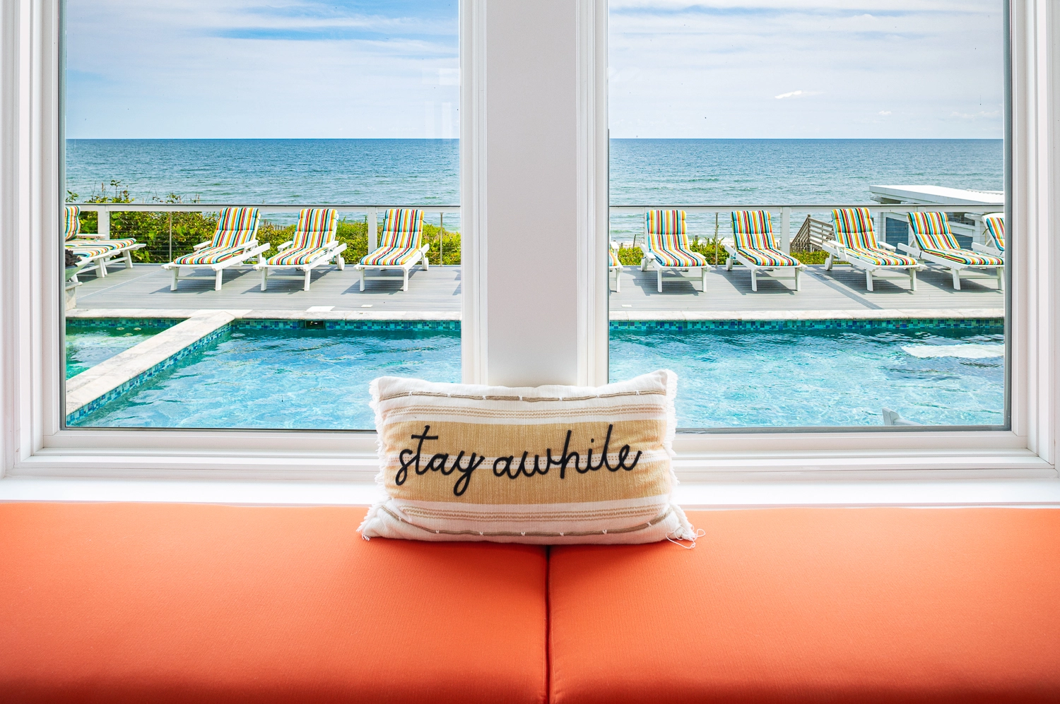 "Spacious and beautifully appointed kitchen. Large spaces for gathering and quiet places for reading or having coffee or talking. Distinctive bedroom and bathroom designs make everyone feel special. Unique elevation of the pool above the dunes for great views and ocean breezes."