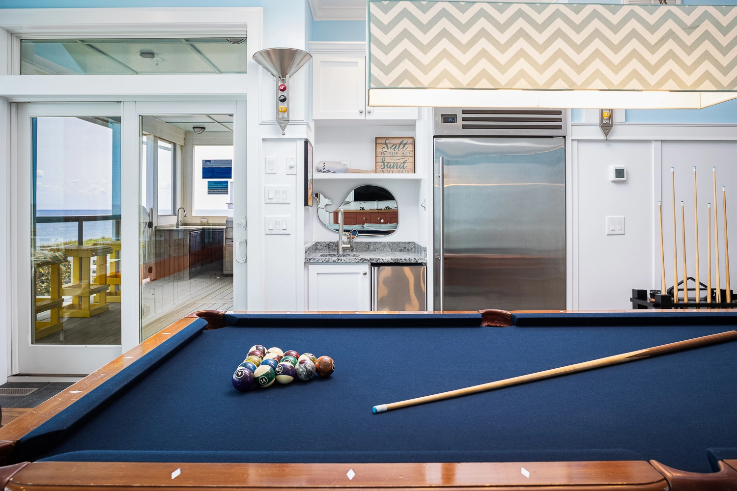 Rec room with pool table and ping pong table, wet bar and full size refrigerator; screened porch.