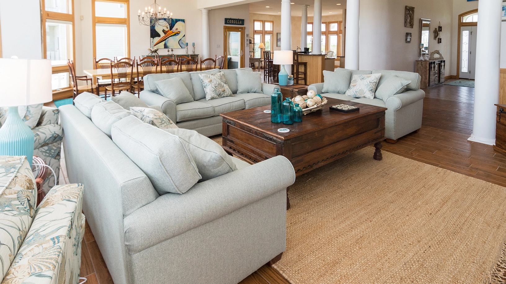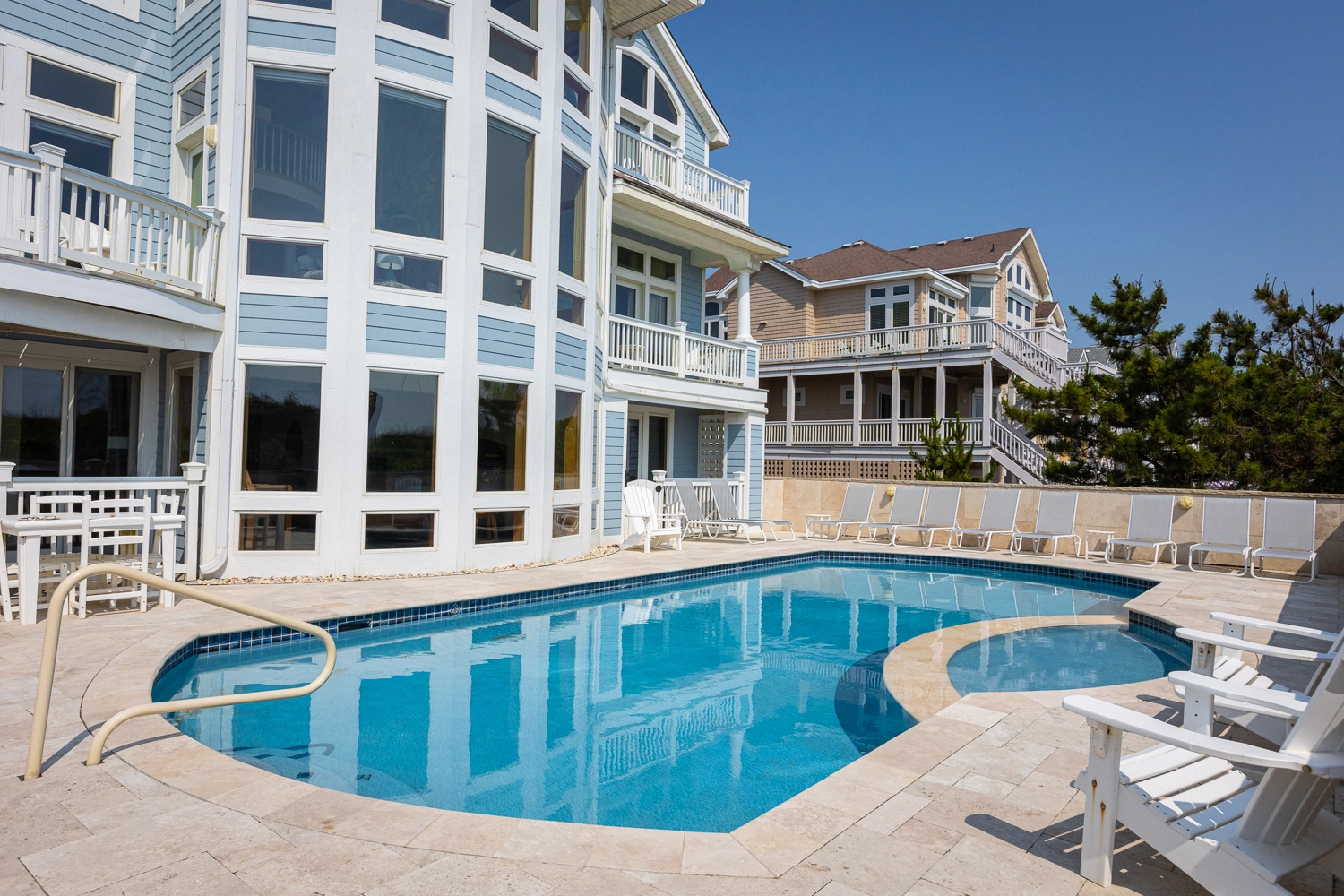 "Loved everything about the home. We all enjoy cooking and had six home cooked meals, including make your own pizza night. They organized a lesson and instructions for personalized pizzas, with every topping you could think of. The spacious kitchen and huge island made for a perfect setting to work on the many successful Creations. Of course the double ovens and well equipped kitchen made for many memorable cooking experiences. The house layout made it very convenient because everything was accessible with just a couple steps. No matter where you were in the house, everything you needed was at your fingertips. And to top it off, the whole feel of the house was a very luxurious. It certainly was a treat for all of us. We have been coming down to the Outer Banks since the 1970s and certainly appreciated accessibility to both Duck and Corolla and when needed to Nags Head, the waterpark and the golf courses. The Family golfers thought for sure they heard other family members going down the slides at H2OBX. All we needed for the children and adults was right there…. The arcade and pool table. Great arcade game! All the furniture in the house was laid out perfect for us, and very comfortable. Outstanding views of both the sound and the ocean….. we couldn’t ask for anything better. This is the first time we got a beachfront and now we understand why you do not really have to venture out, but we did take advantage of some of the water sports, etc. one of the things we like the best was having a private entrance where the children could go up and down and we did not have to worry. It was monumental to have a cabana service…. Many made the sunrise every morning and then the sunset every evening. It was fabulous and so peaceful. It was pretty cool that there was sun on the pool in the morning and shade in the backyard in the afternoon. And that hot tub….WOW! What an amazing, relaxing, and fun experience! Like the placement of it. The design and comfort of your pool deck chairs were much appreciated. And that, stepping pool and ledge that you can sit on, really was quite an enjoyable plus! And then there’s the travertine, another wow! Thank you!!!! And at night, those pool, lights were mesmerizing and I especially liked viewing it from the deck as I can see everyone else enjoyed it too. Just so many pluses that we weren’t used to made it amazing for us and memorable forever. And I can’t go without saying the double washer definitely served as well. Special that you had a sink in there too. Especially loved the two tables because sometimes you just need somewhere where people can work on their computer or the kids only can eat. The multiple uses of the second table was very welcomed, especially for our game, players and puzzle people. I can’t even imagine the opportunity and joy you must have to go there when there are no renters. Thank you for making everything so stress-free. And many thanks to Twiddy because no where have I ever consistently dealt with people so nice and professional on the phone!!!! of course I’ve been to the Corolla Office also and love it."