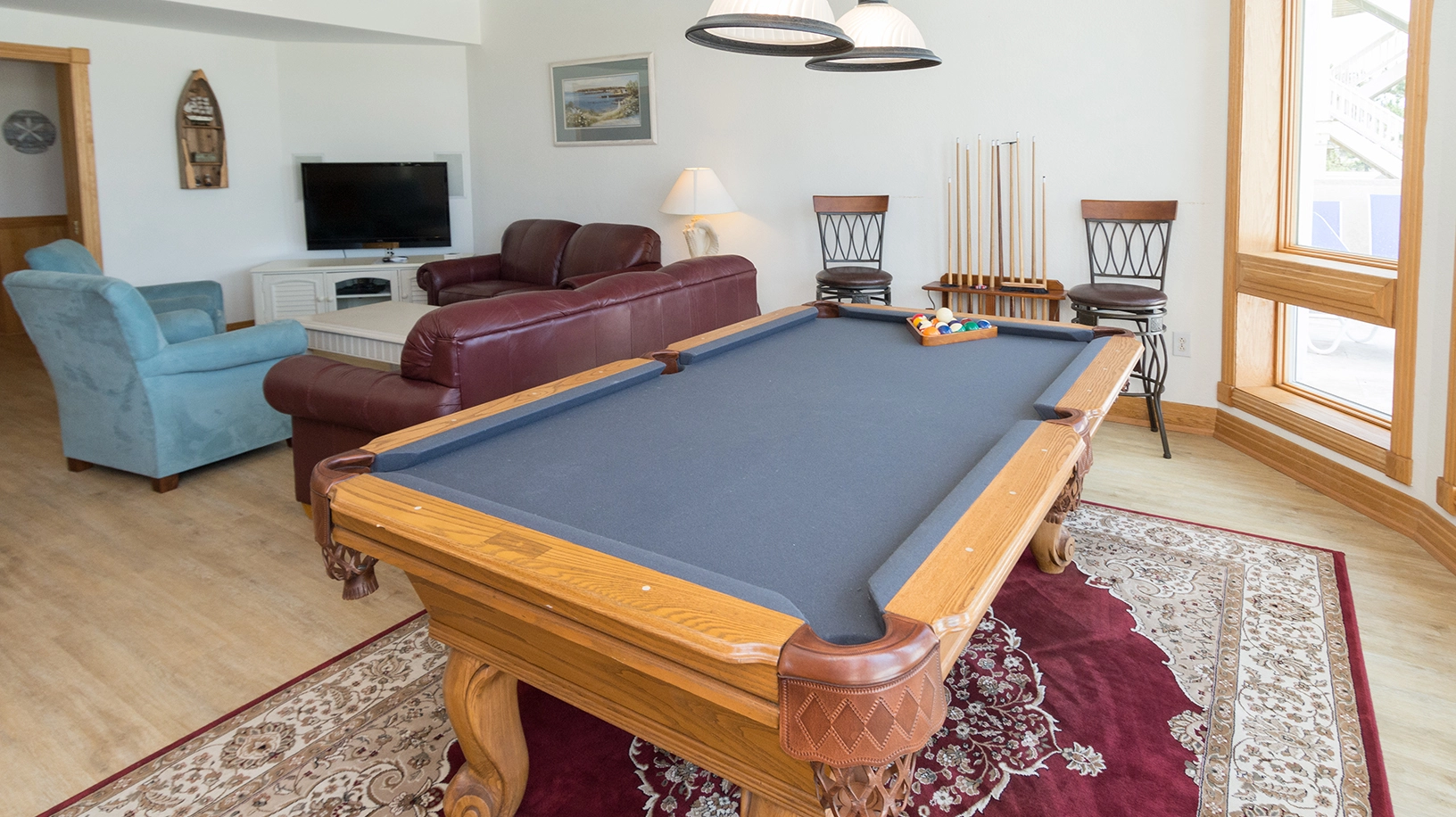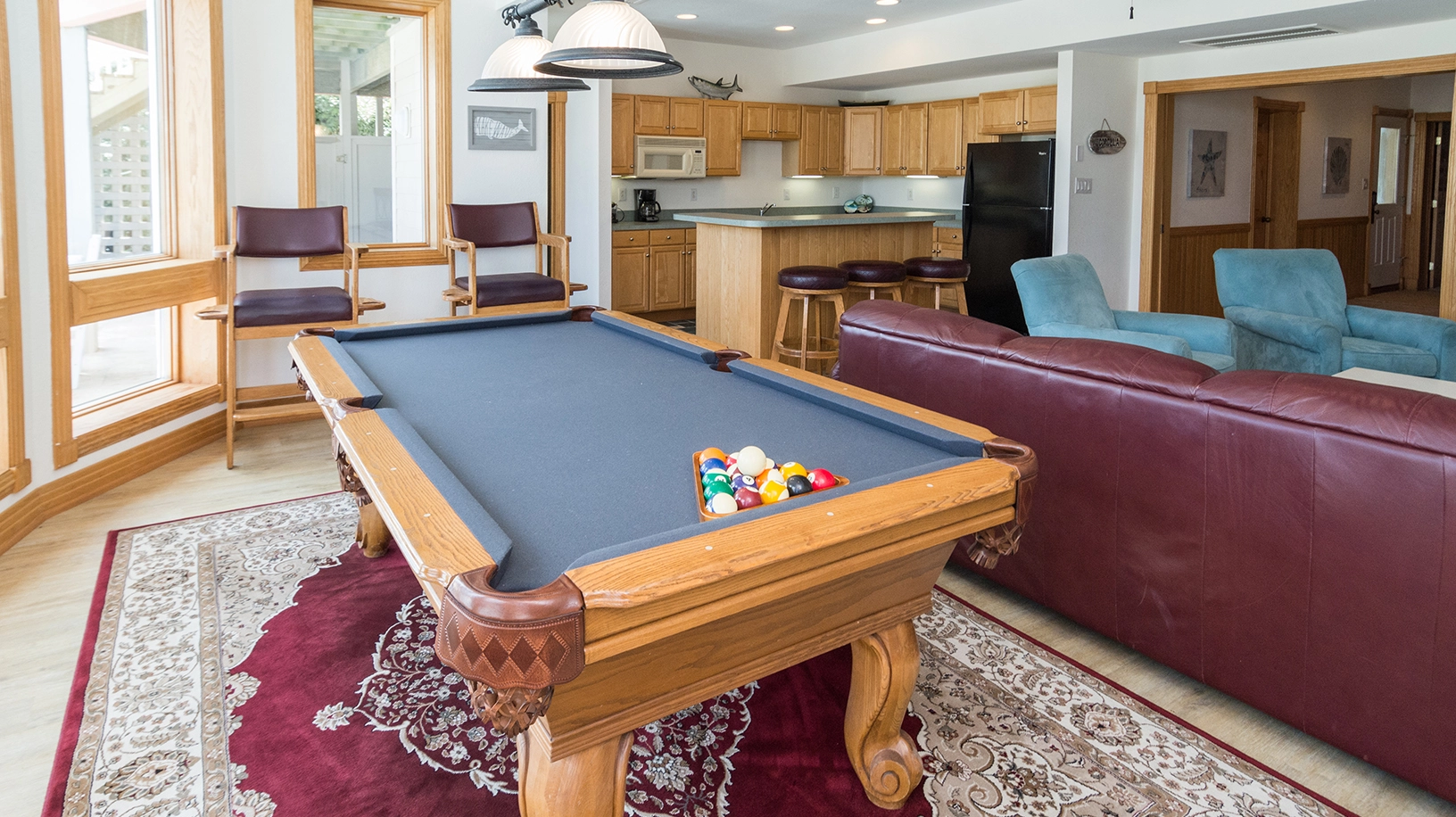 Rec room with pool table, and kitchenette; double laundry.