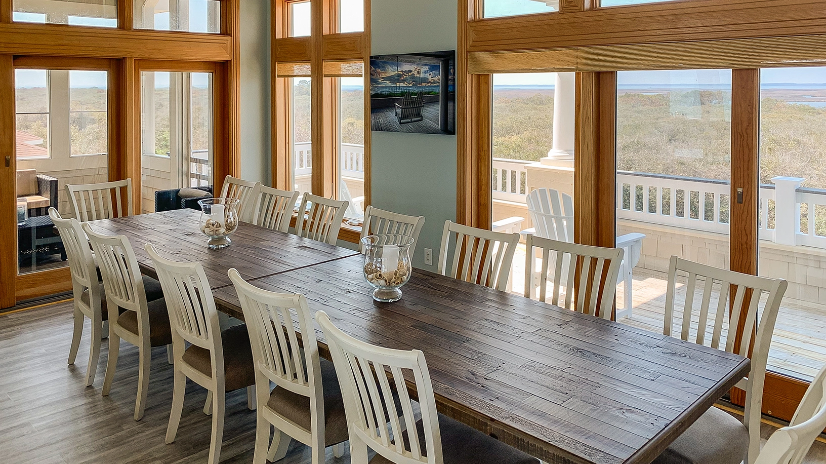 "This is our 4th year staying at Anticipation. We love the fact that there are 5 master suites so that each guest has their own personal space. The kitchen is well equipped with two full size refrigerators, a gas stove and every appliance needed. The views from the large, beautiful windows is spectacular, so even if raining, you don’t have to worry. You have a lovely view of the ocean and a lovely view of the sound. The land where Anticipation rests in Pine Island does not and could not have a home in front of it, so the views of the sunrises and sunsets are in clear view!"