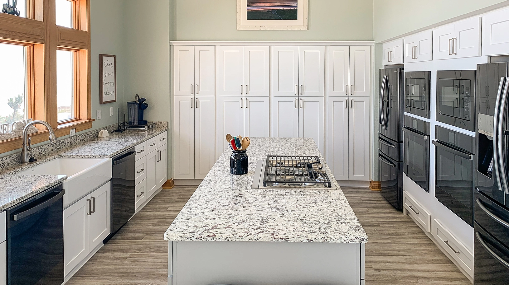 Great room with gas fireplace; kitchen with two double ovens, refrigerators, and cooktops; dining room.