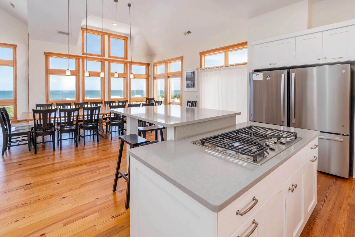 "The kitchen/dining/great room area were wonderful. The space easily accommodated our family of 13 with ample space for the kiddies to play while the adults could prepare meals together. We cook every day for dinner, so the double fridge and double dishwasher were helpful. We LOVED the big dining table as we were all able to sit together at the same table for meals. The island counter came in handy for the meals that were served buffet style. The number of bedrooms/bathrooms and the short walk to the beach were also great."