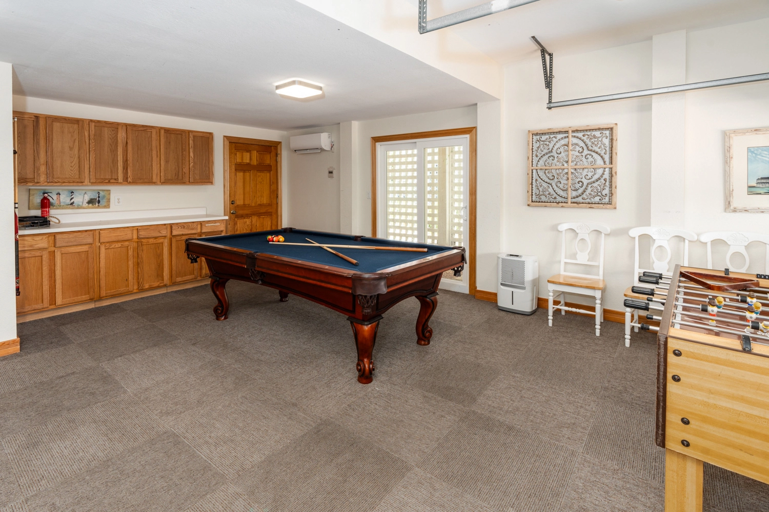 Rec room with pool table, media area, and wet bar; laundry.