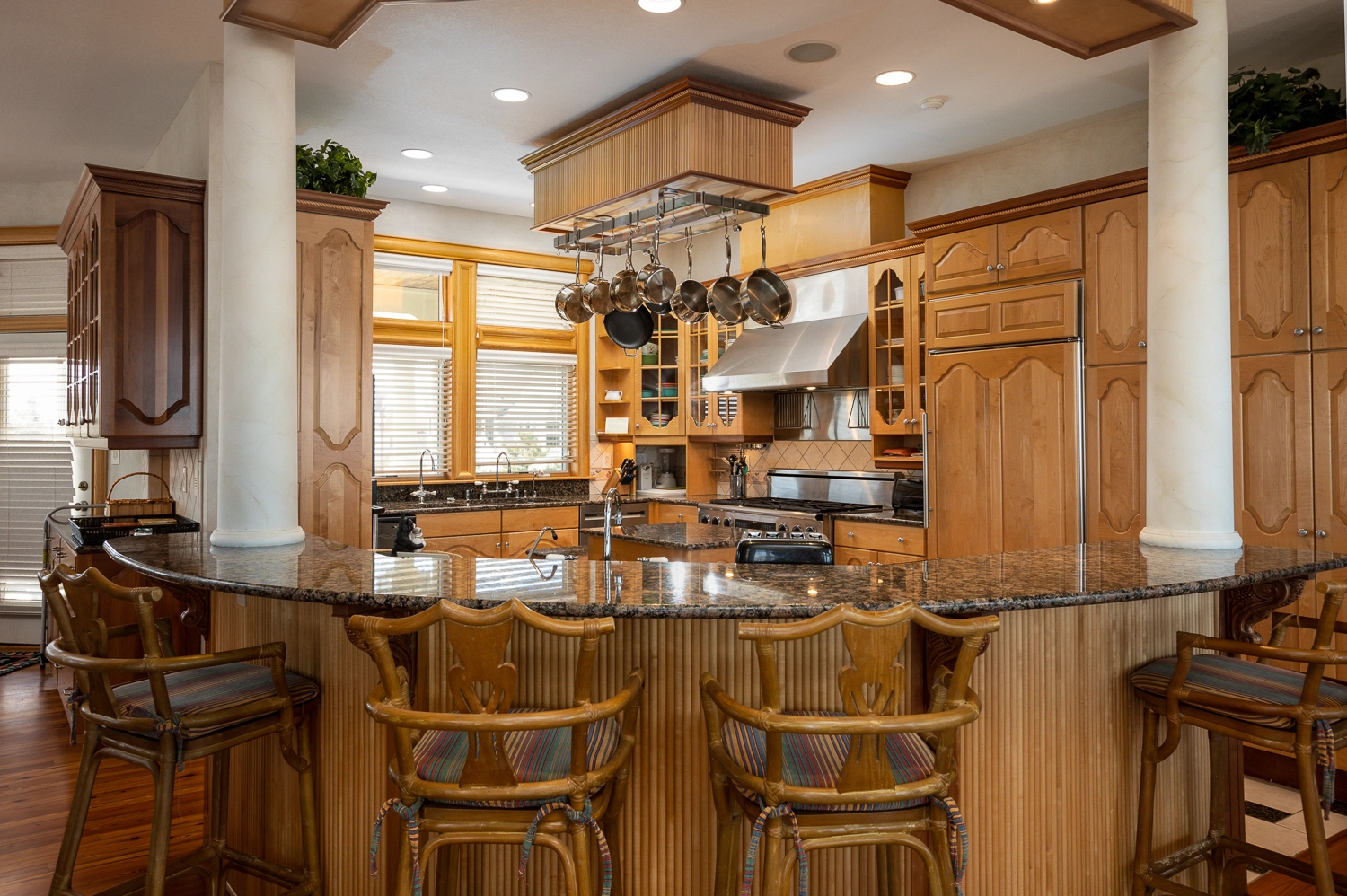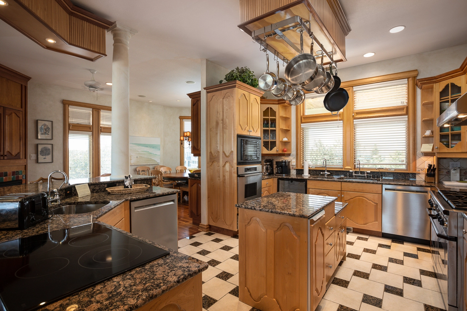 Great room with gas fireplace and wet bar; kitchen with four ovens, gas range, and two dishwashers; dining area; breakfast nook with separate bar; study; screened porch.