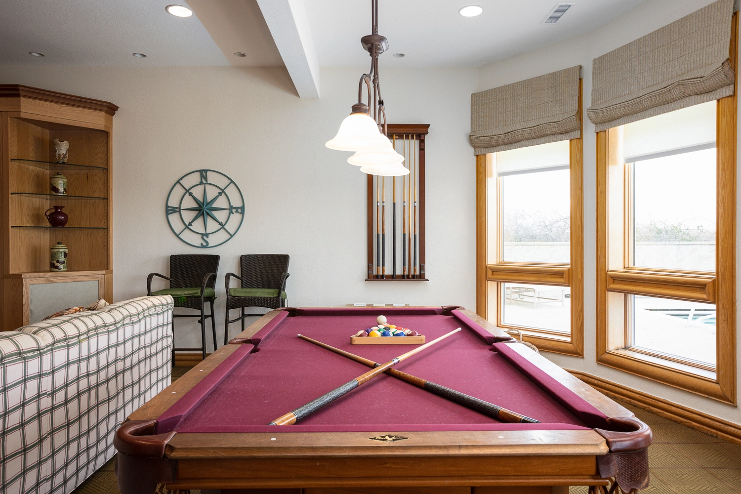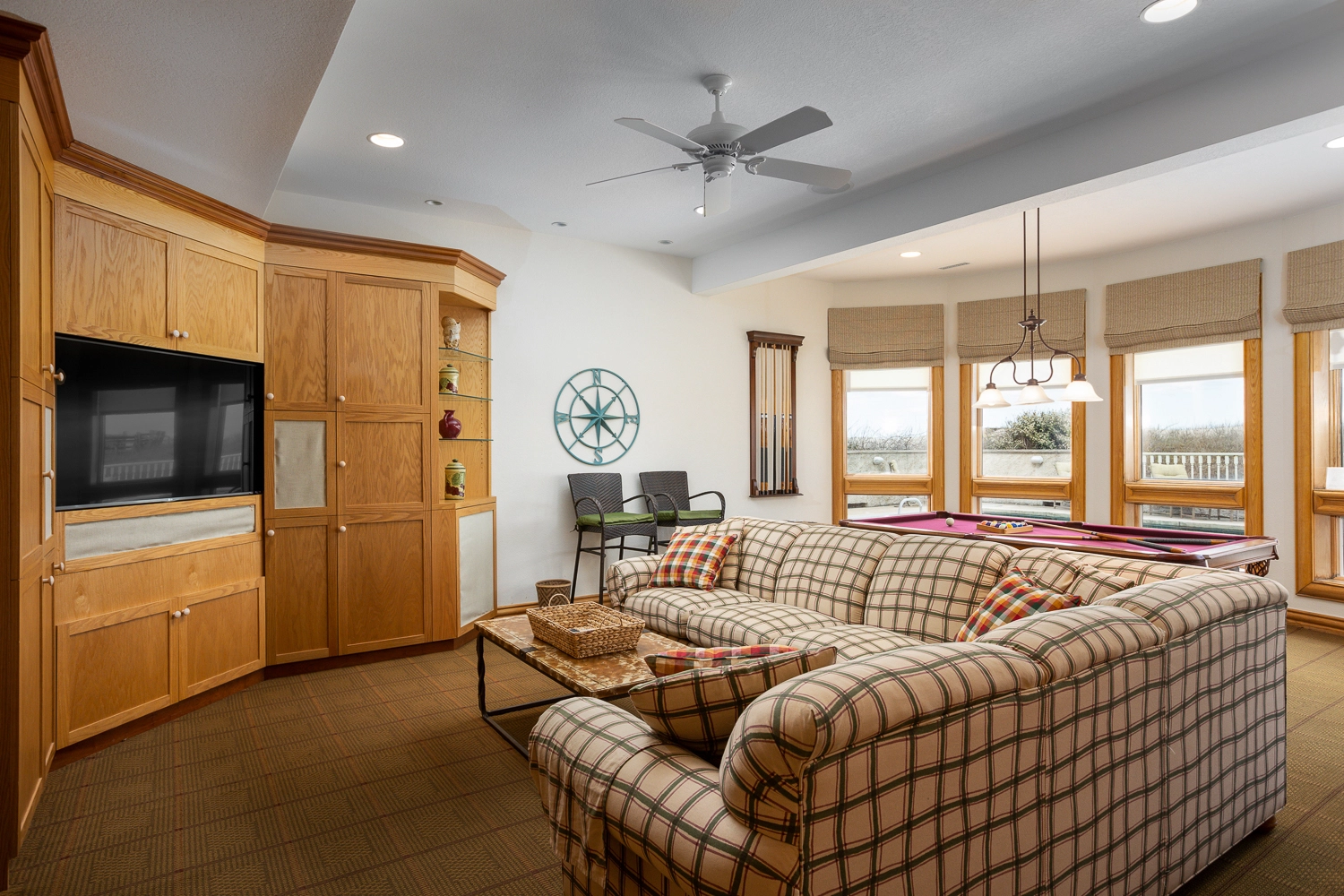 Rec room with pool table and full kitchen with oven, cooktop, refrigerator, dishwasher, and microwave; laundry room.