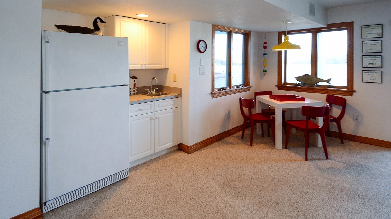 Great room; kitchen with two ovens and two dishwashers; dining area.
