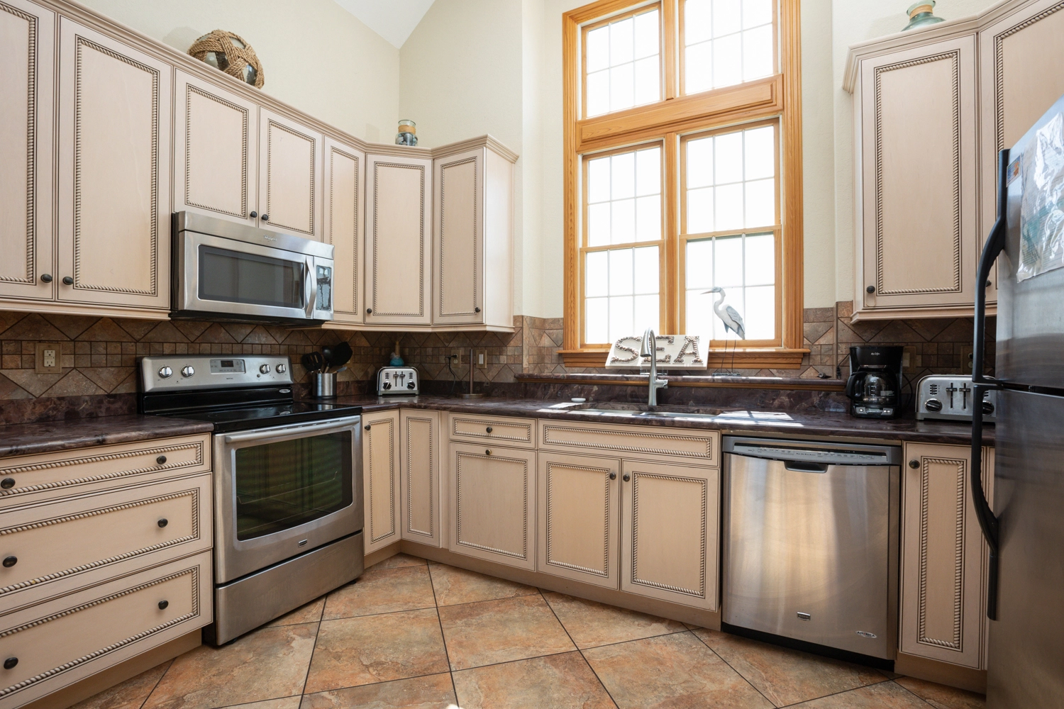 Great room with gas fireplace; kitchen with stand alone ice maker; dining area; ship's watch.