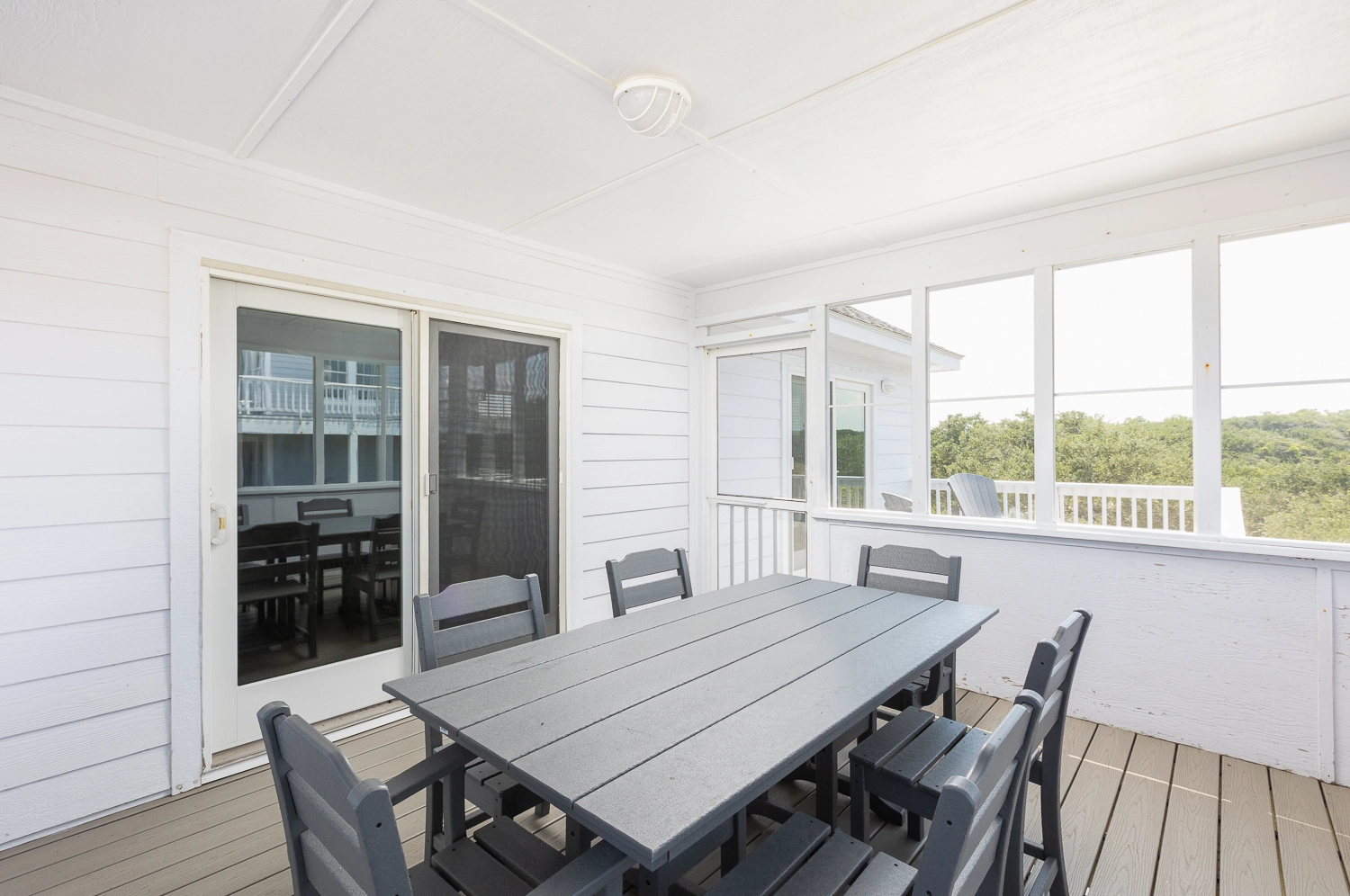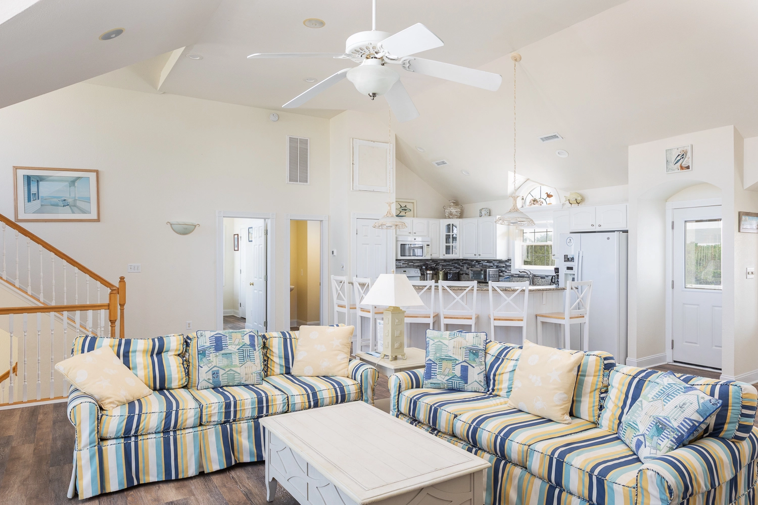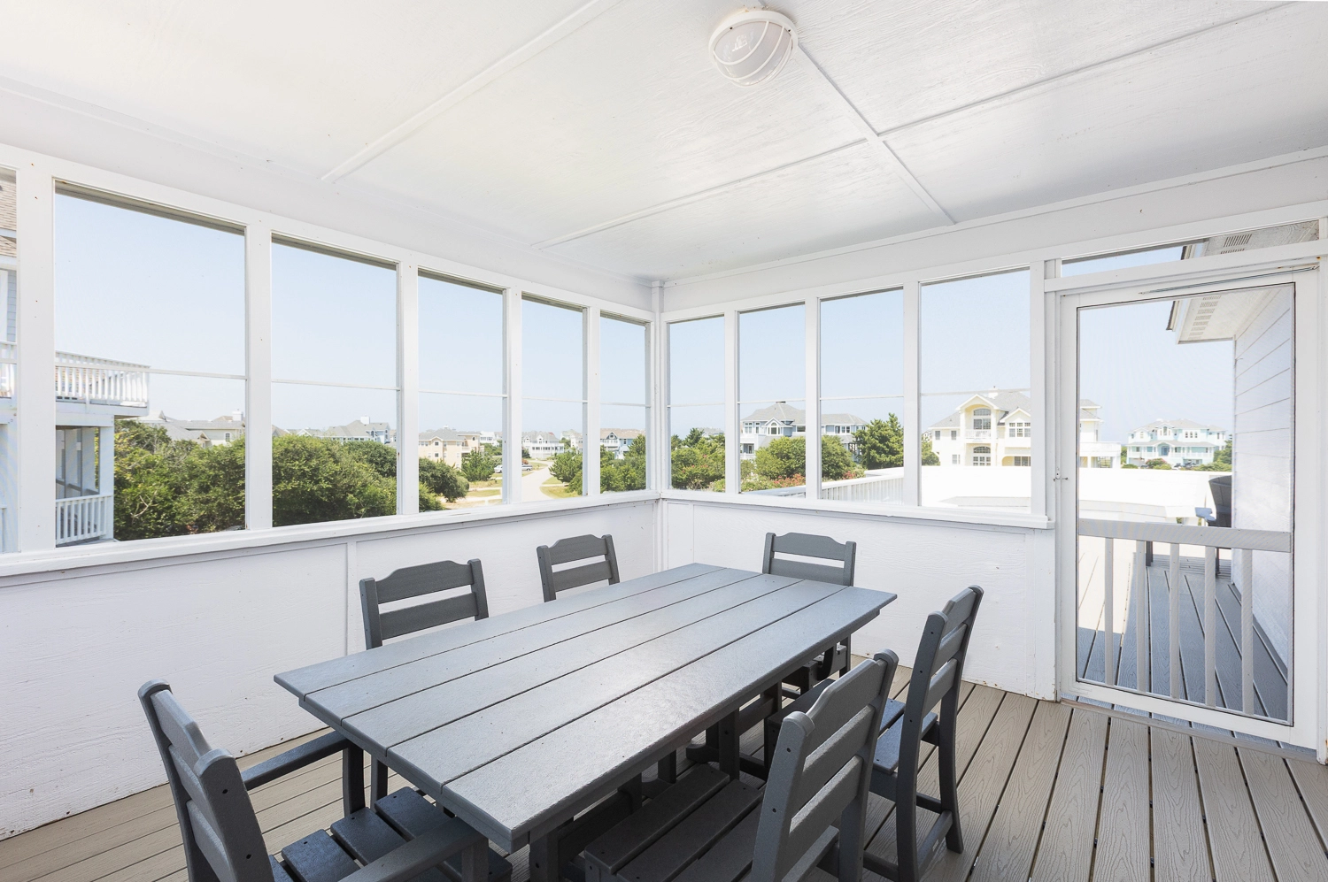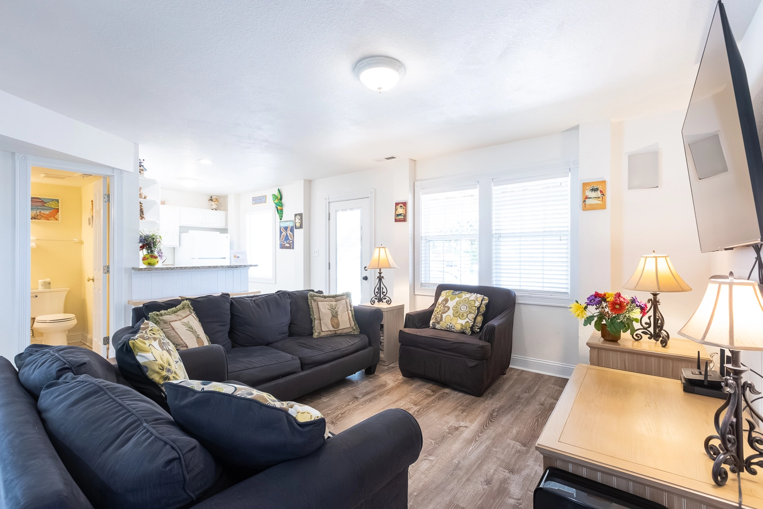 Great room with gas fireplace; kitchen; dining area; screened porch.