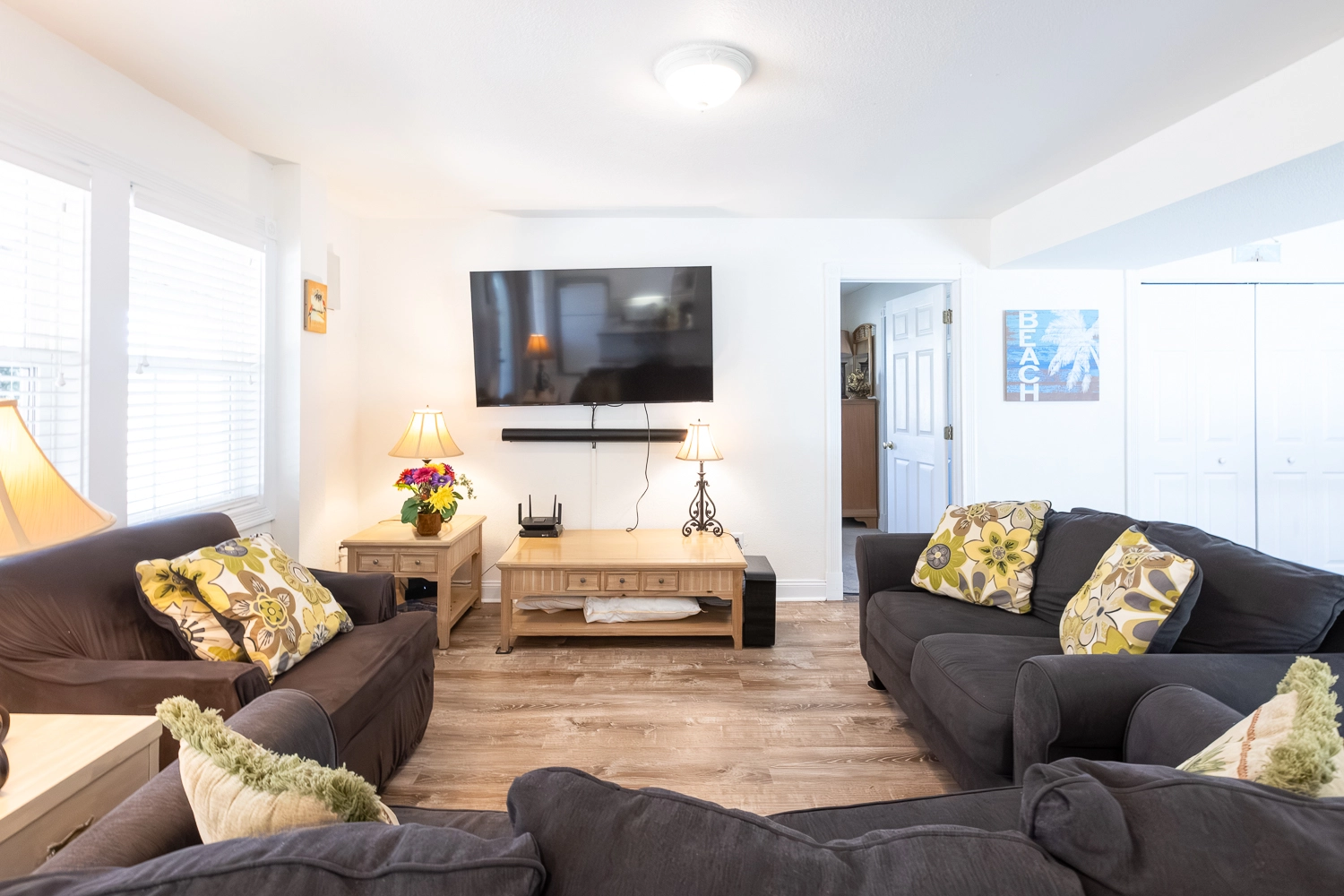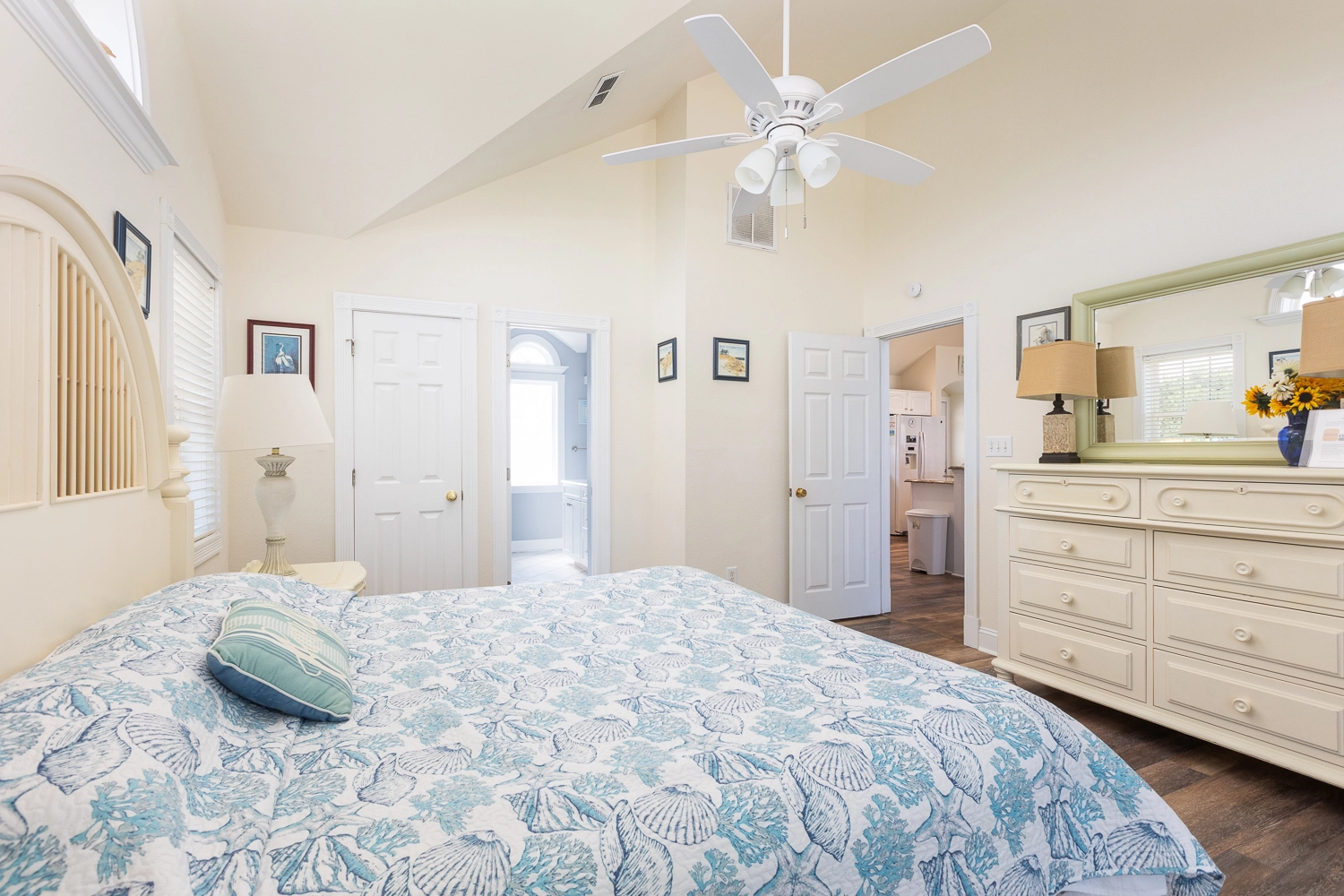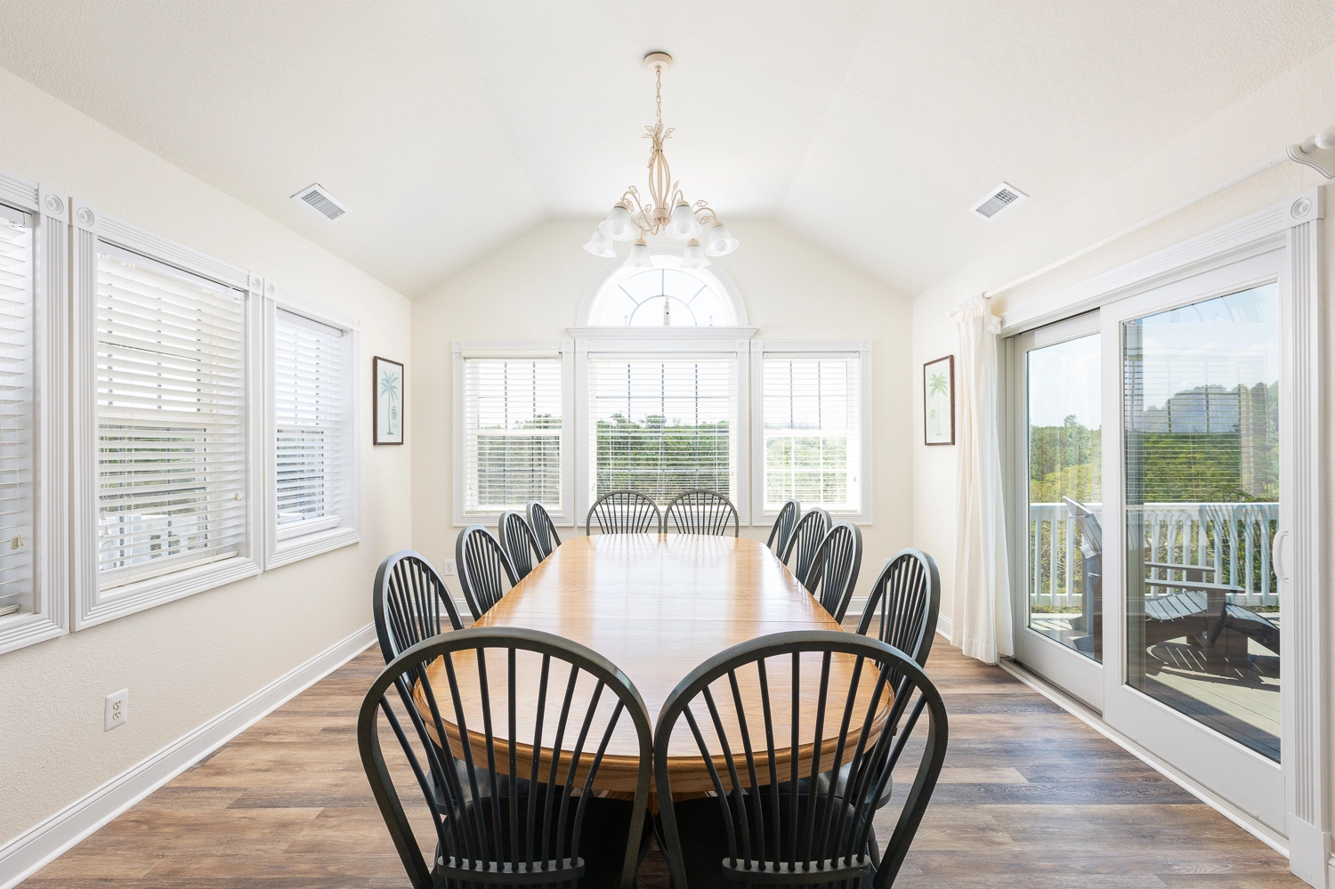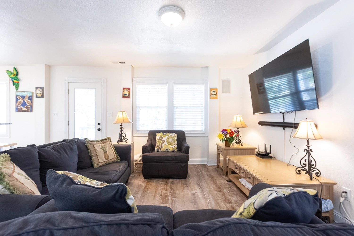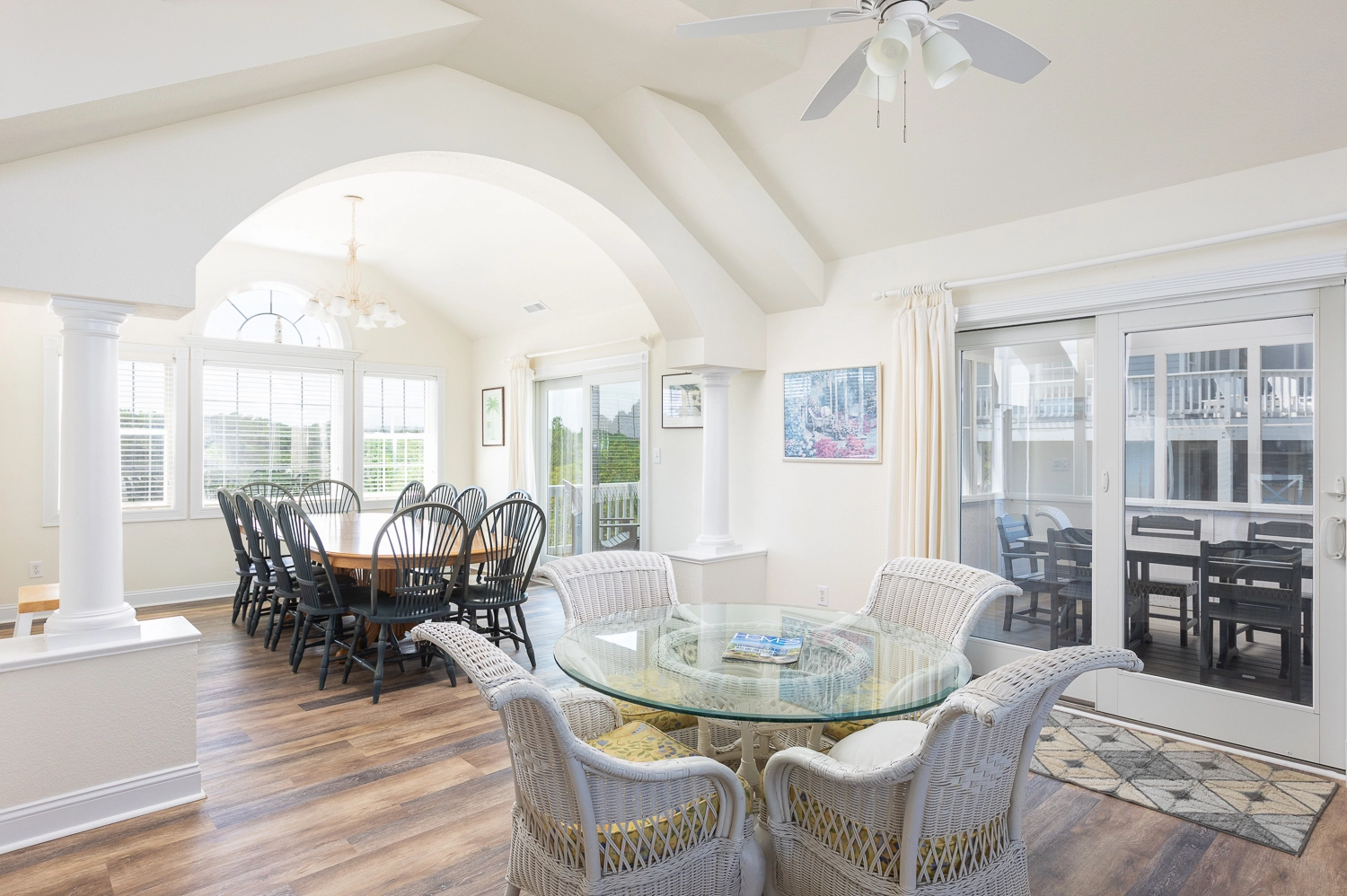 Great room with gas fireplace; kitchen; dining area; screened porch.