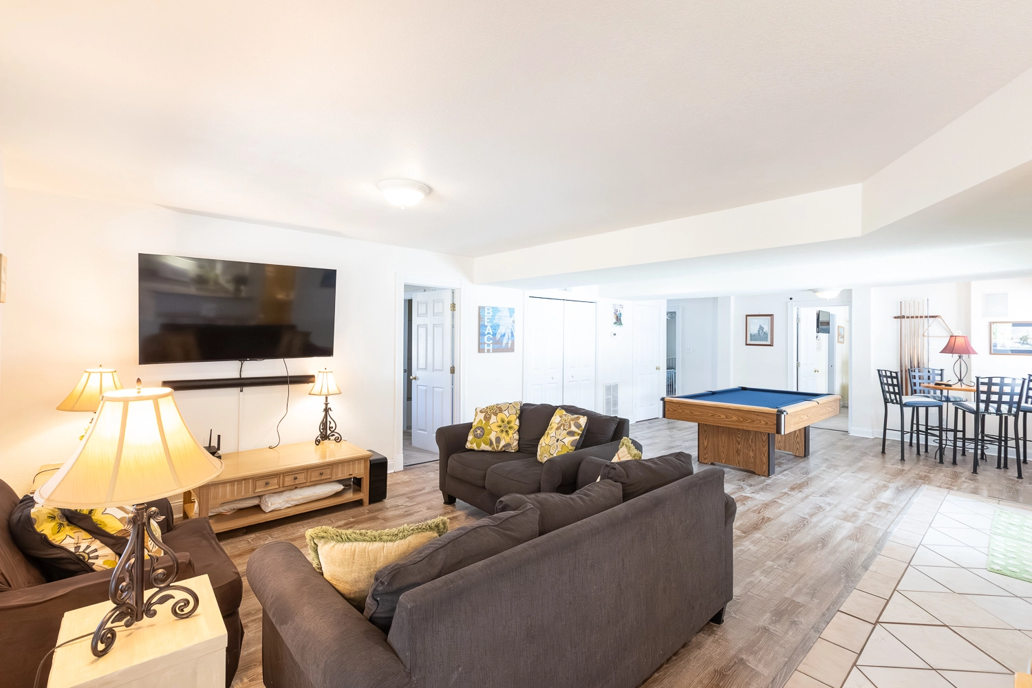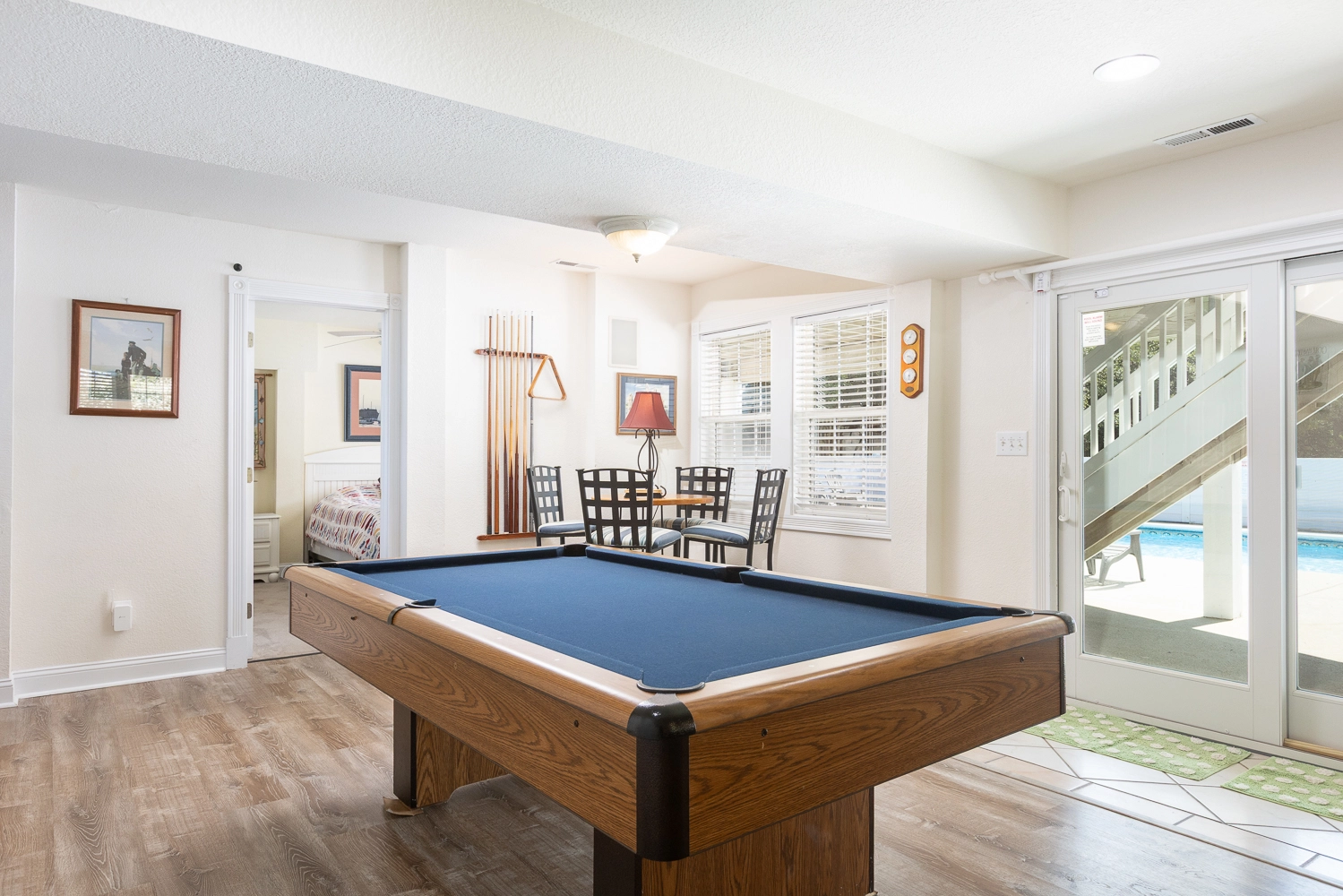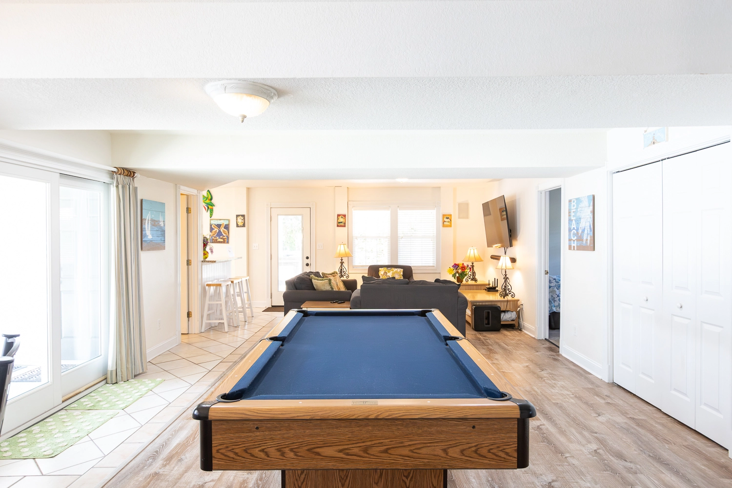 Rec room with pool table, and kitchenette with refrigerator; laundry.