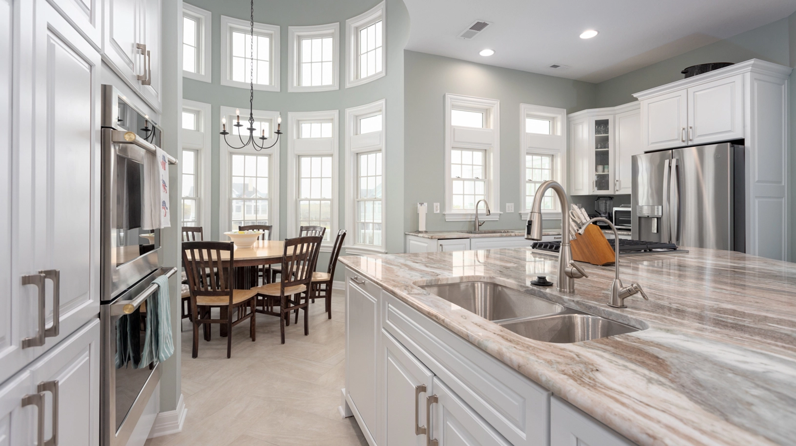 Great room with gas fireplace; kitchen with double ovens and dishwashers; dining area.