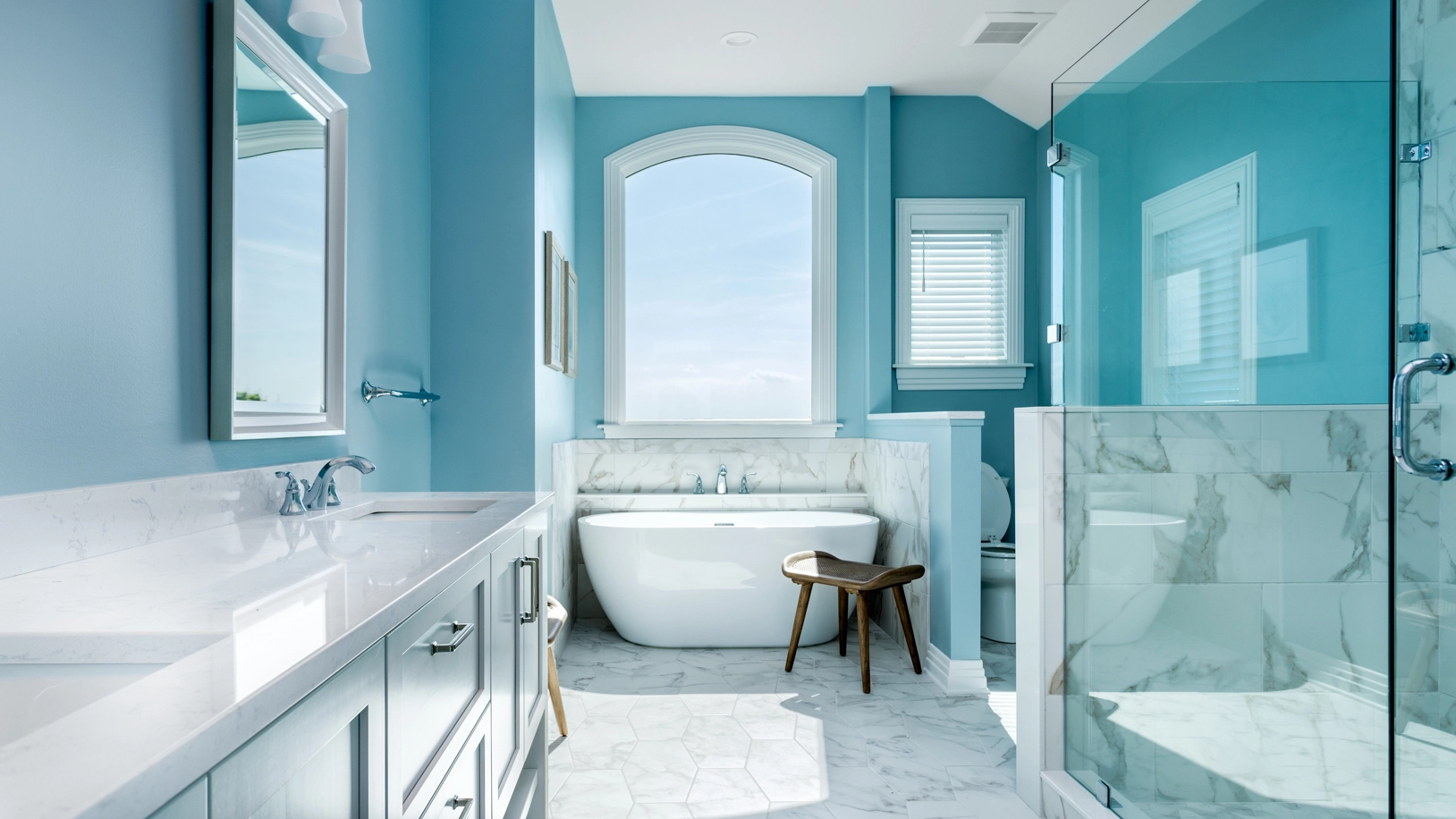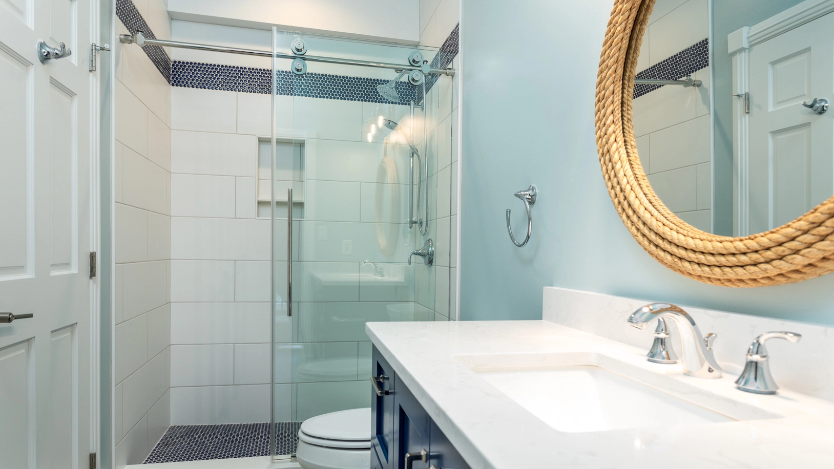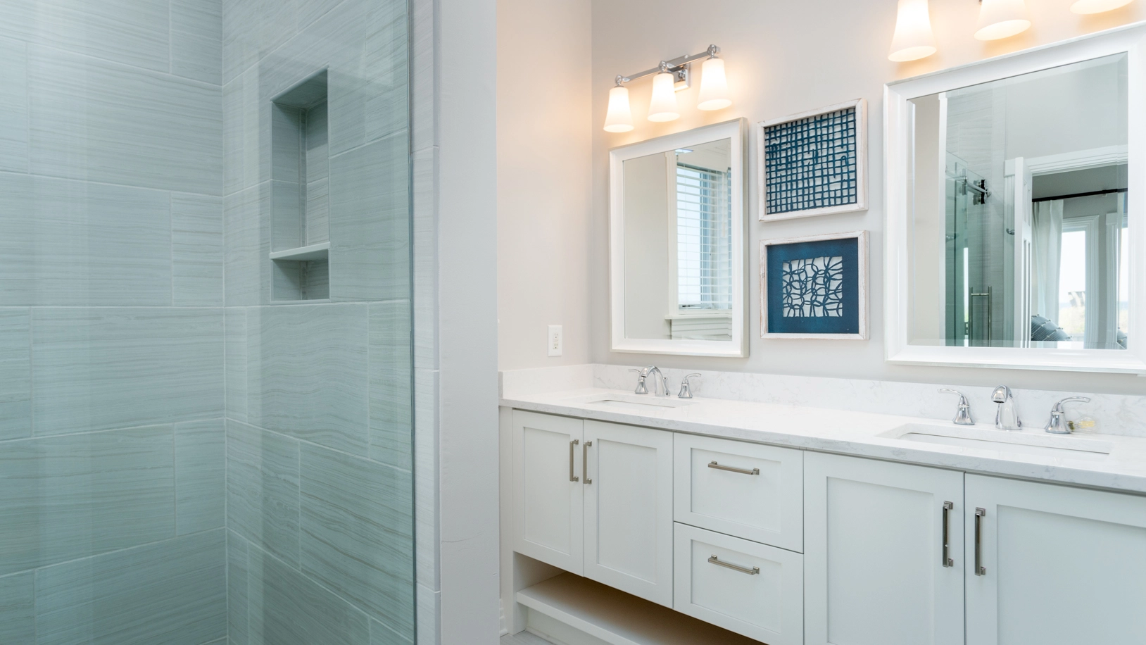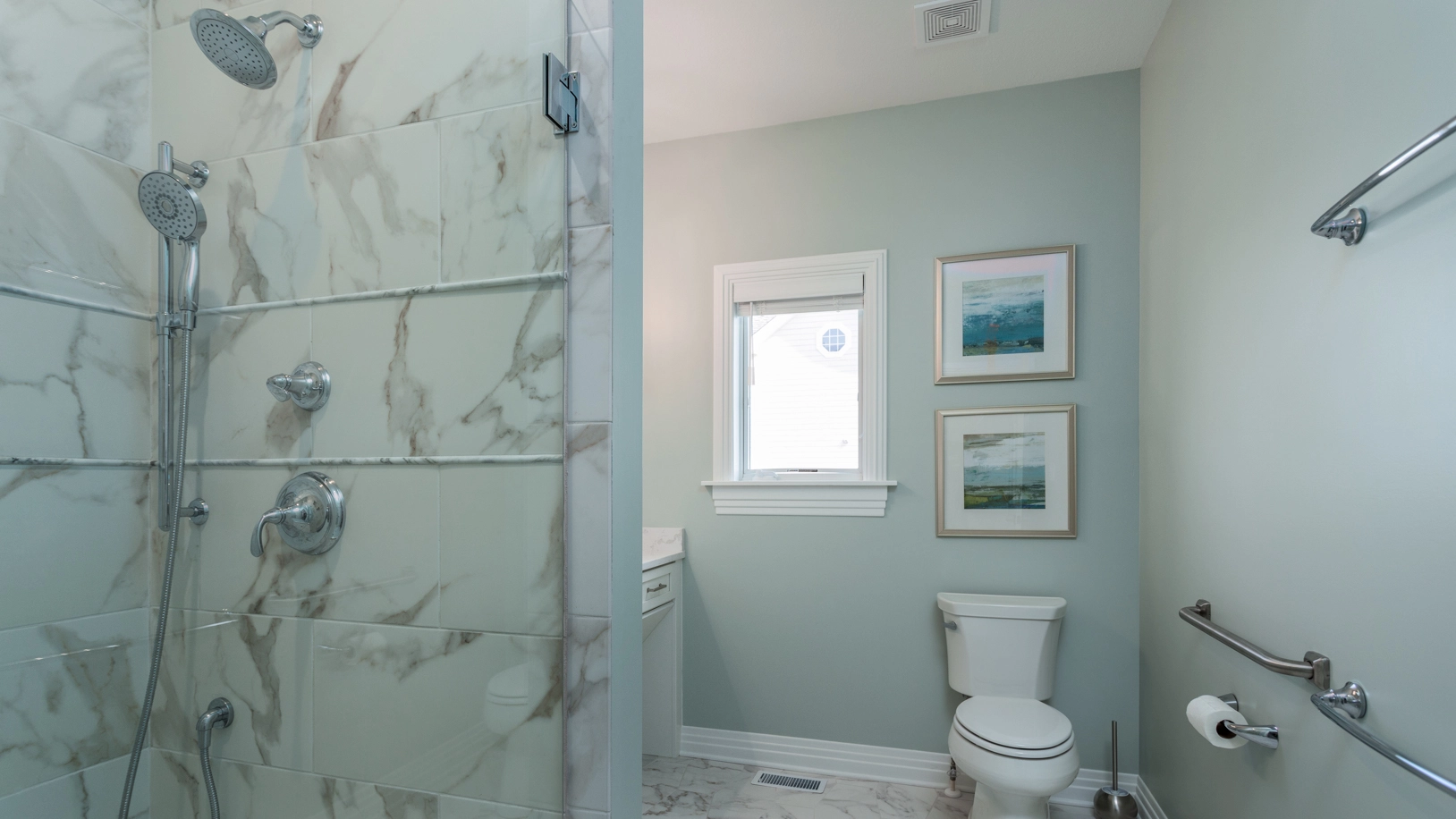 King, Standing shower, with 3" lip, built-in shower seat, hand-held showerhead, Roll under sink, Toilet grab bars, Deck access