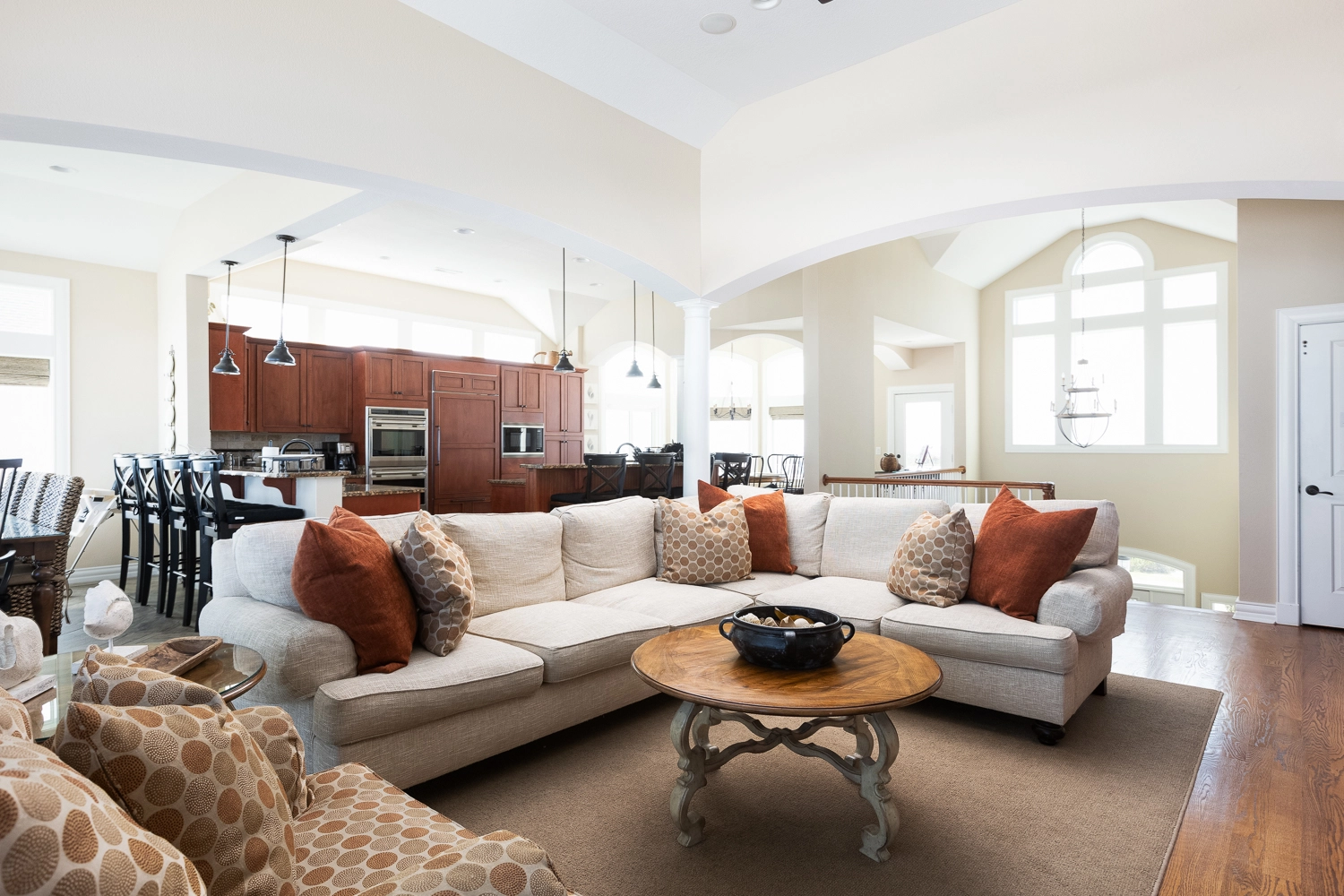 Great room with gas fireplace; kitchen with Wolf and Subzero appliances; dining area; breakfast area.