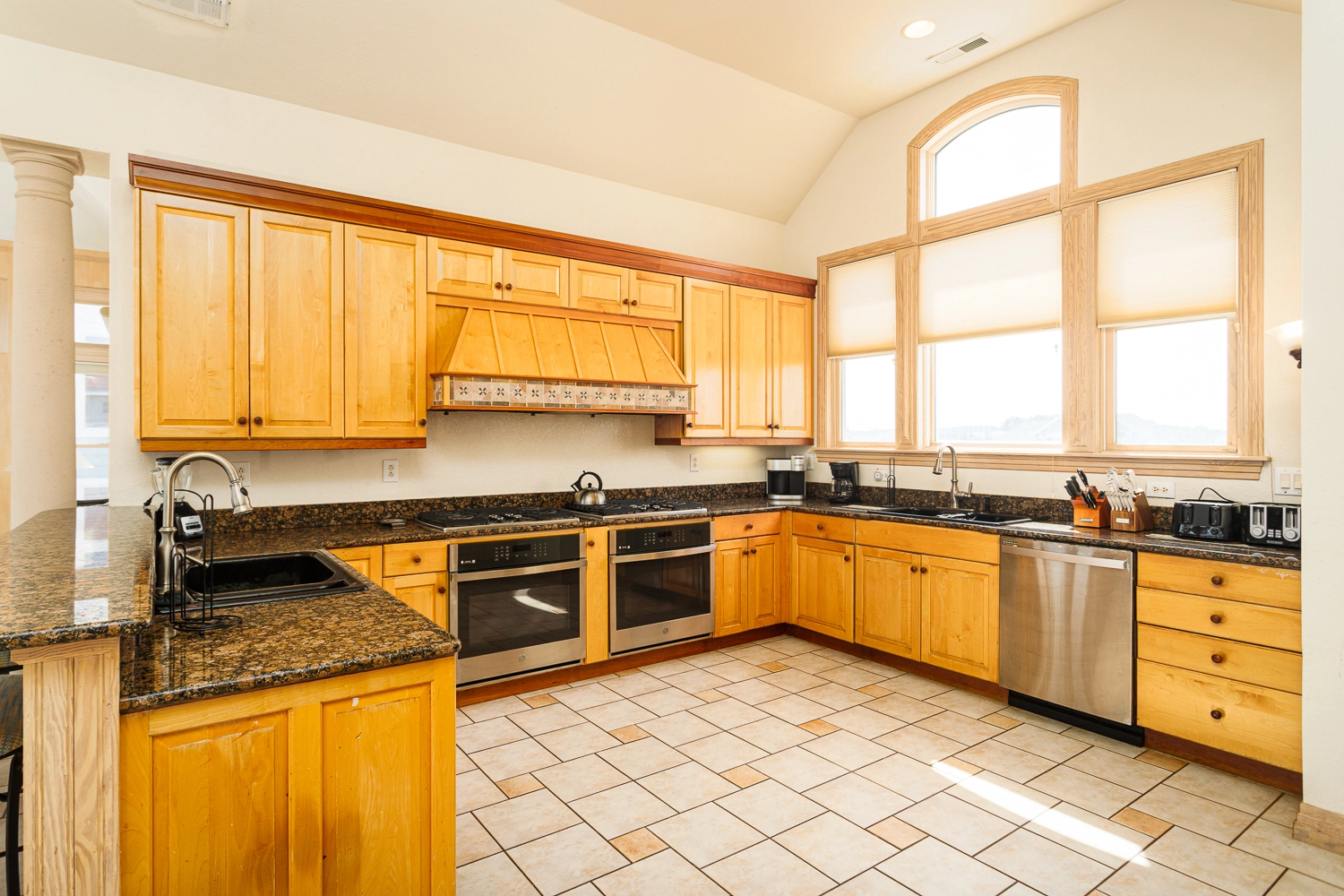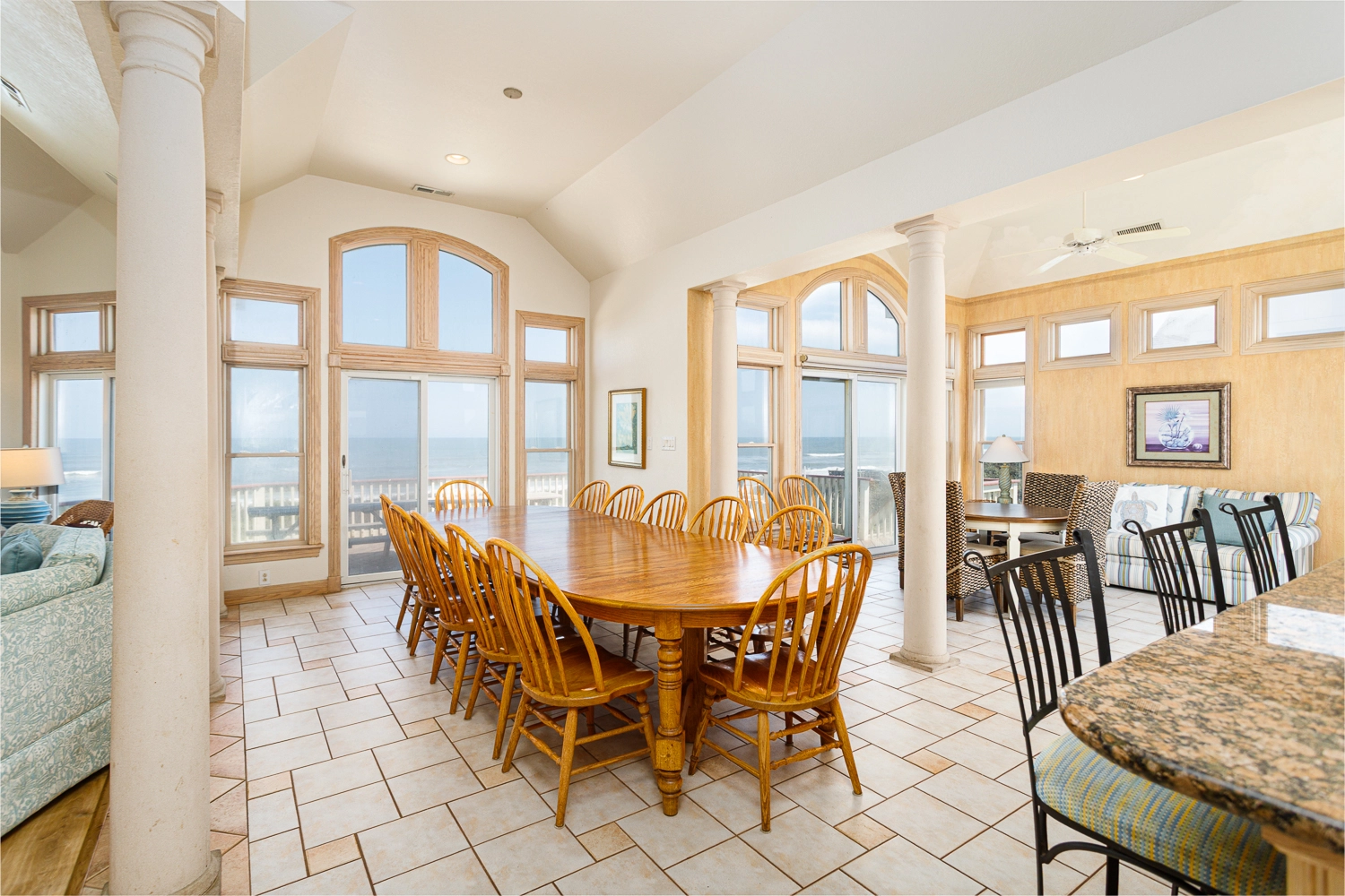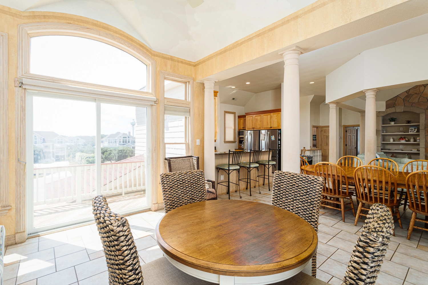 Great room with gas fireplace; kitchen; dining area; sitting area.
