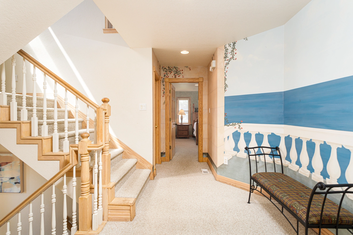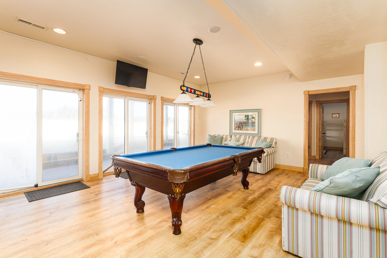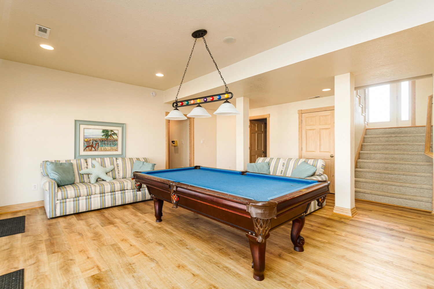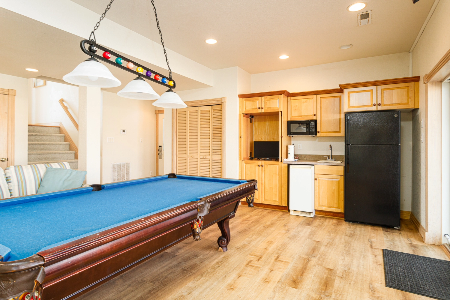 Rec room with pool table, and wet bar with refrigerator; laundry.