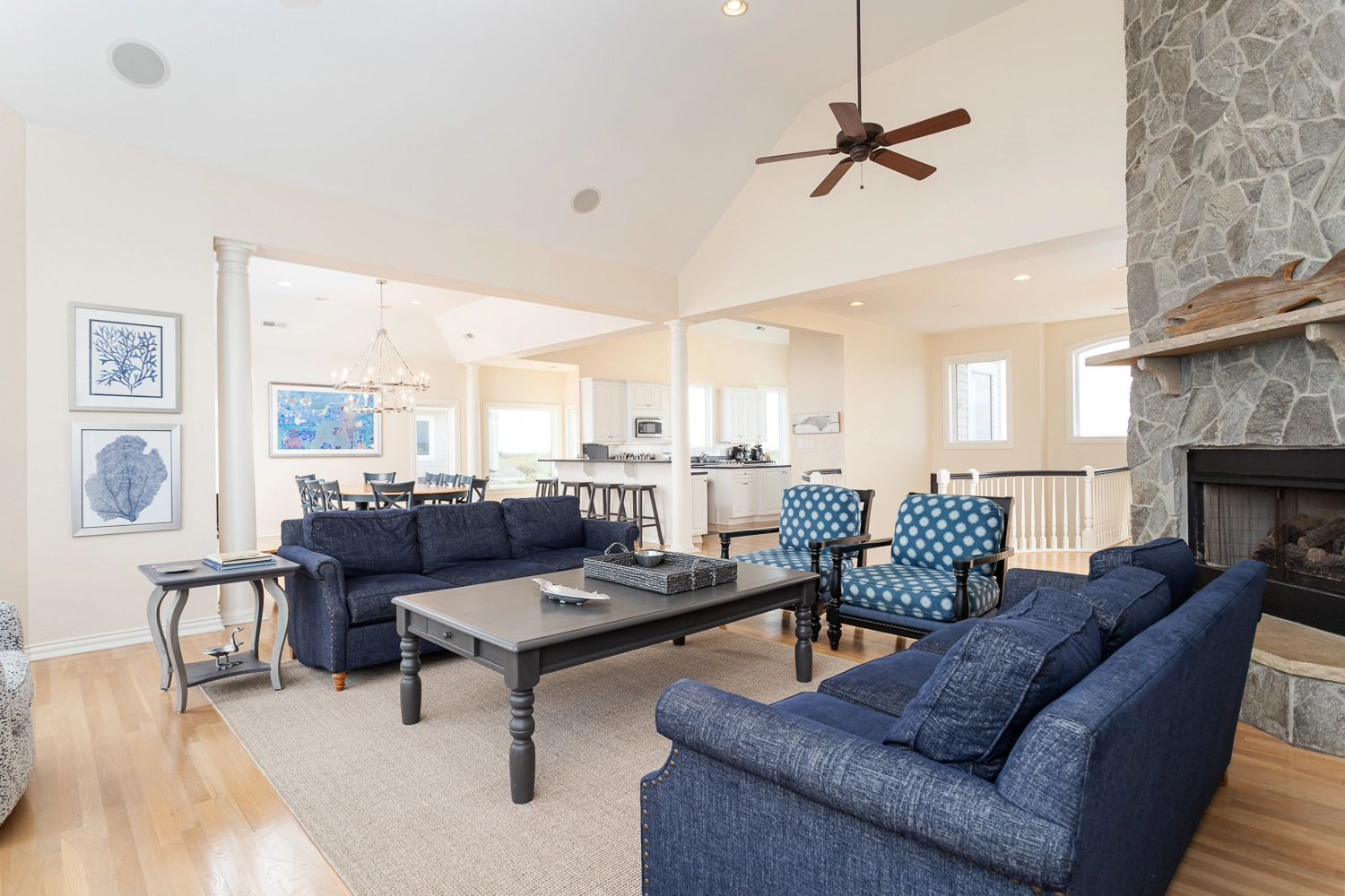 Central great room with Smart TV, home theatre system and stone gas fireplace; kitchen with professional double ovens, two dishwashers, and 6 burner Viking cooktop; breakfast room; dining area.