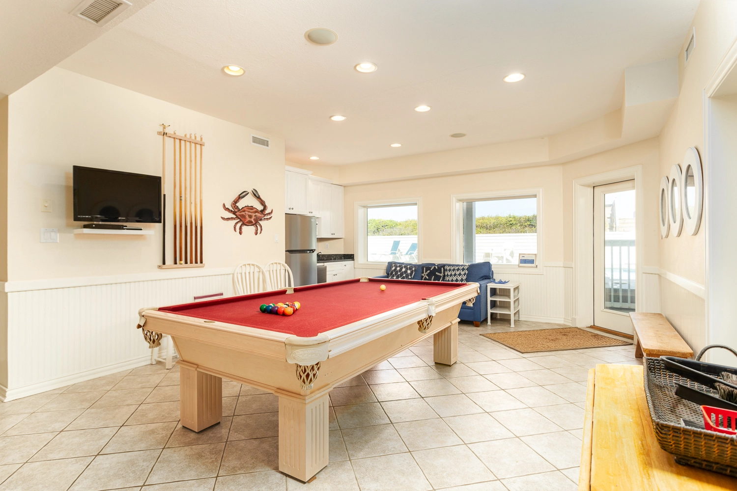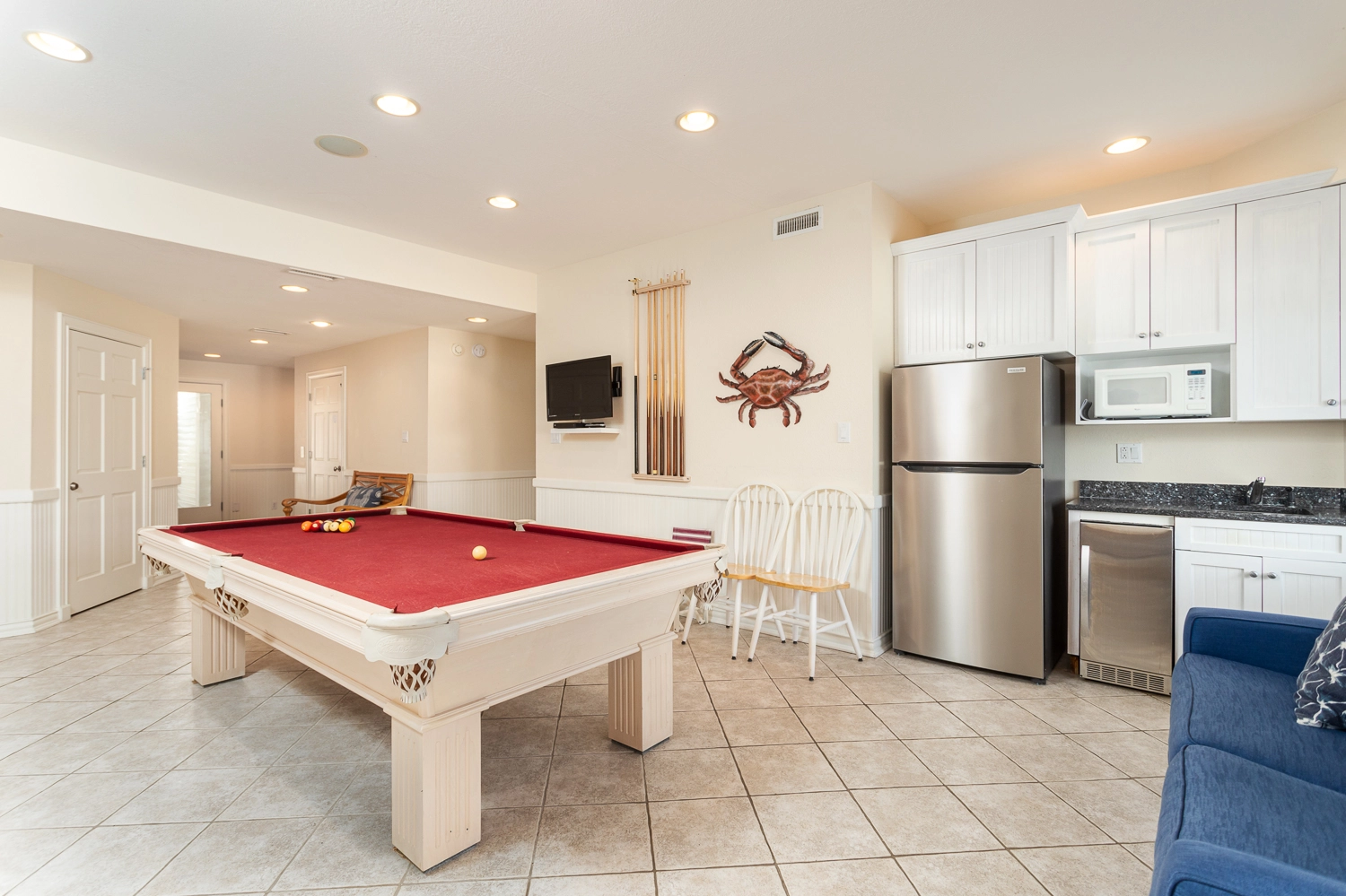Rec room (QSS) with pool table and kitchenette; gated patio with optionally-heated pool and hot tub.