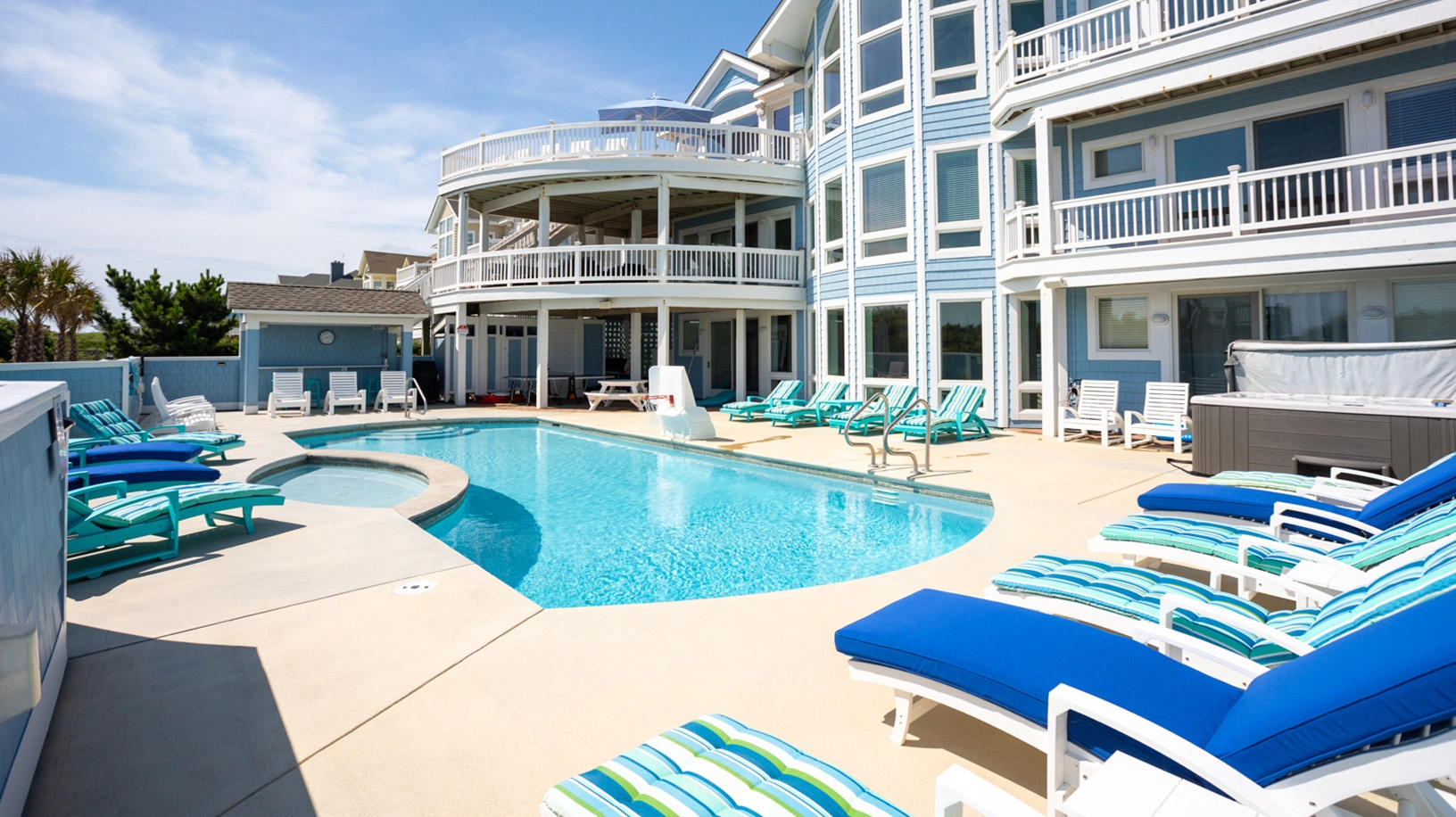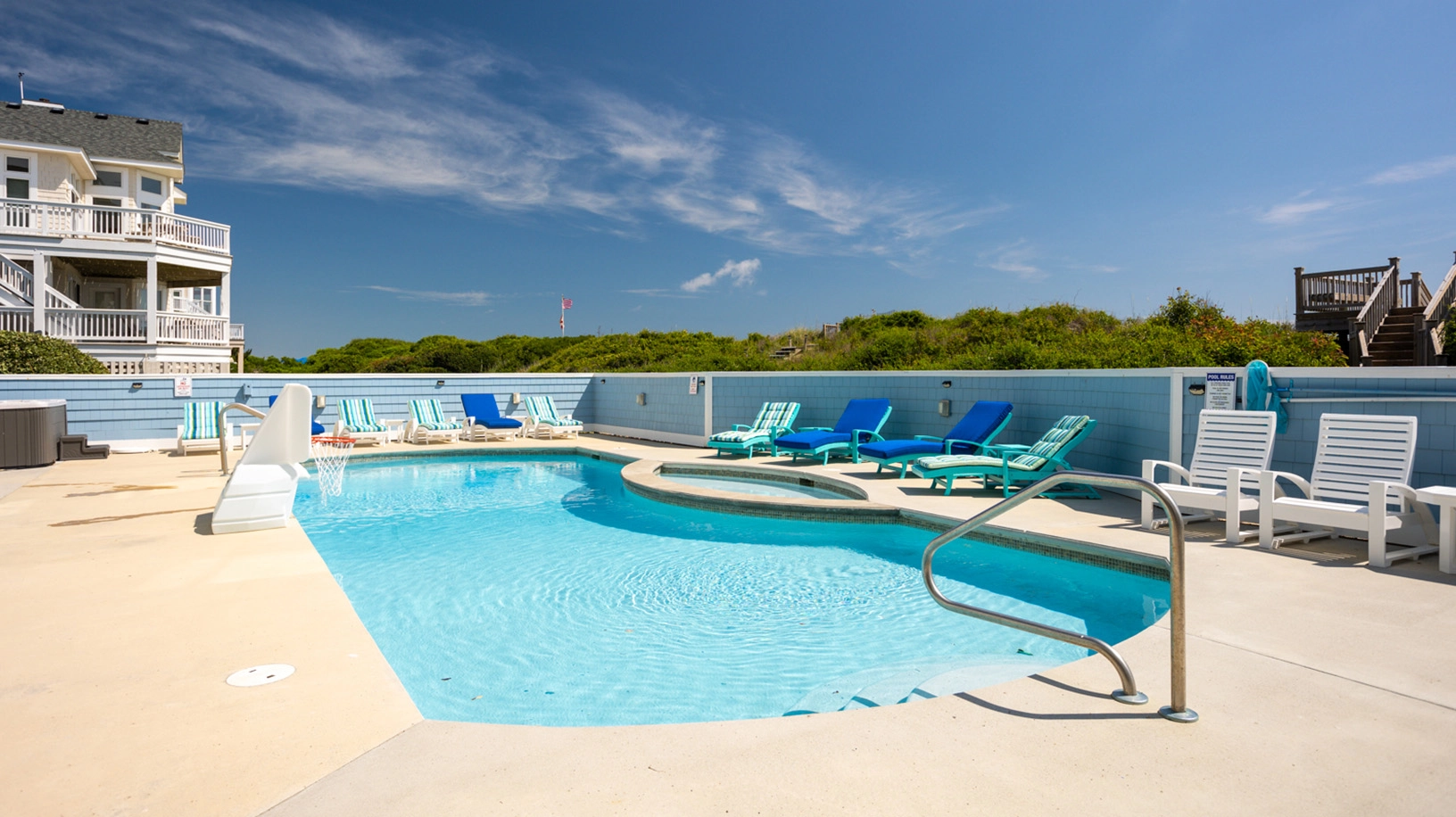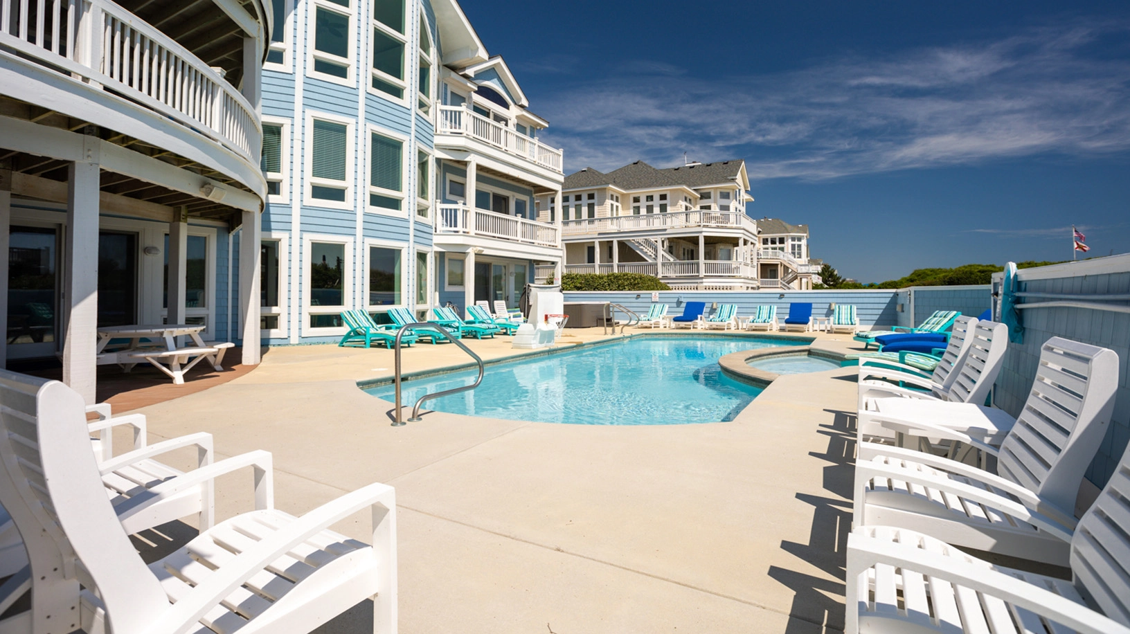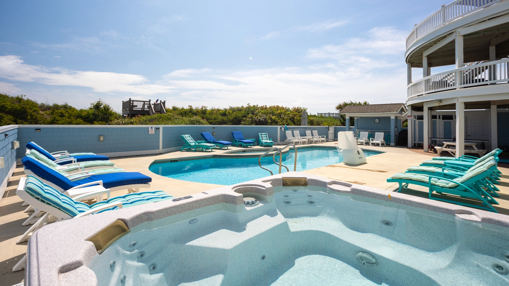 "We loved everything! The house was well appointed (e.g. the multi colored dishes matched the multi colored pool furniture), the master bedrooms afforded most with an ocean or sound view as well as balconies. The layout of the bedrooms also maximized occupant privacy having bathrooms, a theatre room or space separating one from another.The top level provided two dining sets creating the perfect ocean and sound views. The ship watch was perfect for assembling puzzles and reading - allowing participants to still be a part of the action on the kitchen level. The couches on the top level and theatre room were ample and comfortable. The kitchen refrigerators, wine cooler, two dishwashers AND an ice maker met our every need for a group of 14 adults.A small touch of having magnetic CLEAN and DIRTY signs on the dishwashers significantly reduced any excuses for certain guests not to clean up after themselves and put dirty dishes in the dishwasher versus the sink! LOL The pool layout provided opportunity for all to chat whether we were in the pool, hot tub or lounging in the lounge chairs."