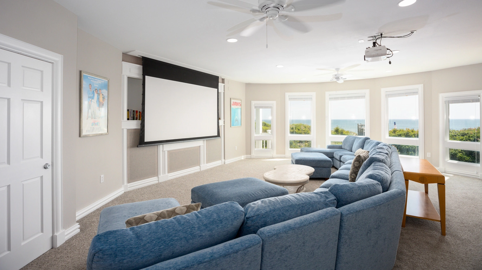 "Large main room, huge leather couch, view of ocean and sound, sauna, bathrooms were lovely, well stocked kitchen with high quality dishes, beach service, media room, billiard equipment high quality, video game center, deck furniture high quality,"