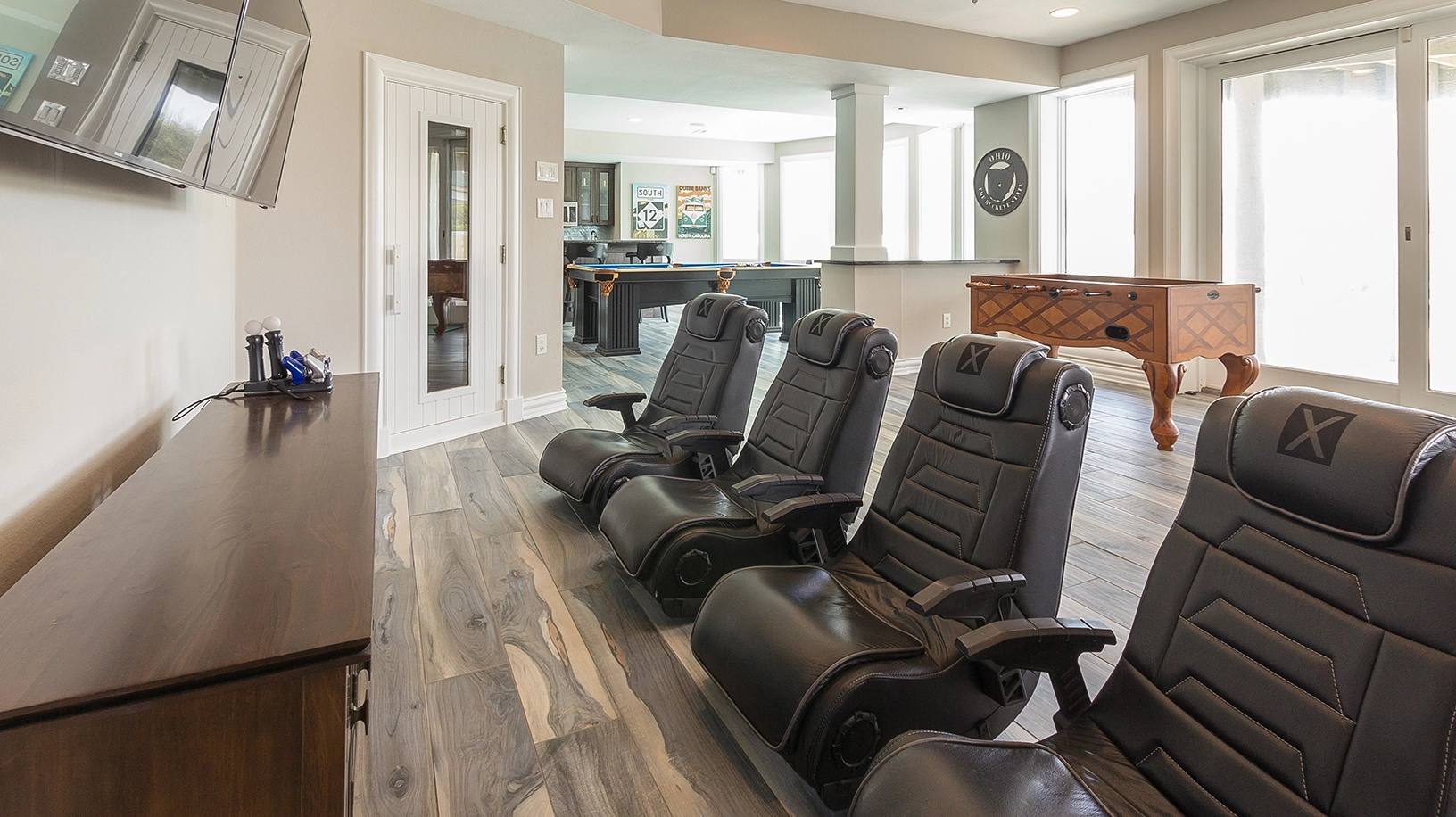 Rec room with pool table, foosball, and kitchenette; office; sauna.