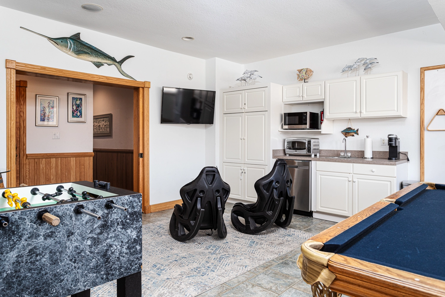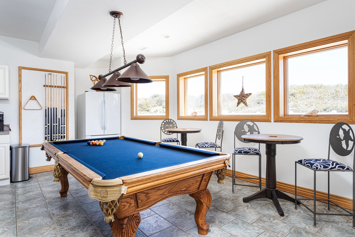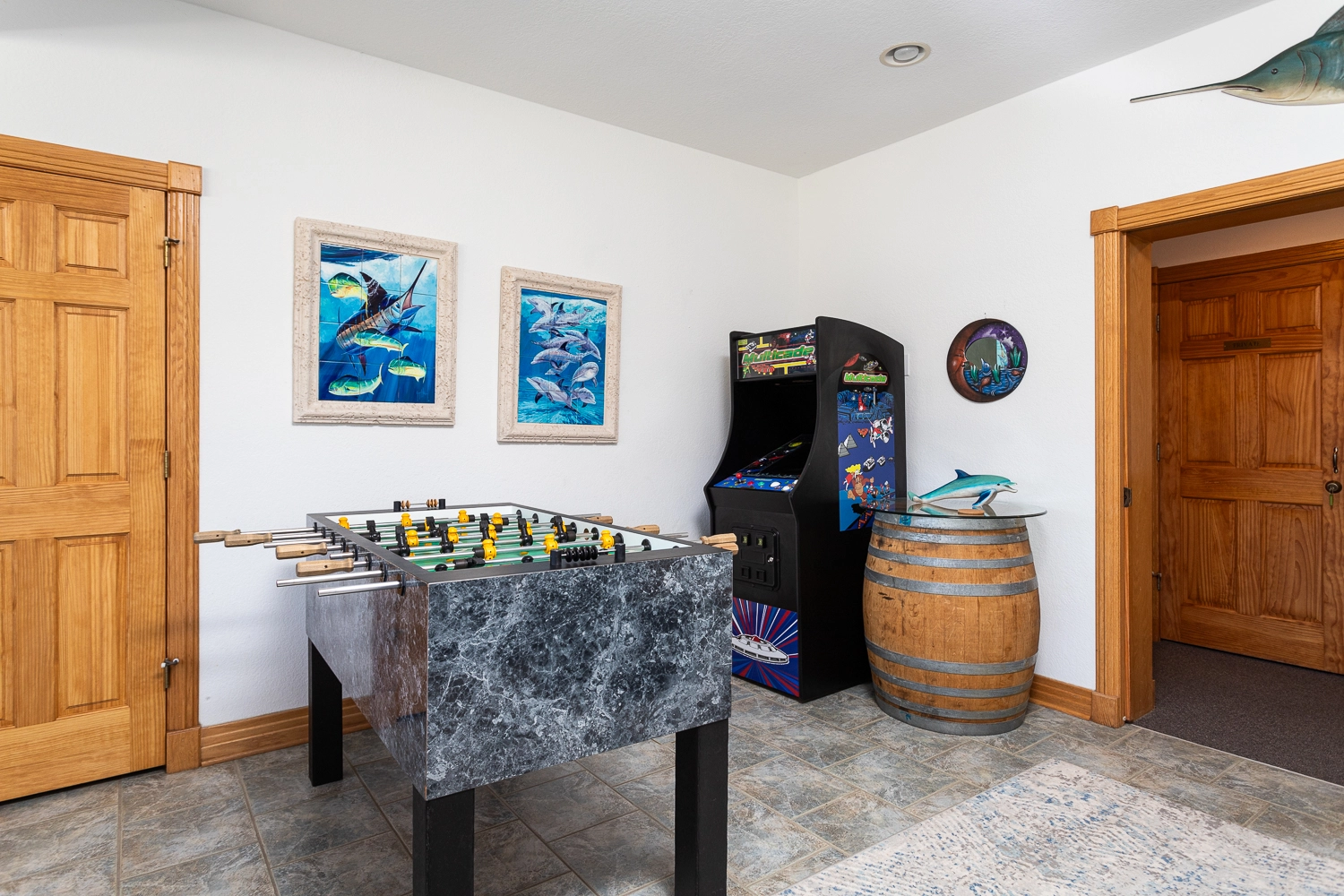 Rec room with pool table, foosball, arcade game and refrigerator; laundry; garage with ping pong.